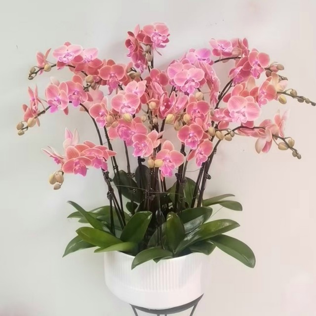花材:橘粉色唯美蝴蝶兰8株,类似白色雅致花器!