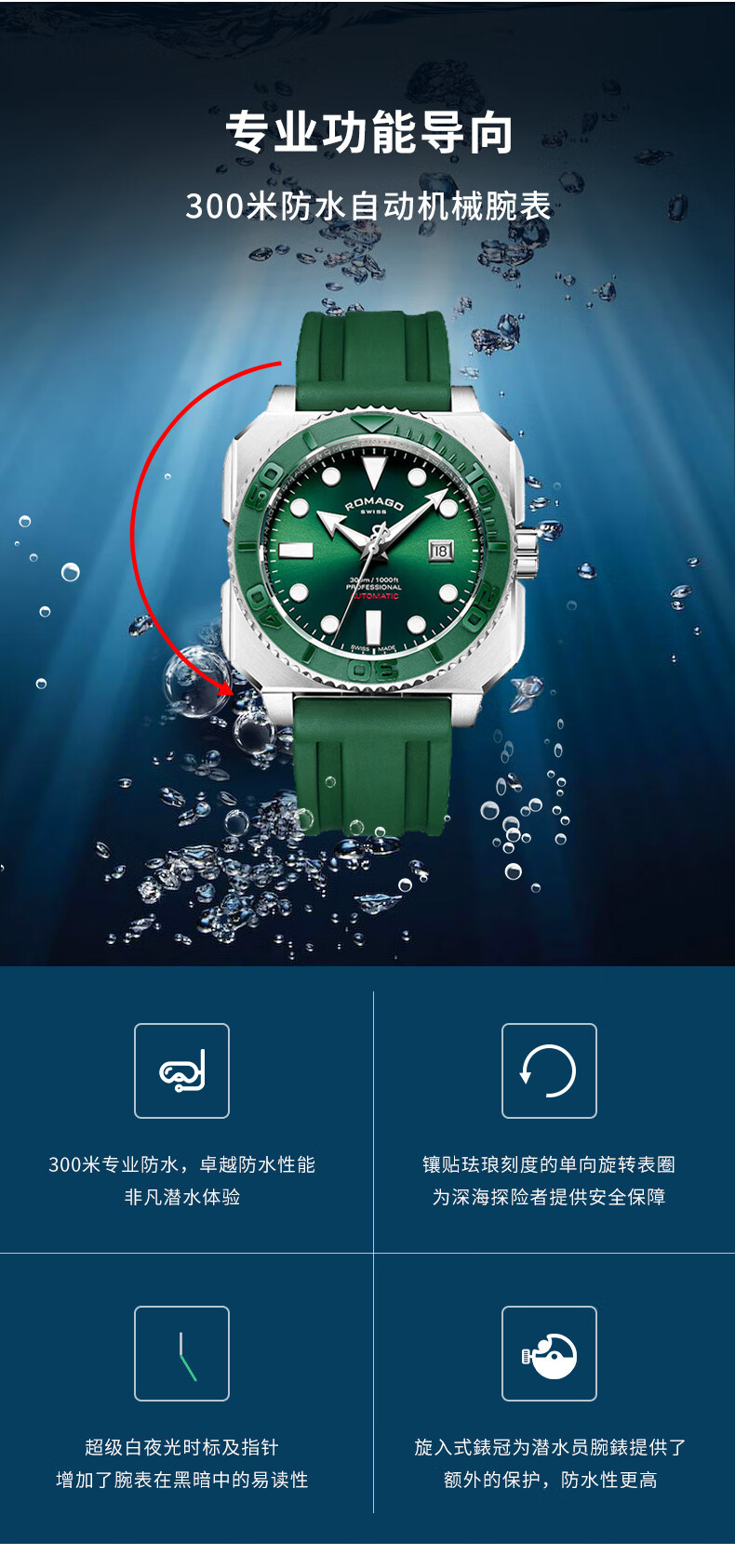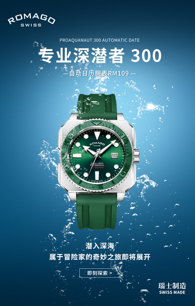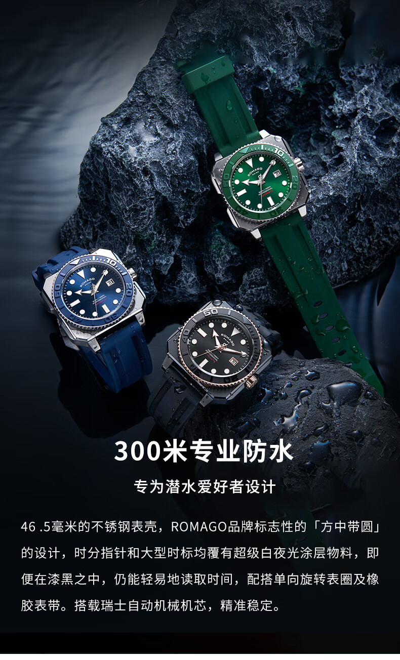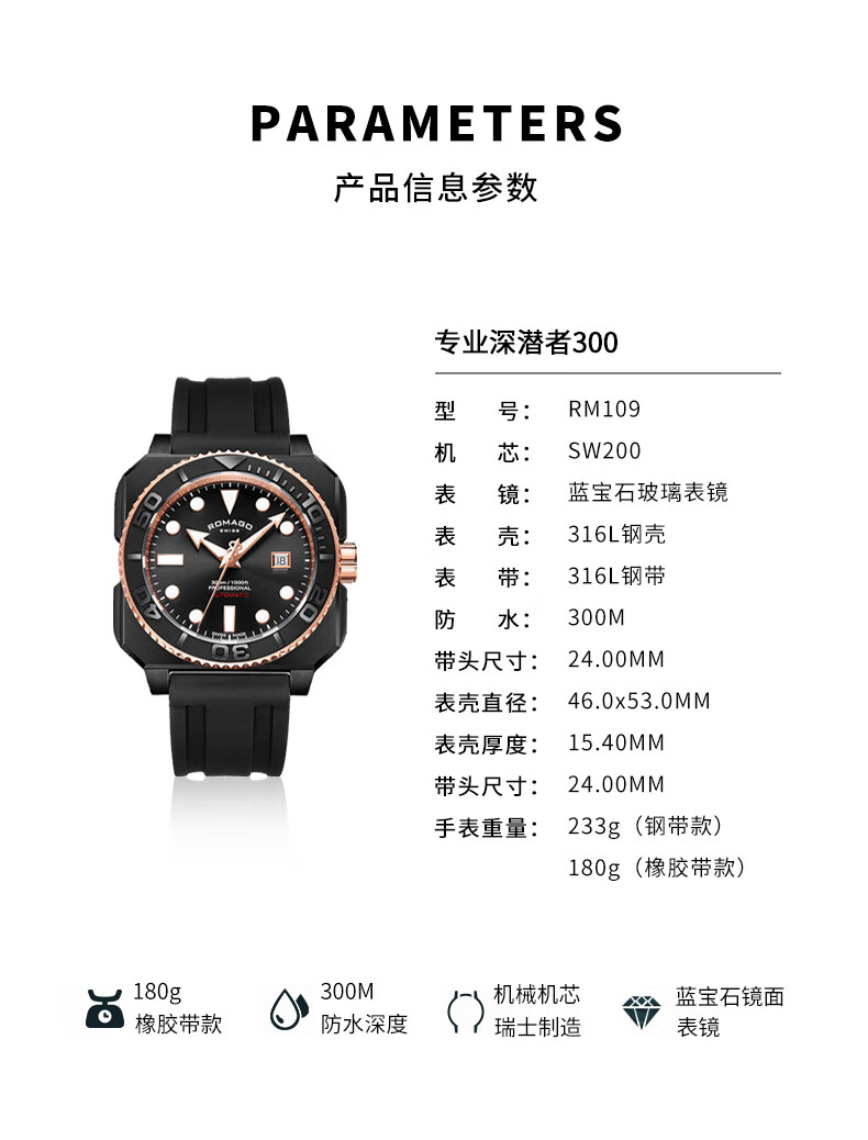 Romago SWISS 专业深潜者300系列腕表 黑色 RM109-BKBK