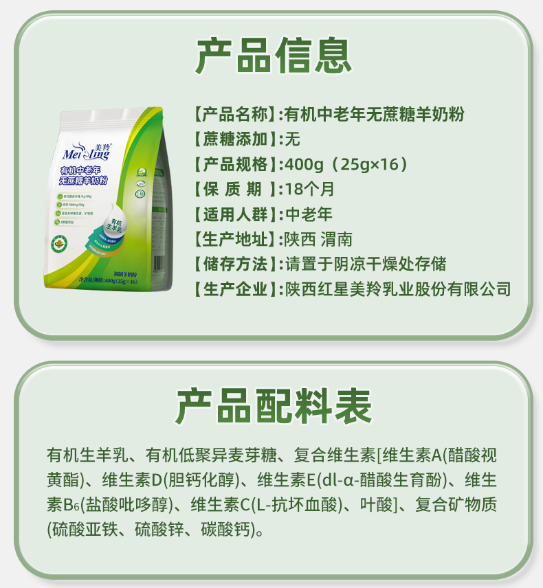 【新品上市】有机中老年无蔗糖羊奶粉400g