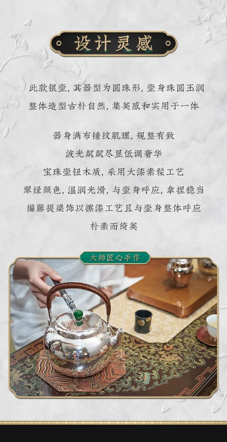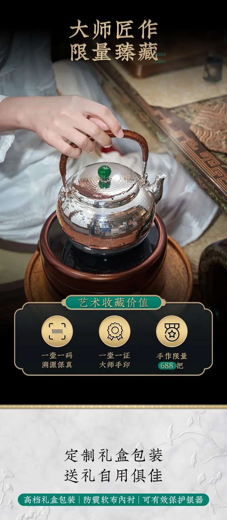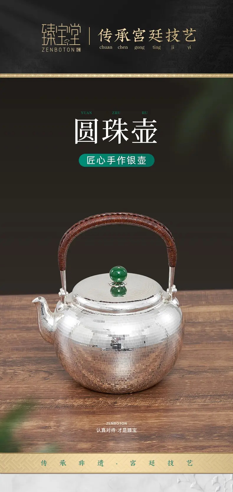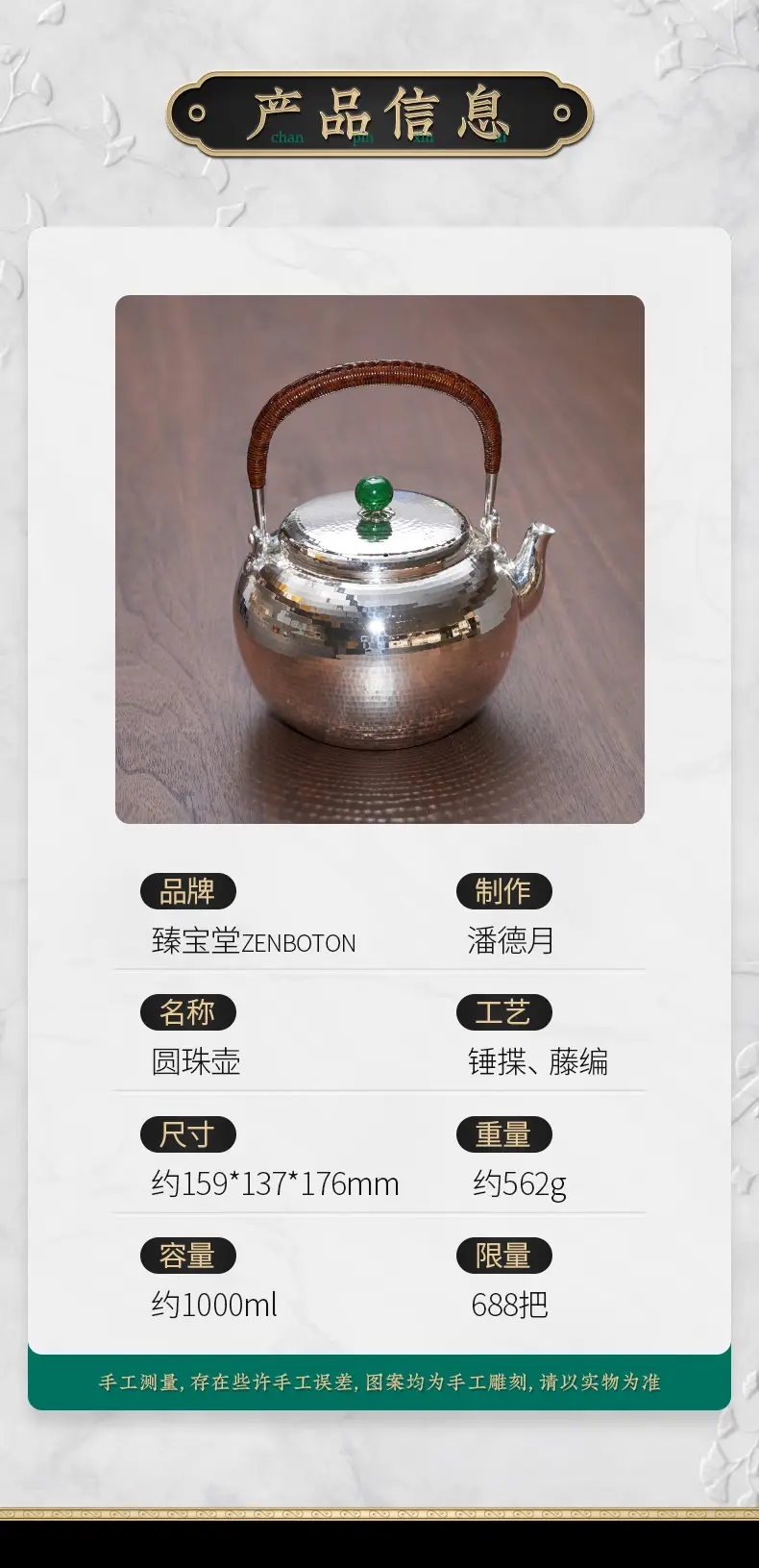 臻宝堂-圆珠壶(1000ml)臻宝堂银壶纯银9999烧水壶纯手工煮茶壶高端茶具足银养生泡茶水壶中式 圆珠壶.重约562克 容量约1000ml