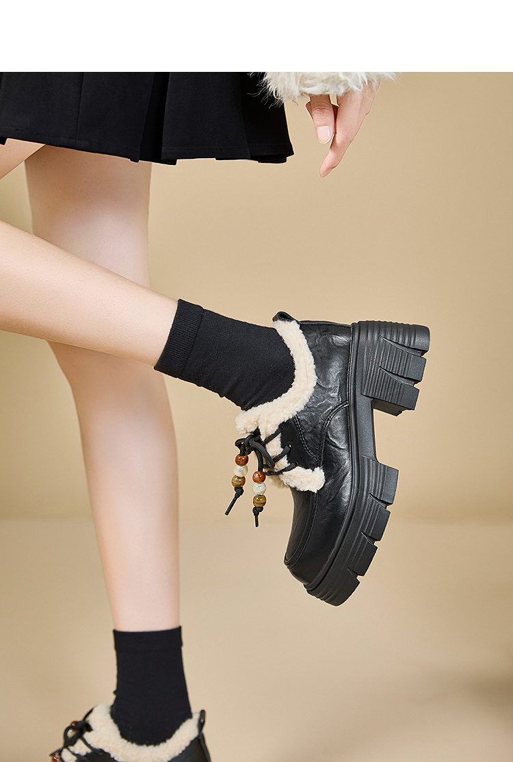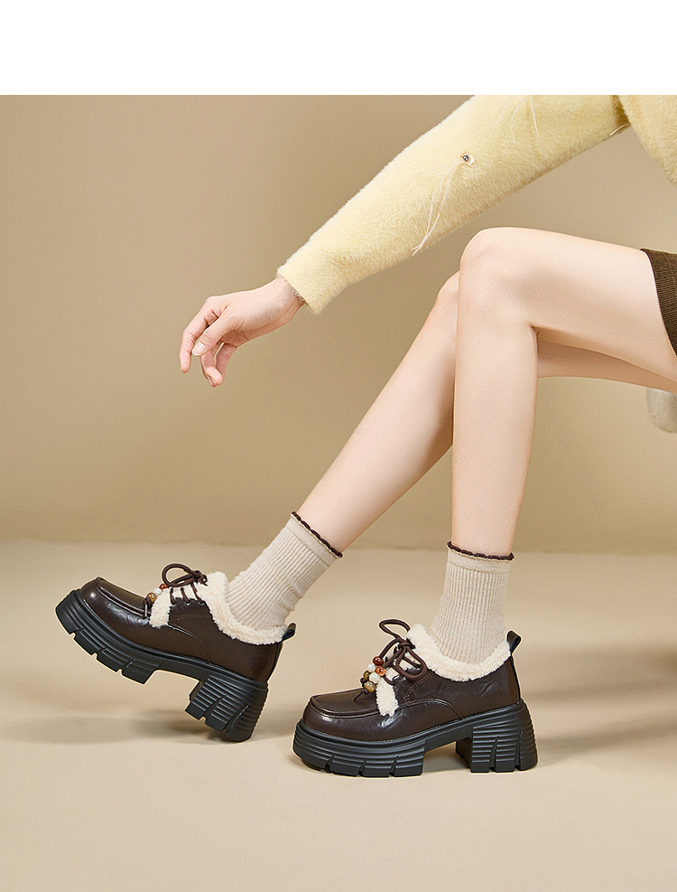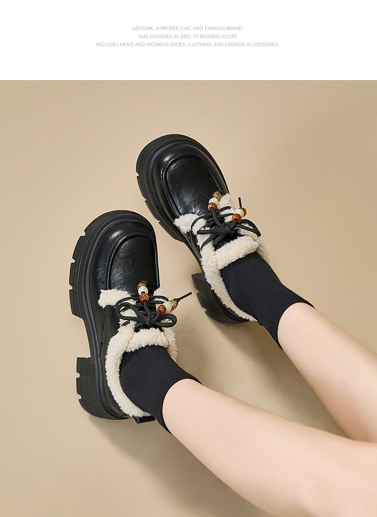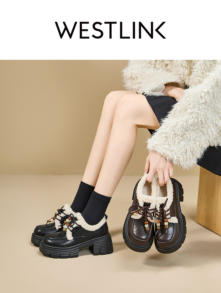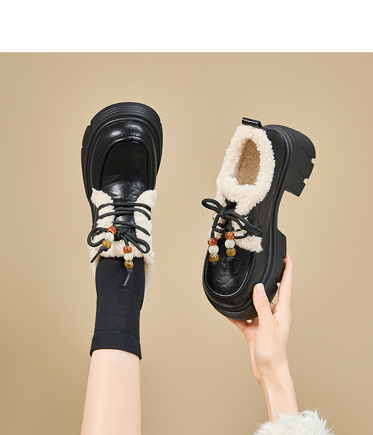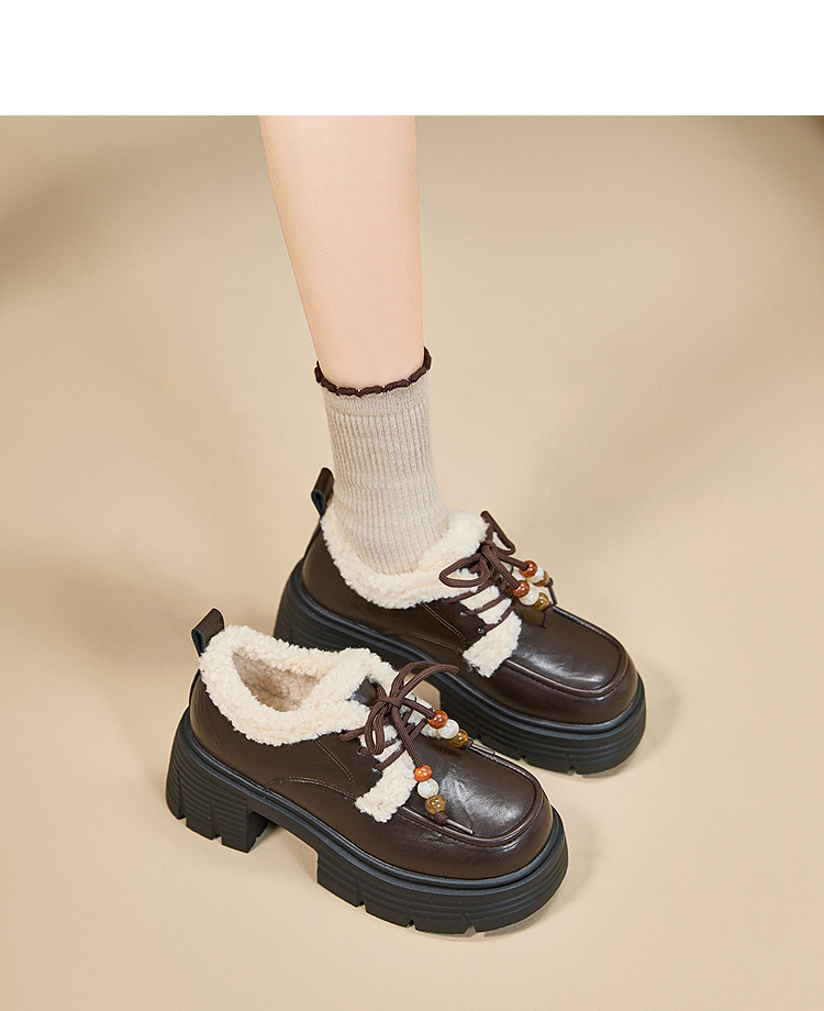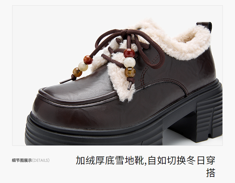 西遇厚底加绒乐福鞋女新款冬季外穿复古保暖棉鞋子系带小皮鞋V2457353