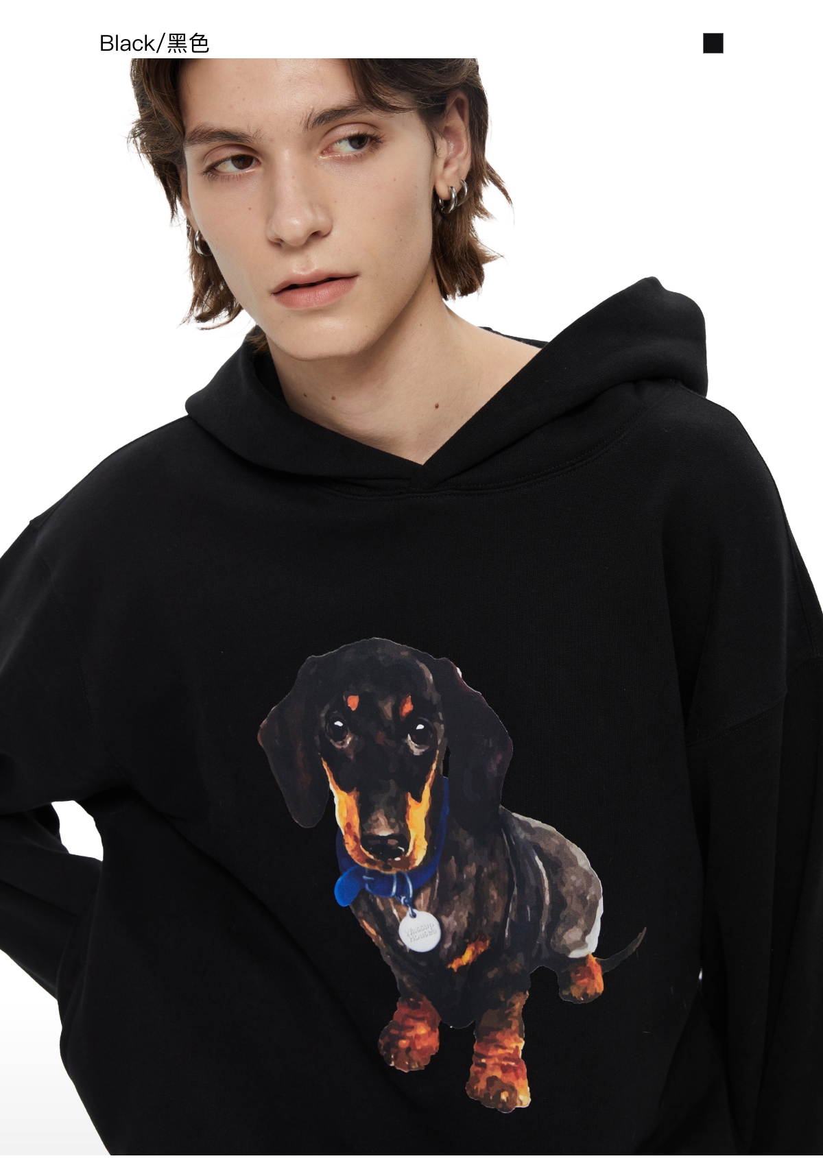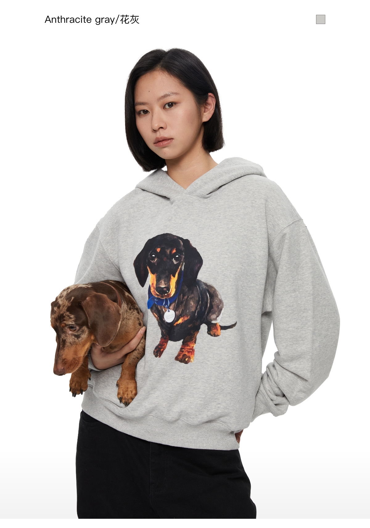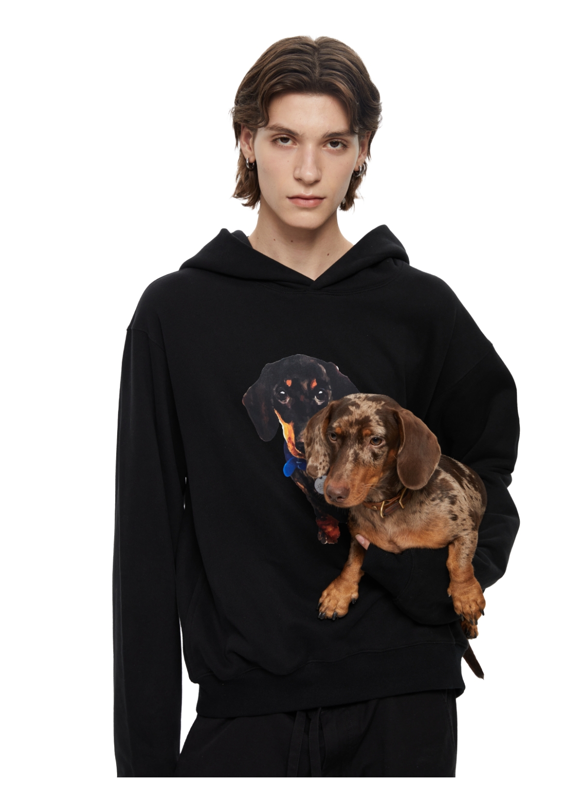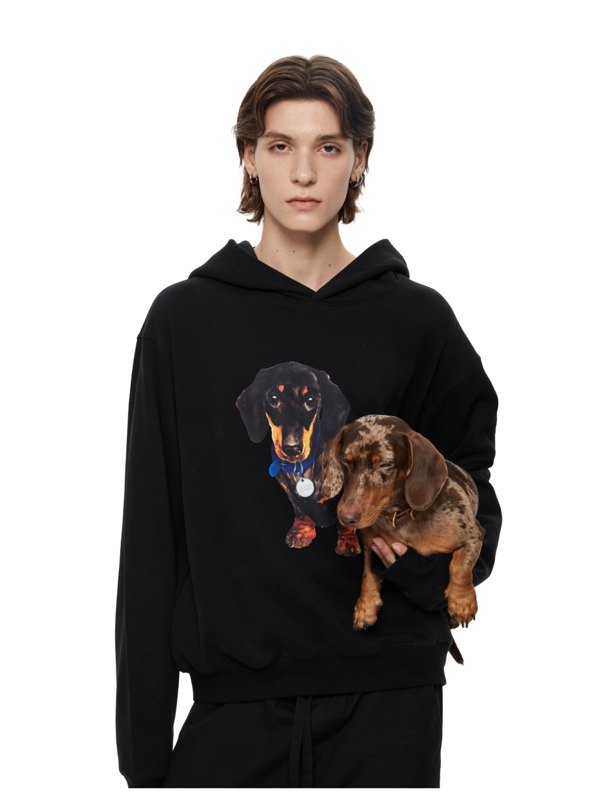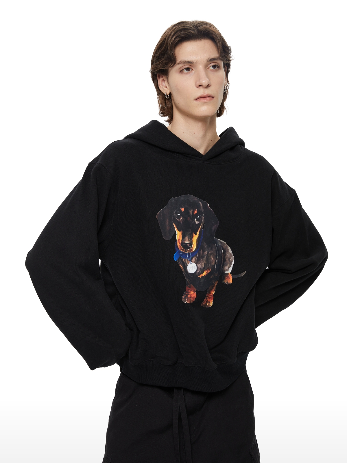 WassupHouse银牌狗狗印花插袋短宽连帽卫衣