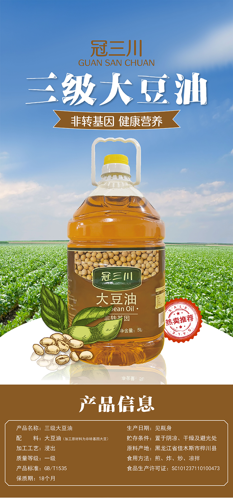 冠三川三级大豆油(非转基因)5L/桶*1