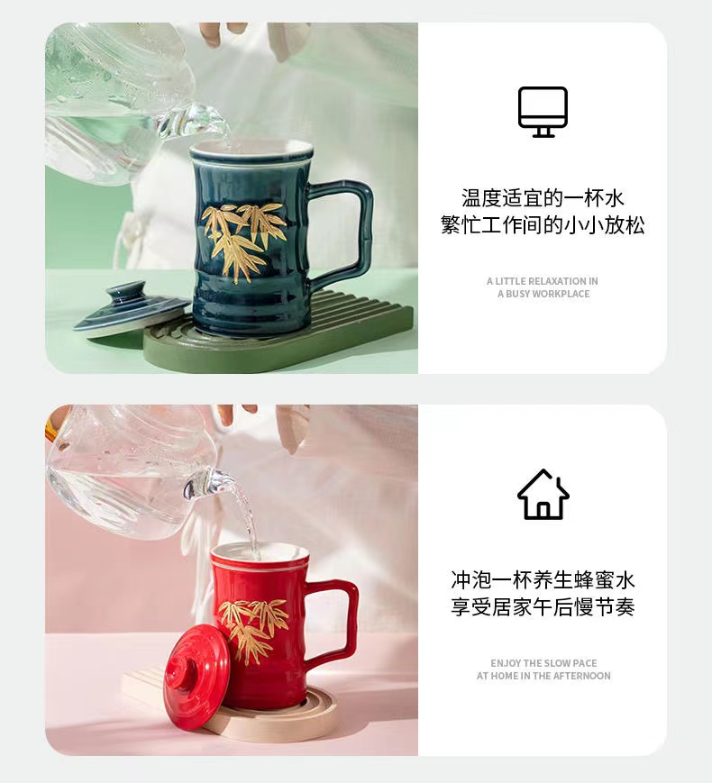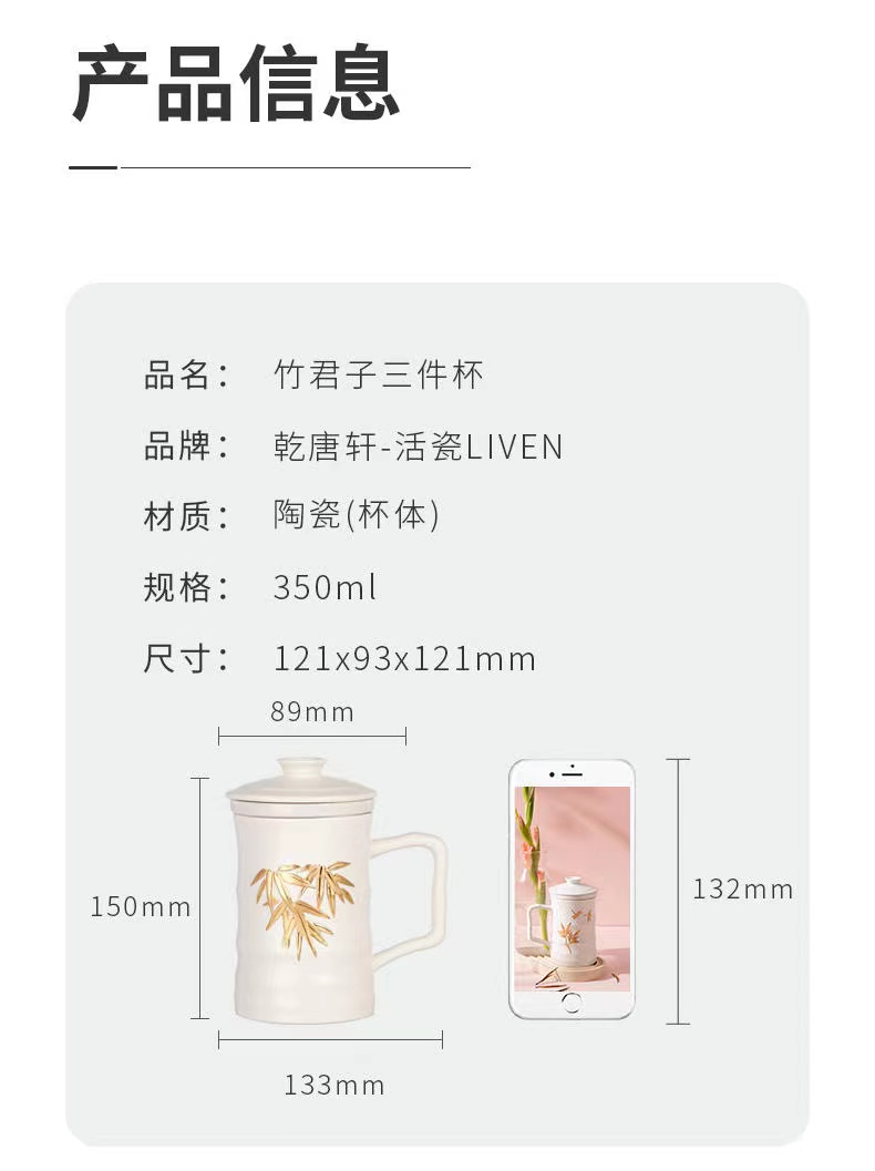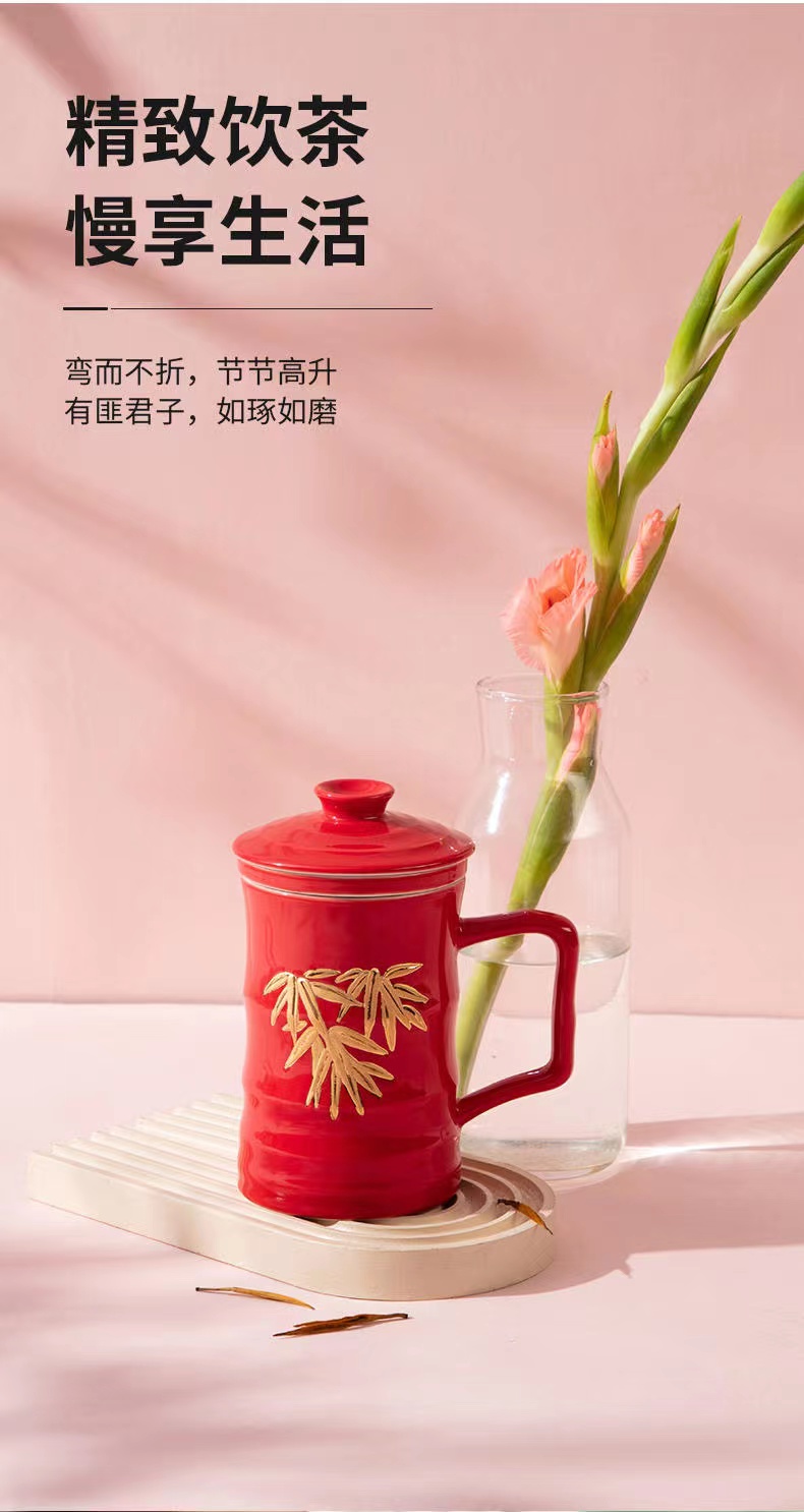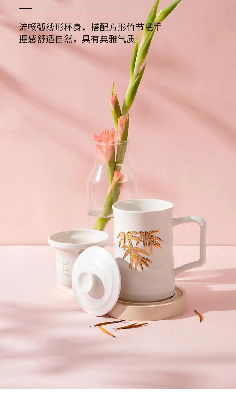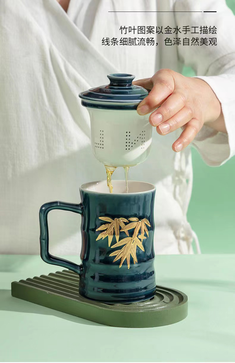 乾唐轩活瓷杯竹节三件杯带茶漏带手柄泡茶杯办公杯带盖陶瓷杯