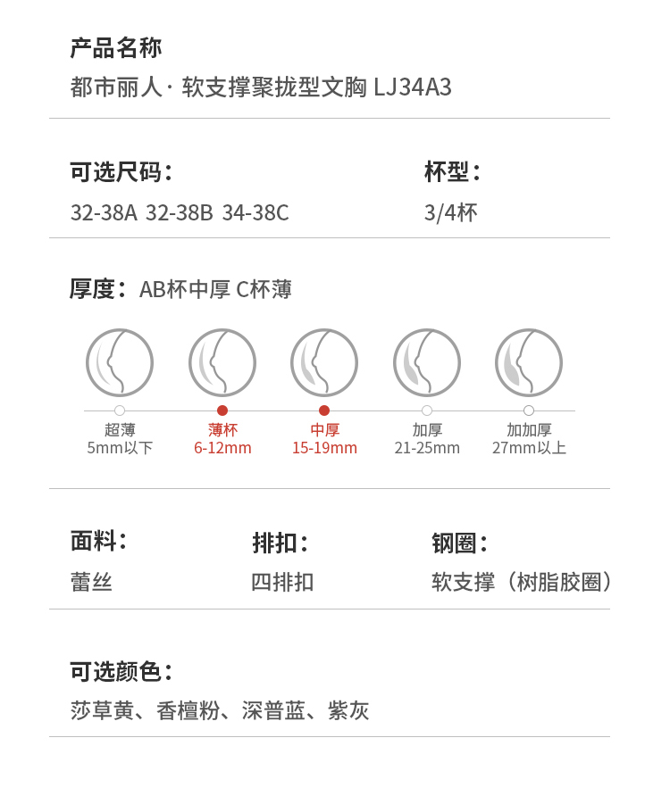 都市丽人舒软挺塑调整型内衣AB:中厚C:薄3/4杯蕾丝塑身文胸四排树脂胶圈LJ34A3