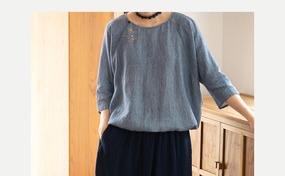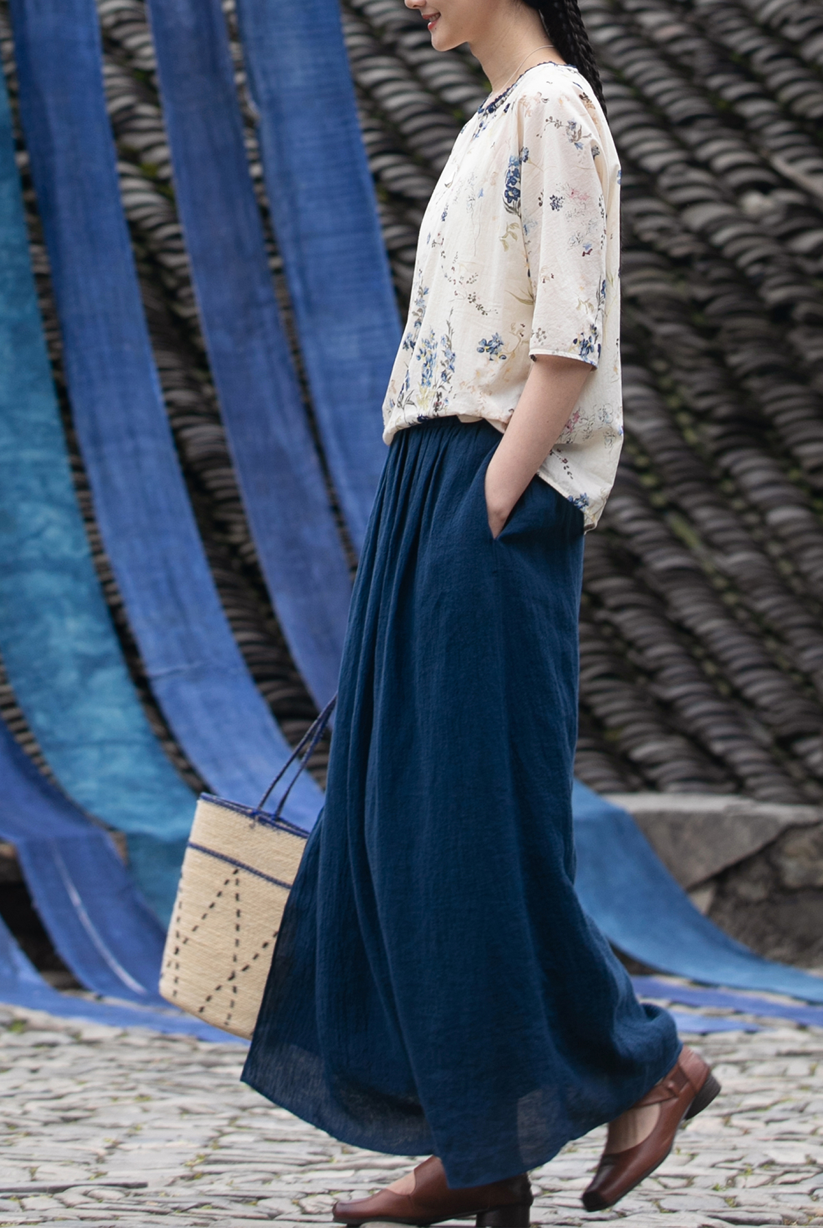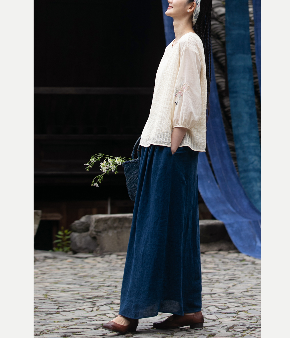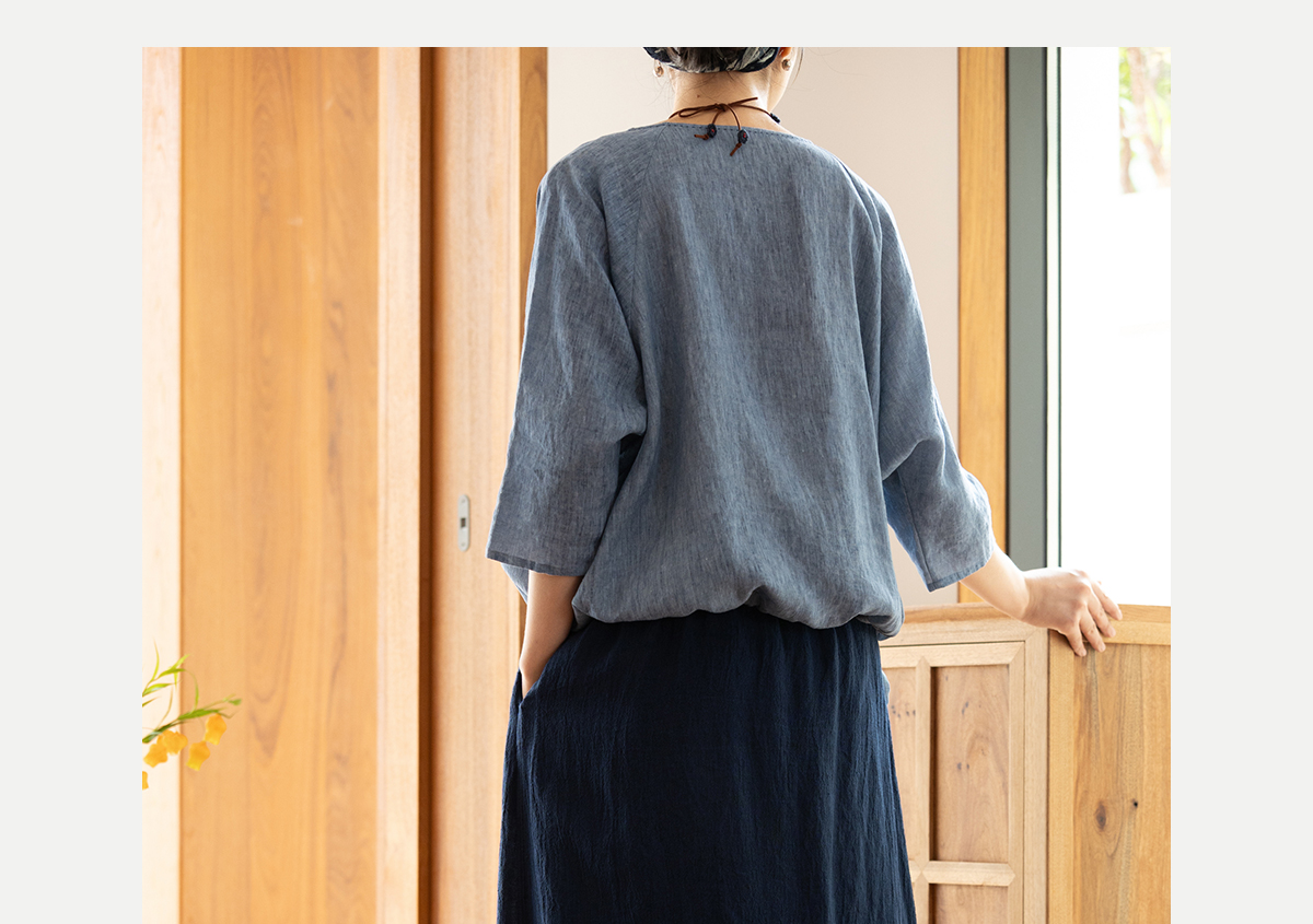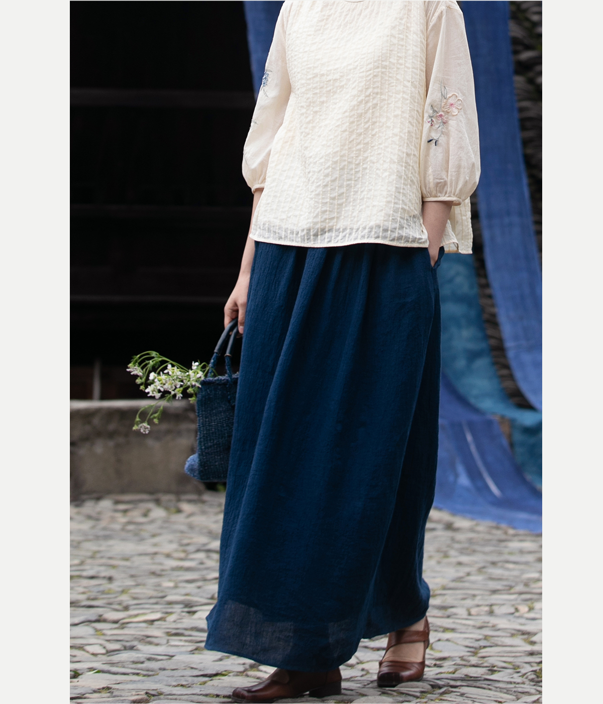 牧衣游原创 亚麻半身裙夏新款轻薄开叉百搭宽松蓝色A字半裙 清味