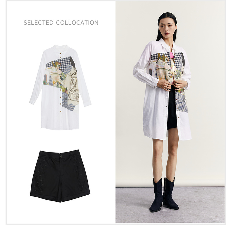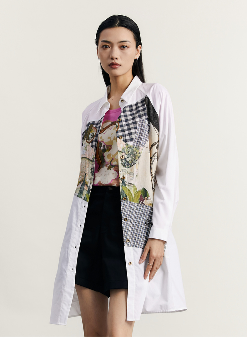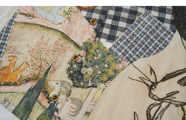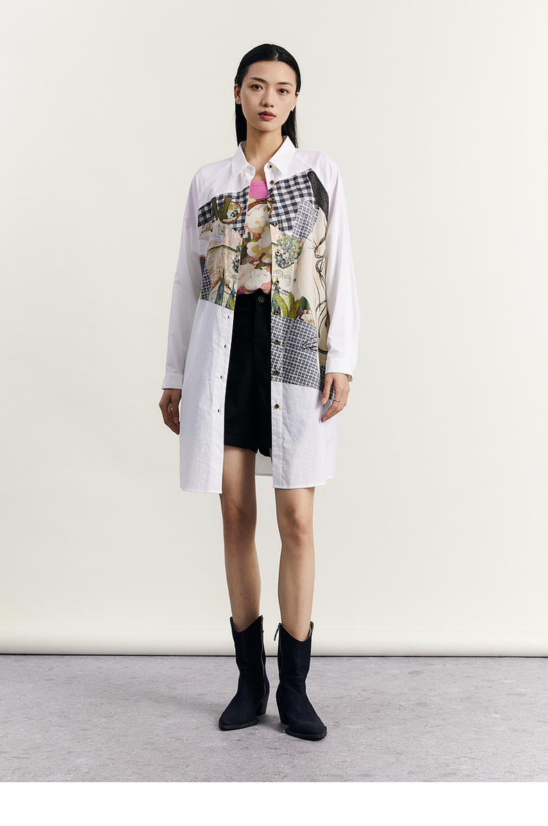 谜底宽松拼接连衣裙长袖2023秋新款复古文艺印花中长裙233ML1107