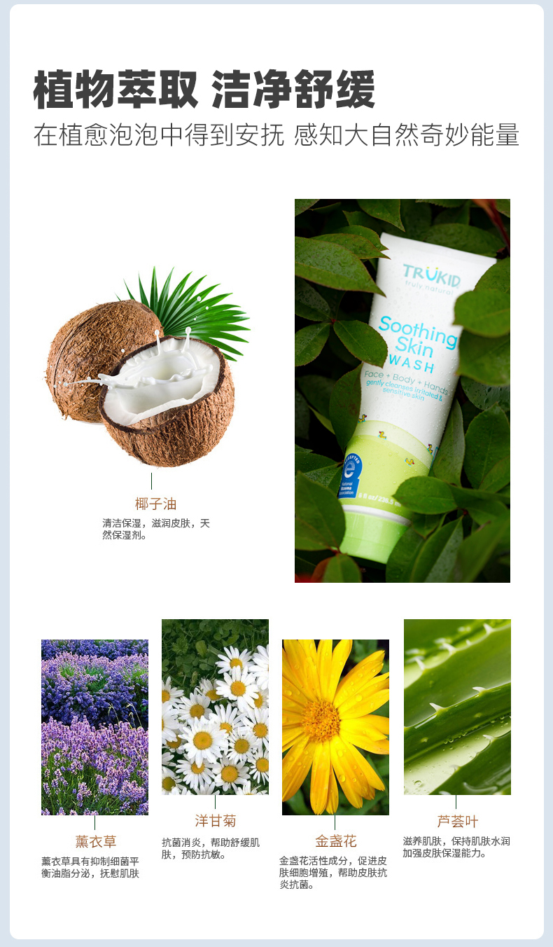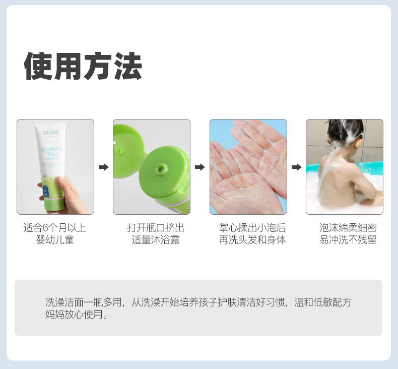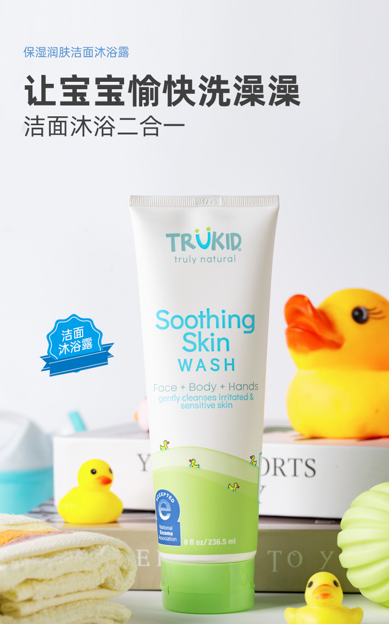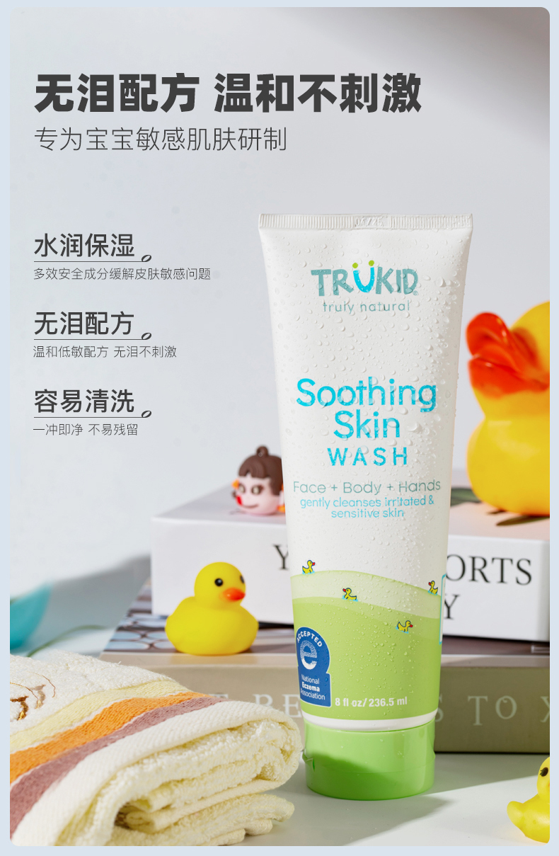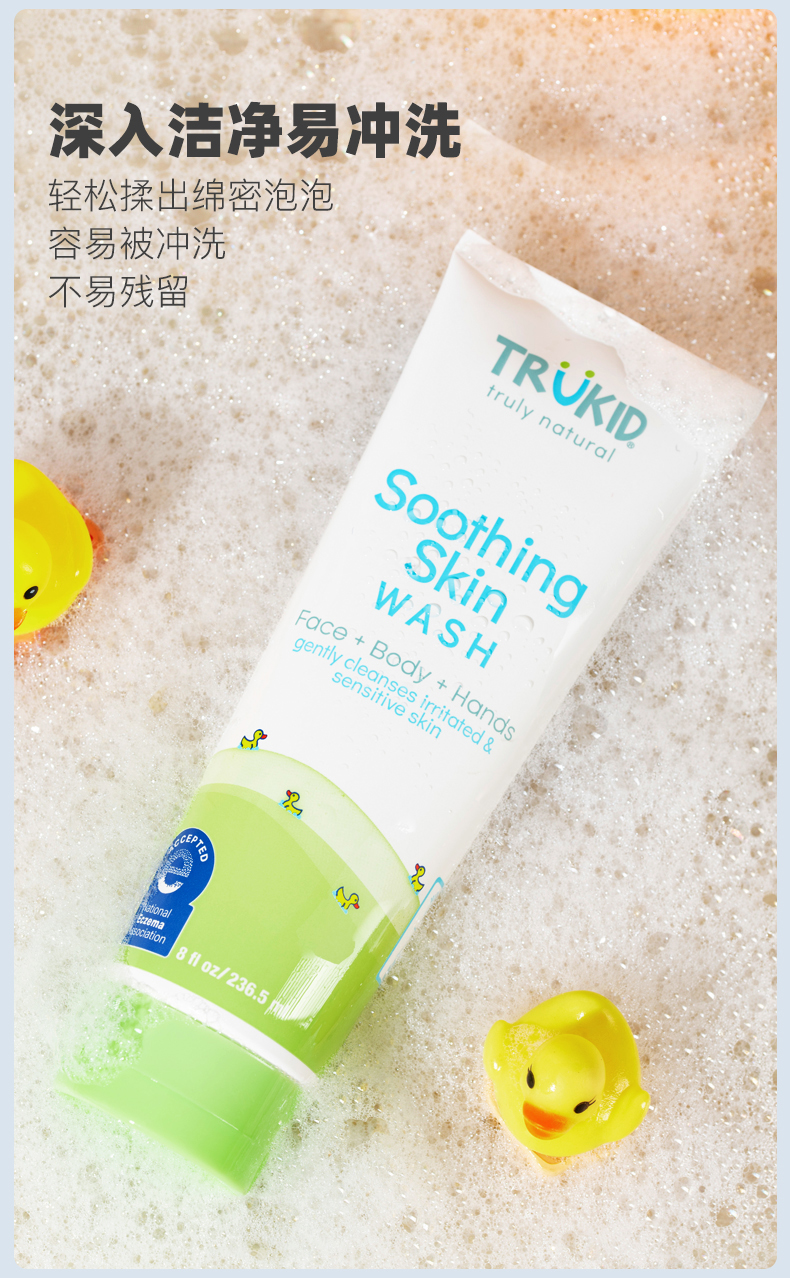 TruKid湿疹舒缓保湿润肤洁面沐浴露就是为解决s疹、敏感肌儿童的清洁问题而专门研制的。