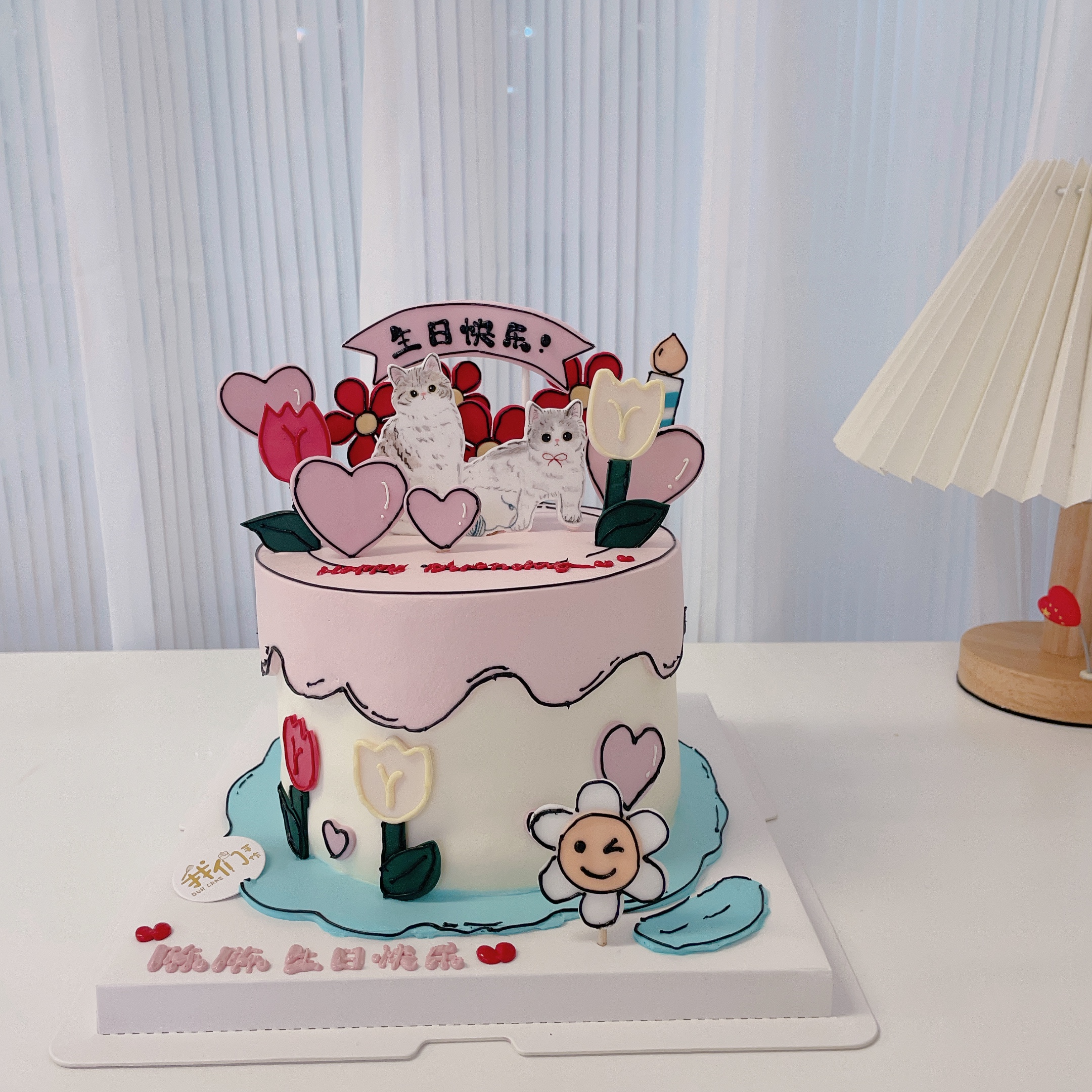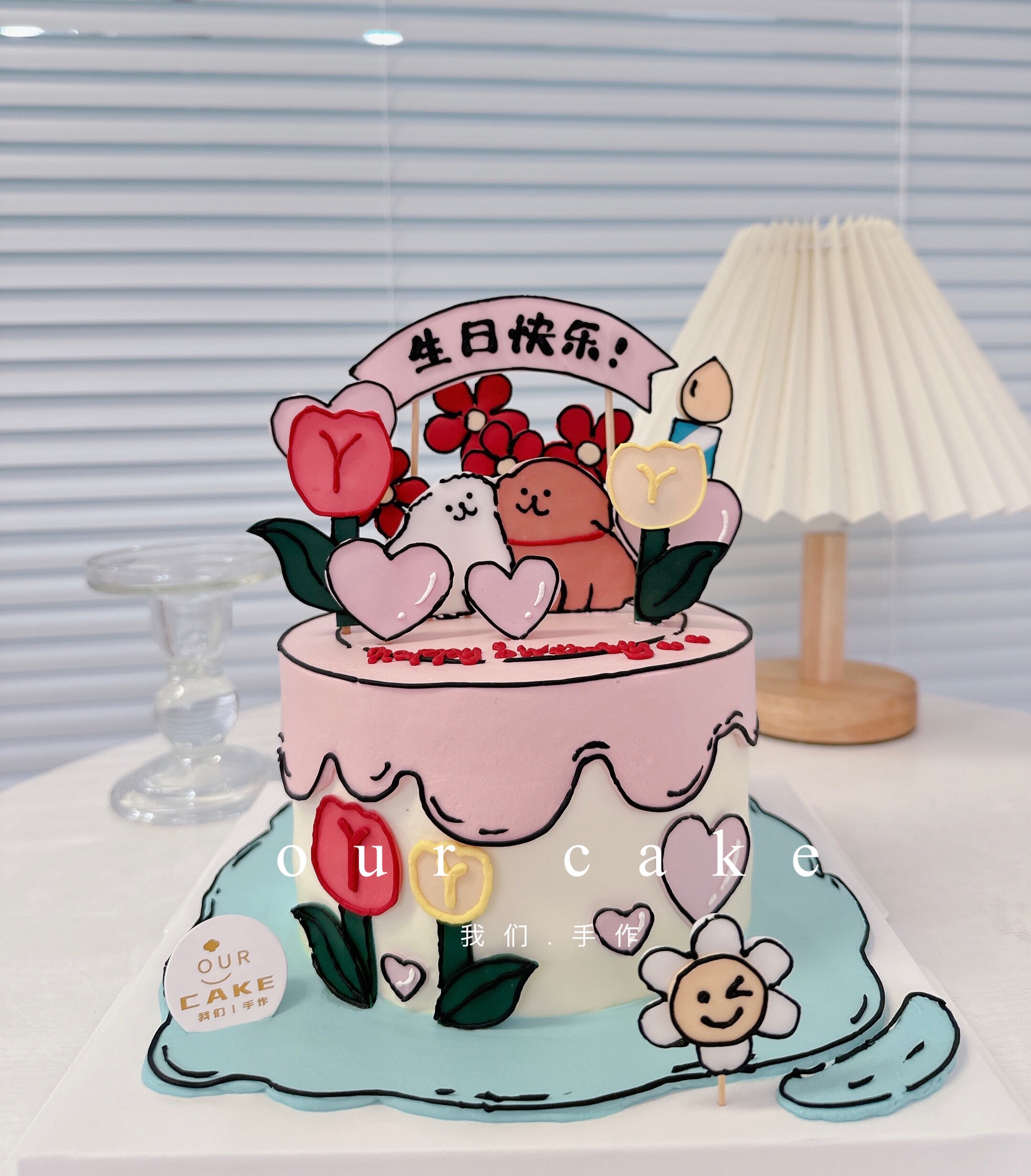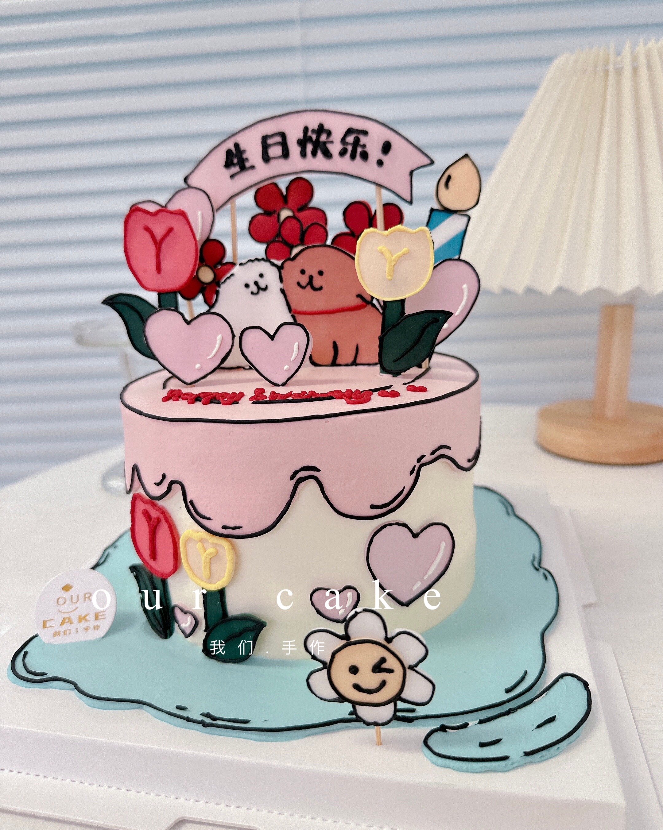 二次元漫画翻糖线条狗动物花花手绘蛋糕 -低糖处理无添加