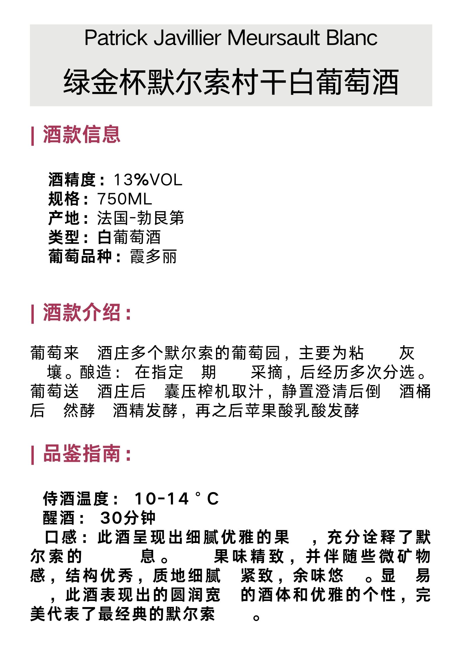 绿金杯默尔索村干白葡萄酒 Patrick Javillier Meursault Blanc