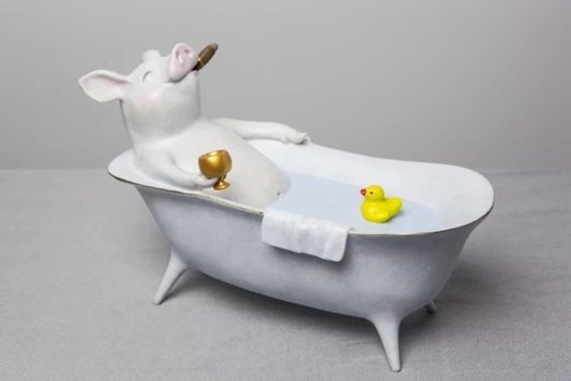 这是一件带着艺术家徐敏一贯风格的作品,拟人化的动物形象,赋予了作品不同的寓意,表达着他对生活和美的独特理解。作品营造了一个轻松惬意的景象,一只傲娇又不失有趣的小猪,手里的红酒杯,嘴边的雪茄,和随心所欲的肢体语言,透漏着它把控人生的自信,更令人会心一笑的是那只永远的小黄鸭。无论何时无论在哪儿,内心的纯真和童趣,永远会让我们更从容和自由。