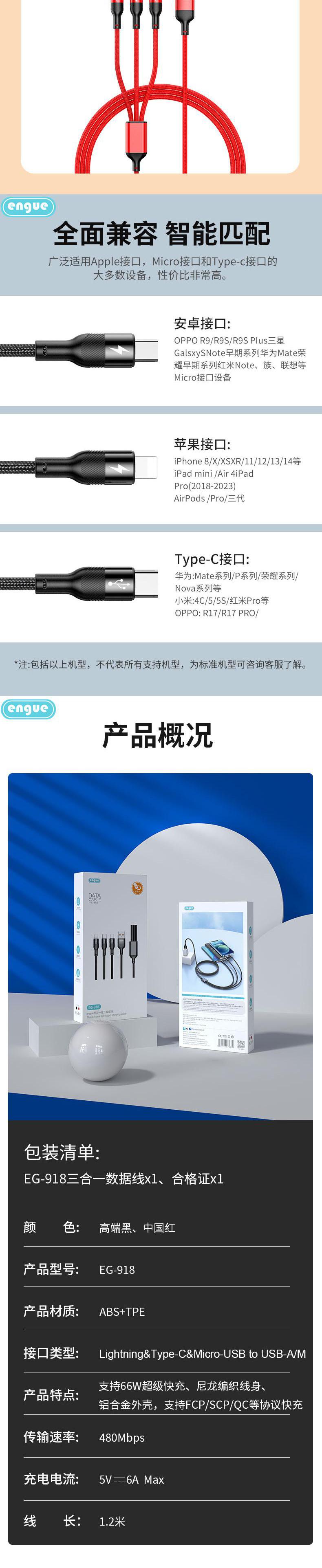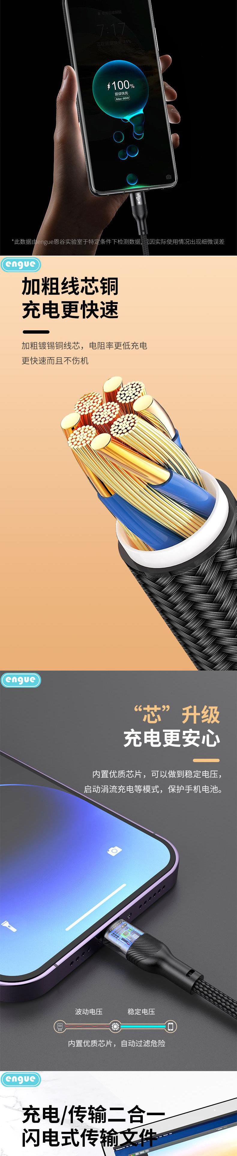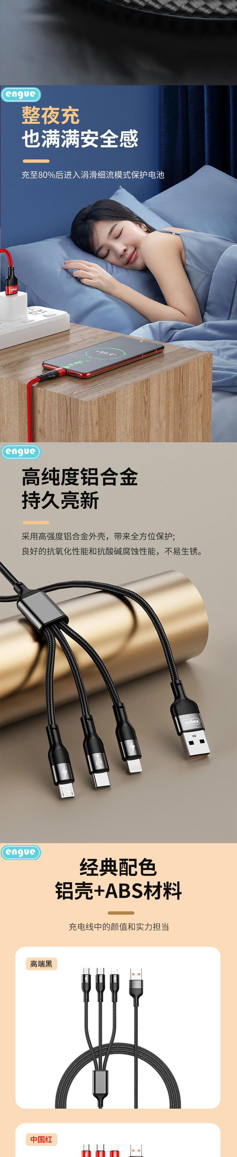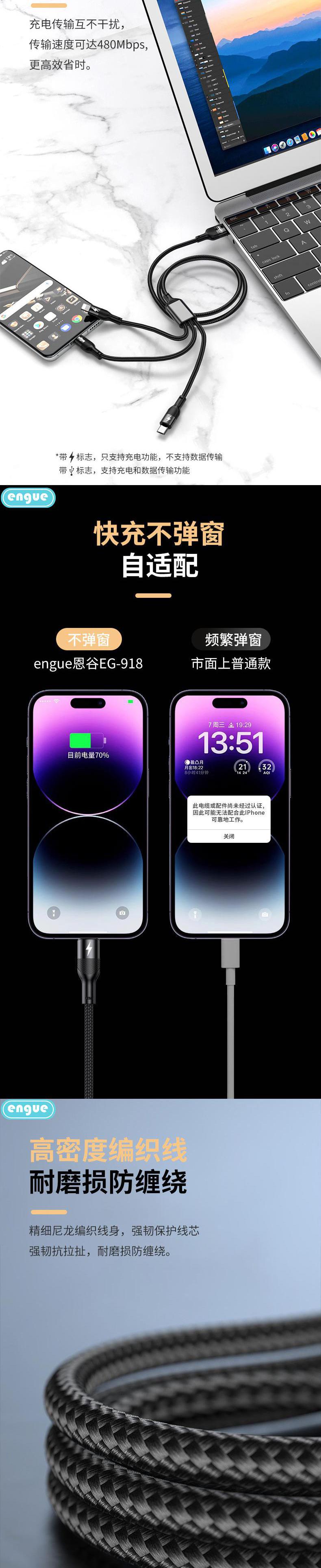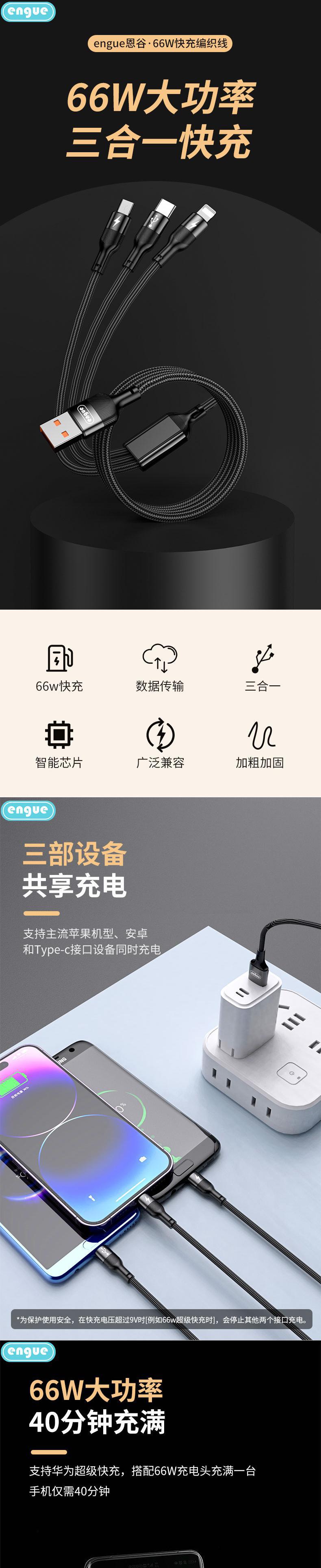 【自营】engue恩谷66W一拖三快充数据线EG-918苹果Type-c安卓三头同时快充