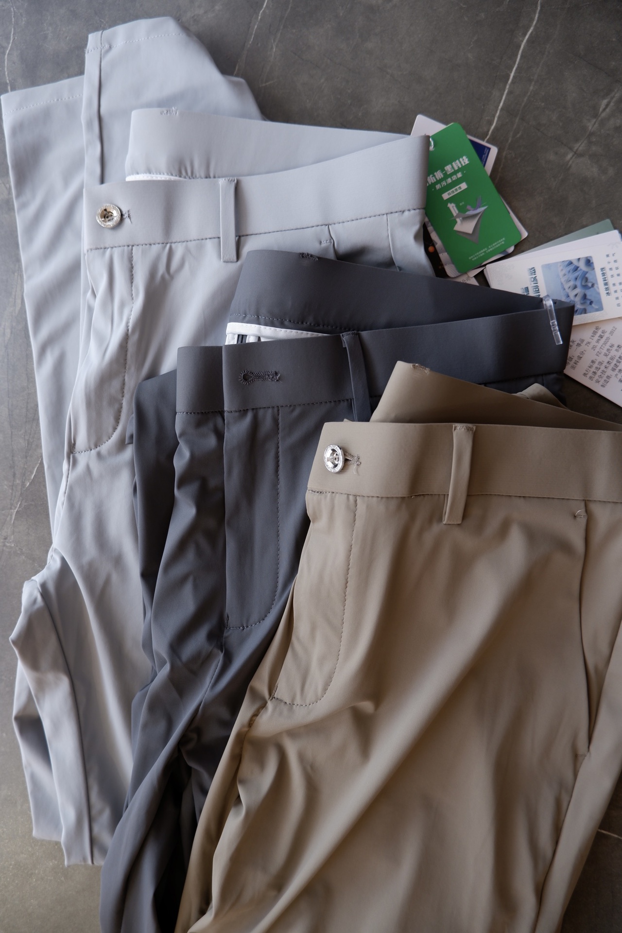 5个颜色可选:黑色 藏兰 浅灰 深灰 卡其,都是夏季主打色系,搭配T恤衬衫或者polo都赏心悦目,商务休闲从容应对