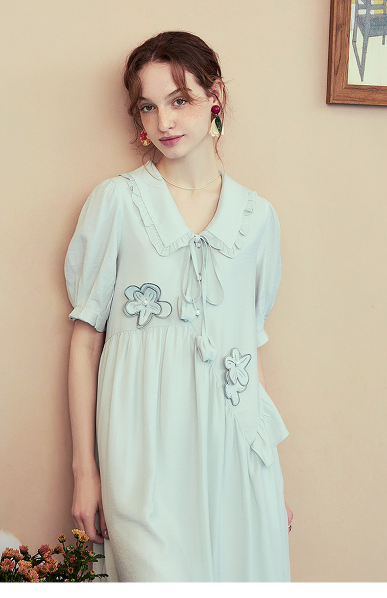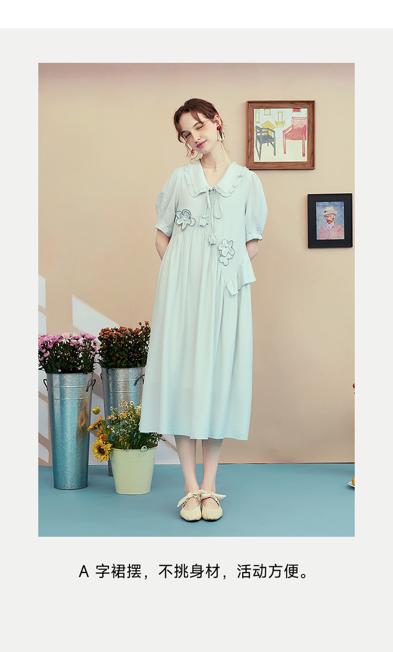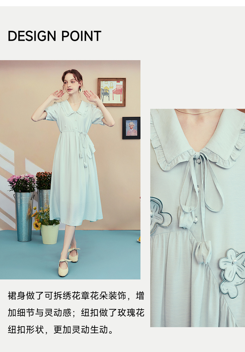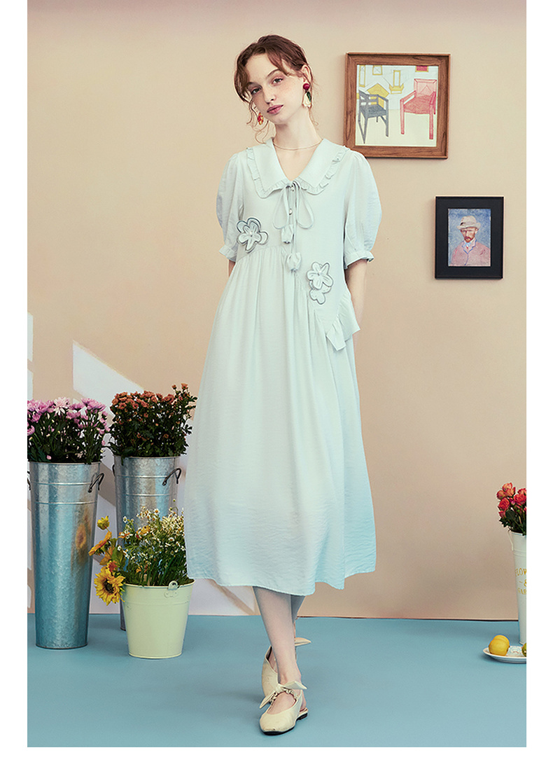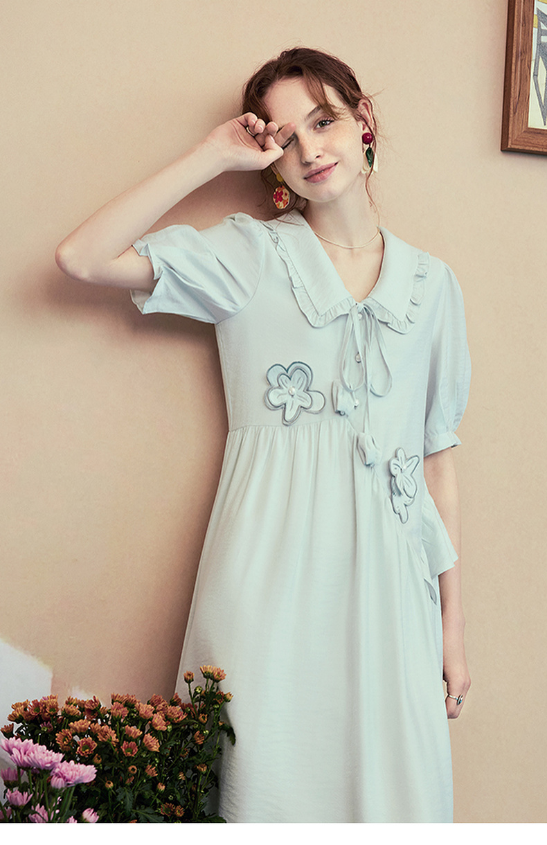 两三事 林下初行 2025春季新款甜美立体花朵绑带翻领连衣裙