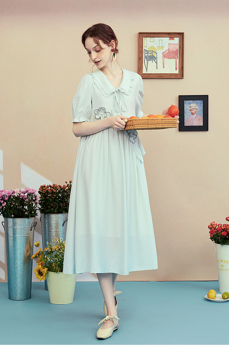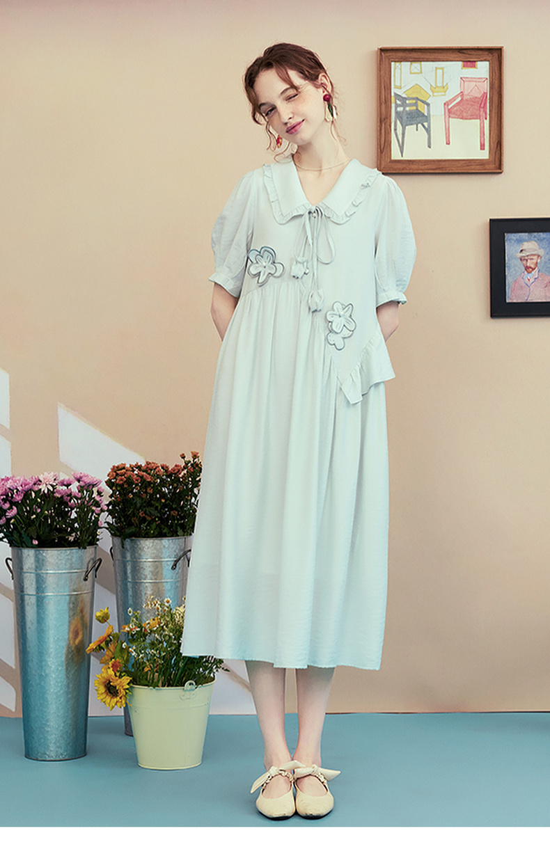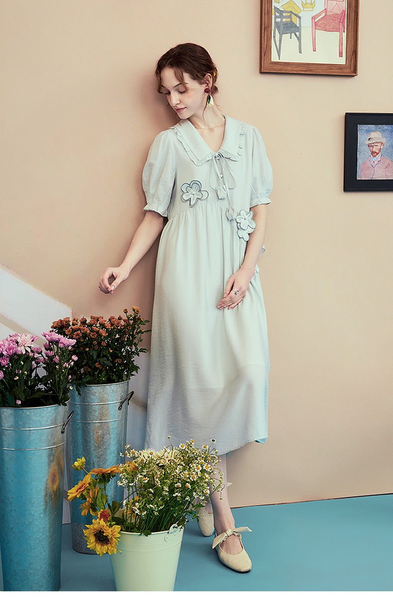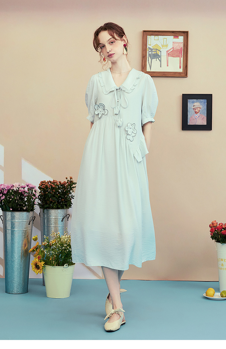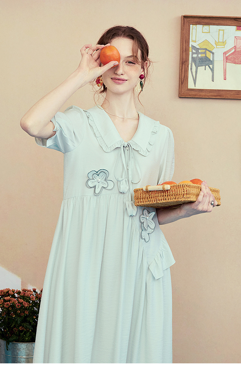 两三事 林下初行 2025春季新款甜美立体花朵绑带翻领连衣裙