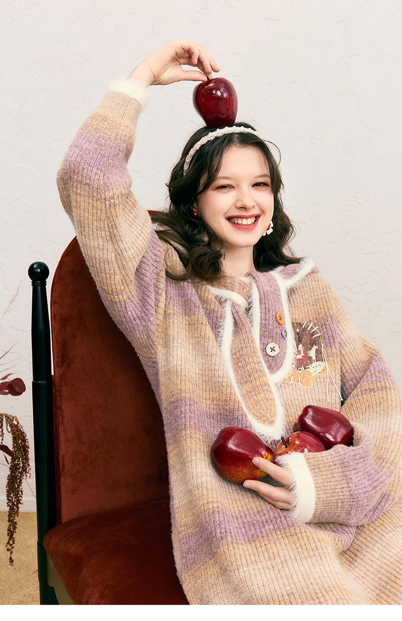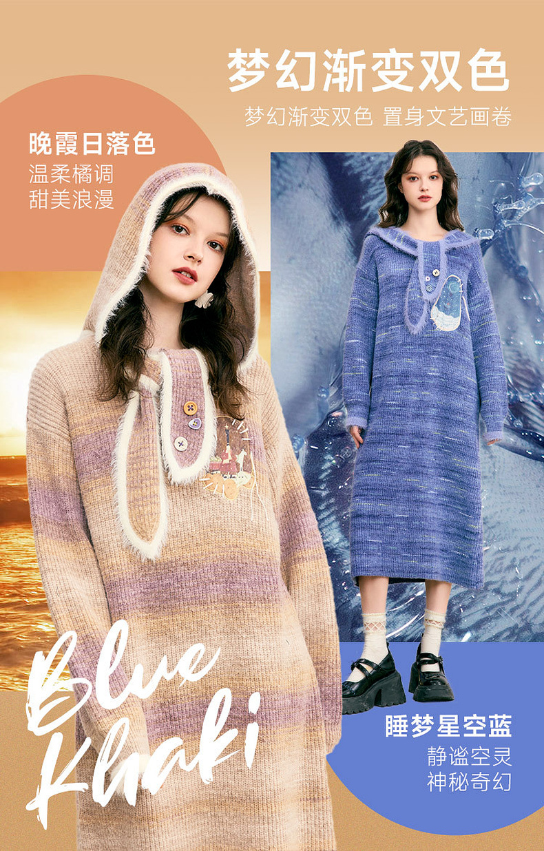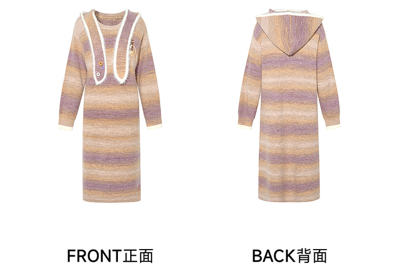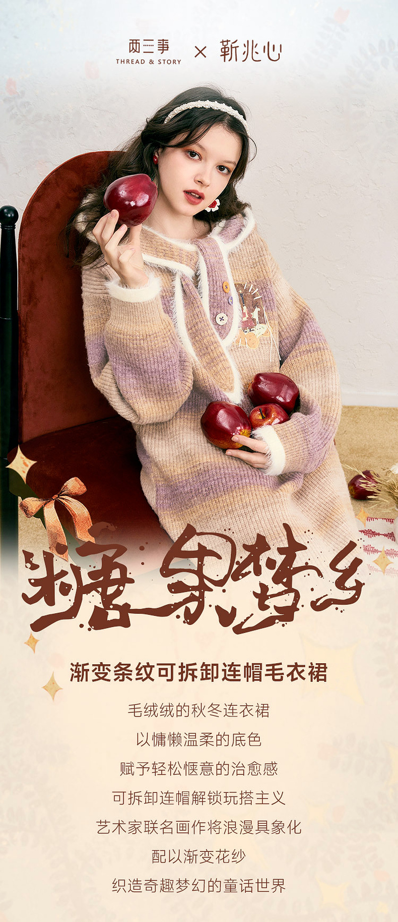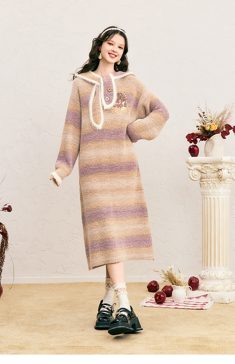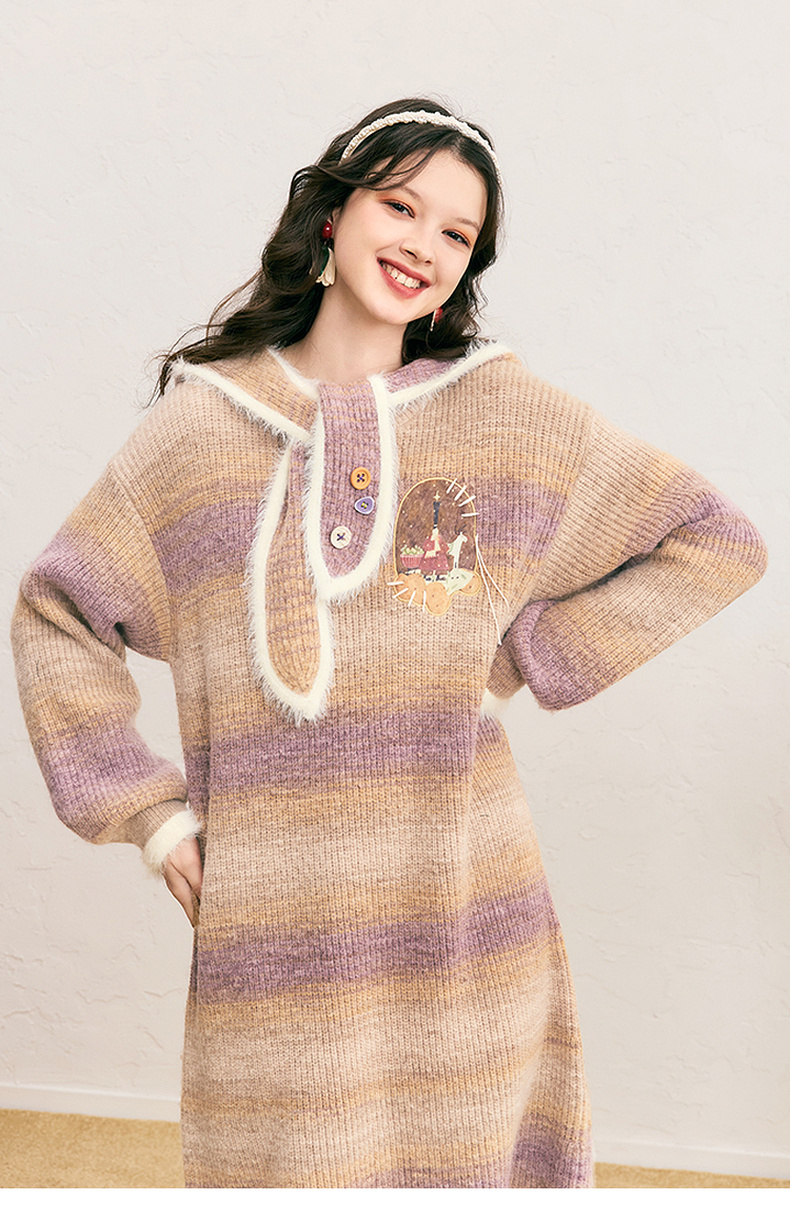 两三事糖果梦乡2024冬新款趣味贴布绣可拆帽子渐变色毛衣裙连衣裙