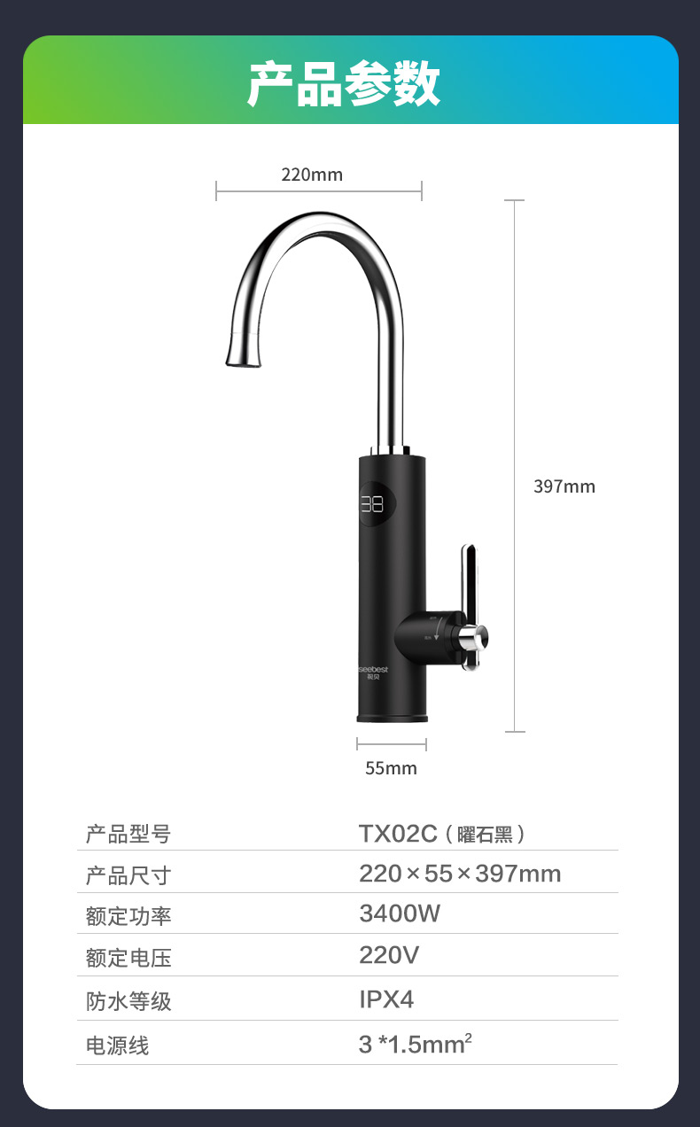 TX02C 电热水龙头/曜石黑