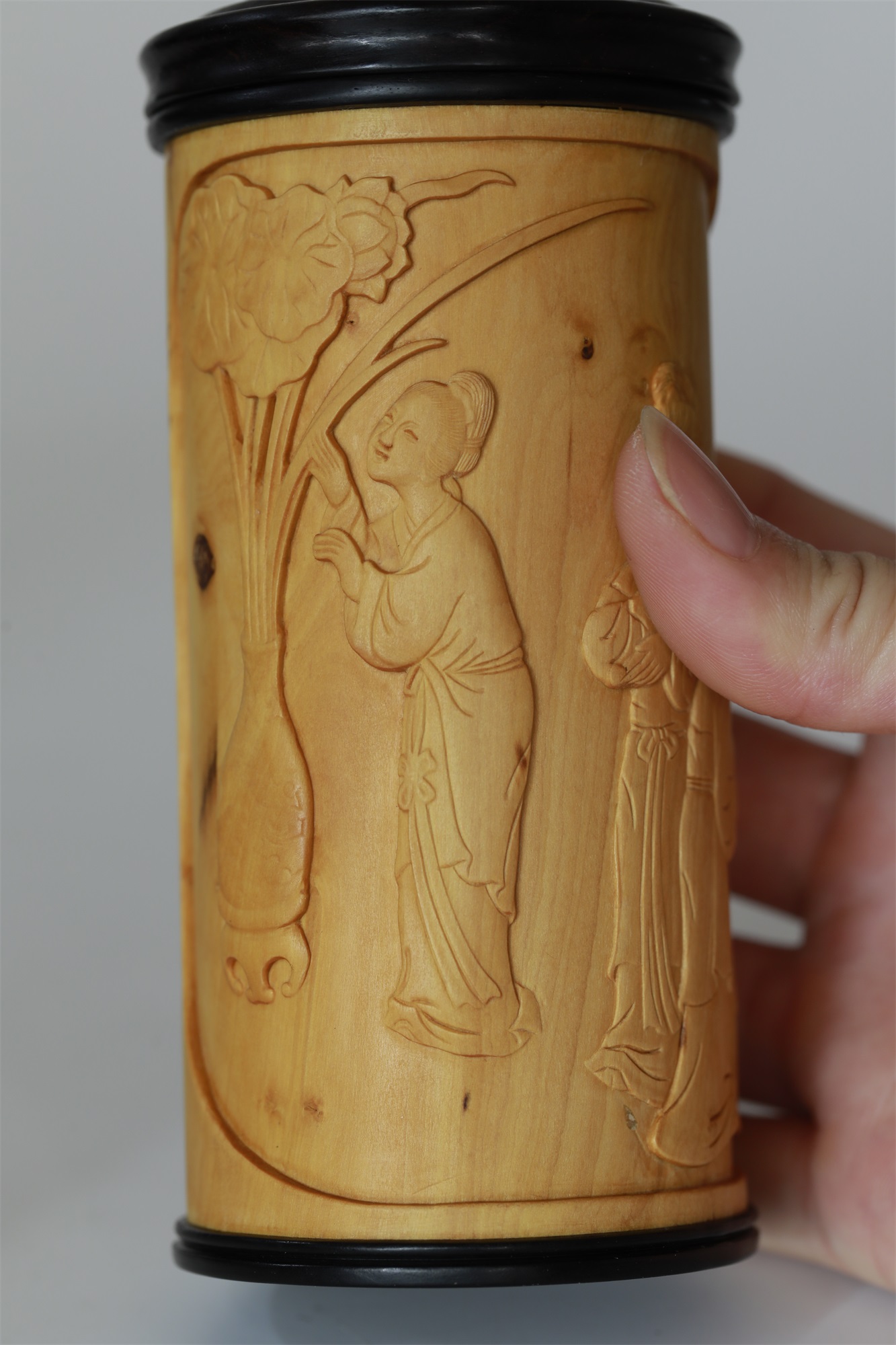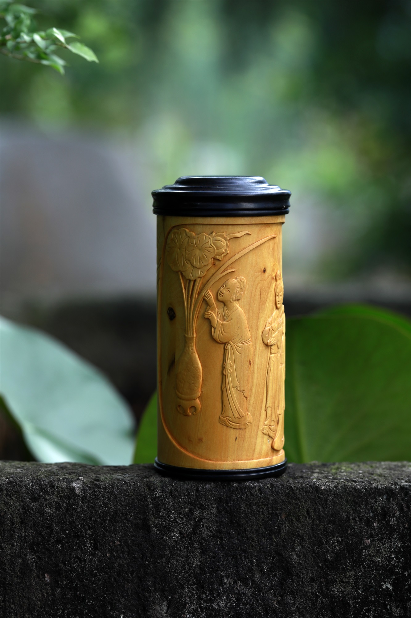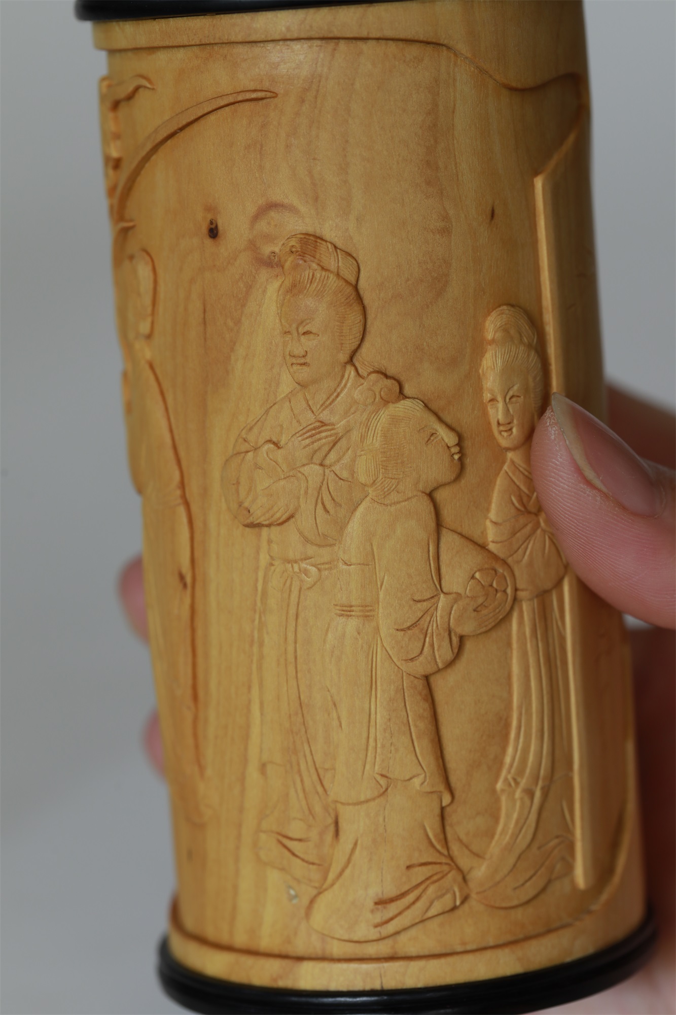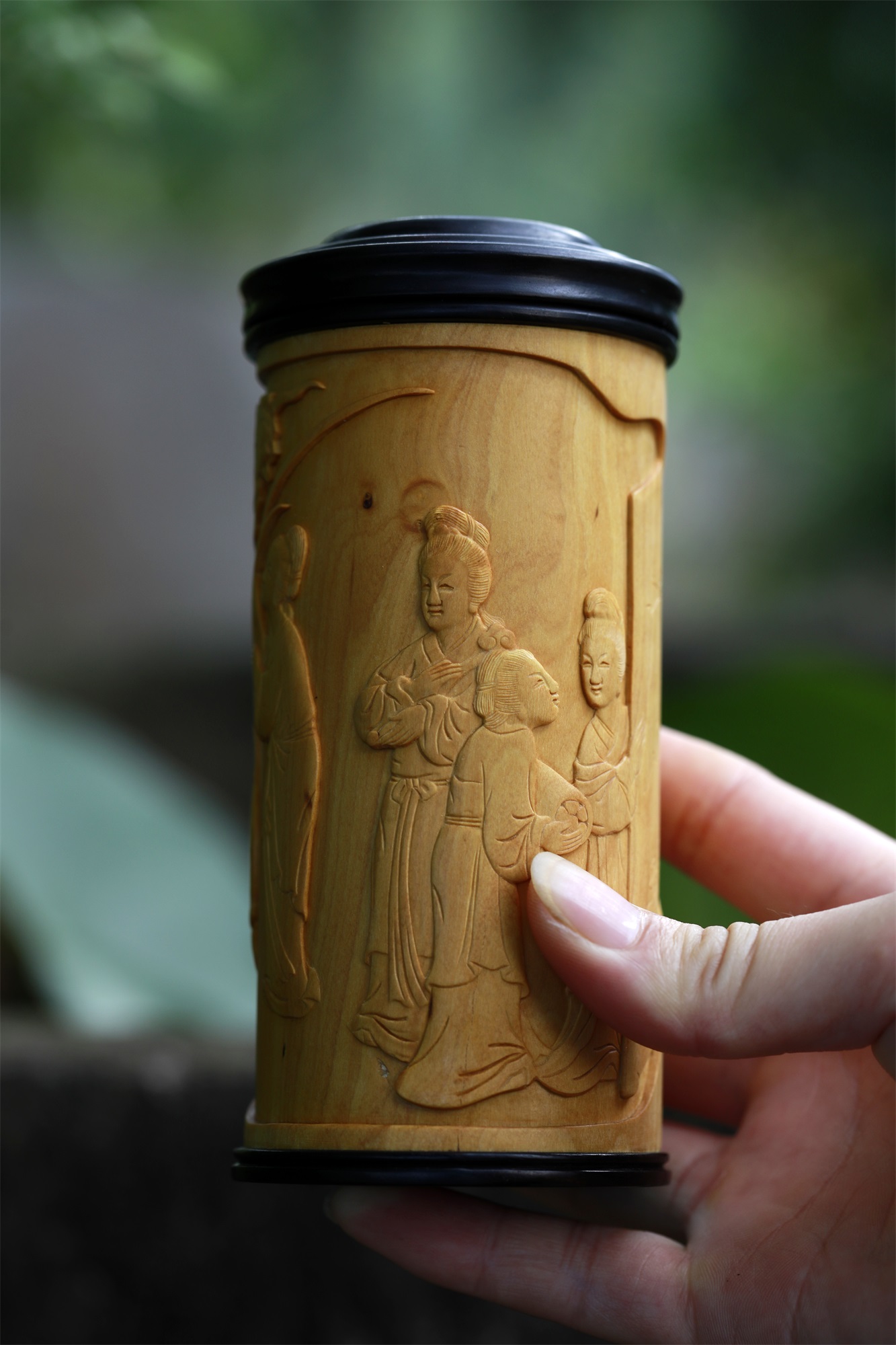 仕女图°黄杨木雕茶叶罐