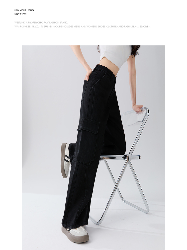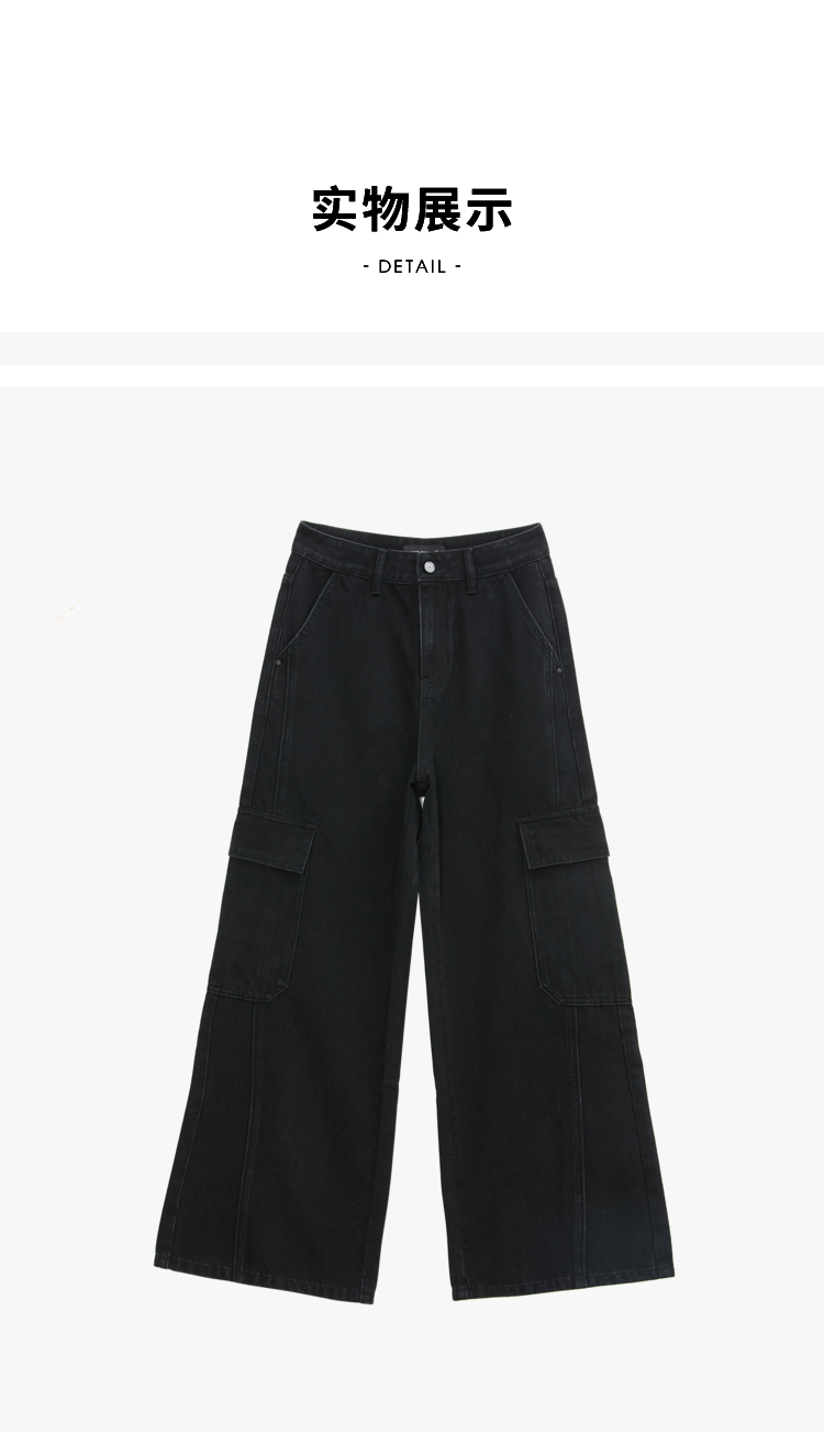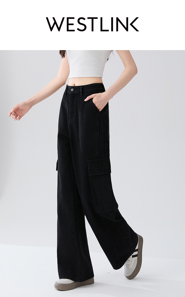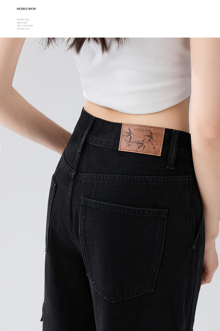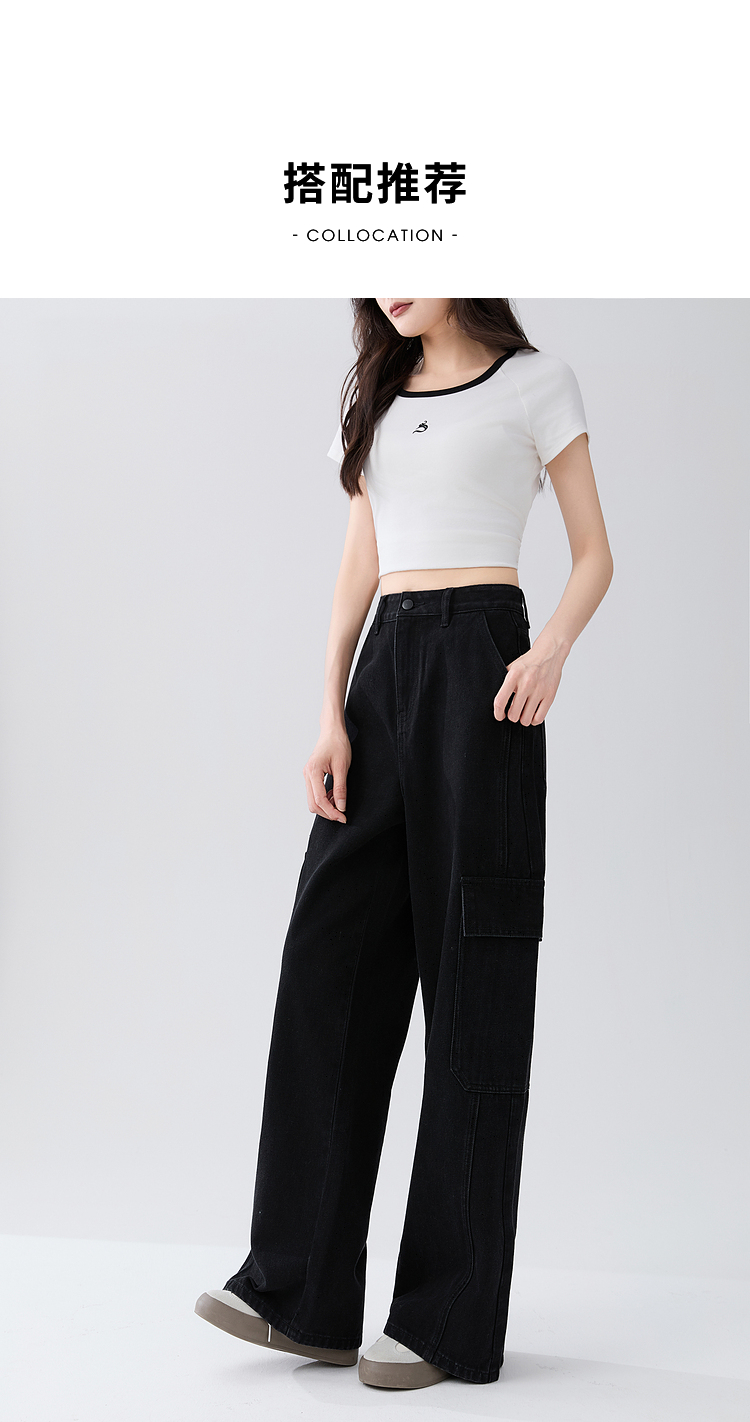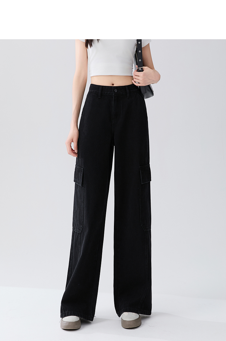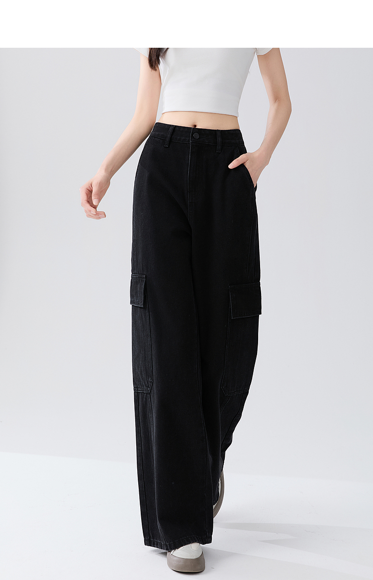 经典百搭日常通勤牛仔裤女中高腰大口袋工装裤直筒裤V3142150