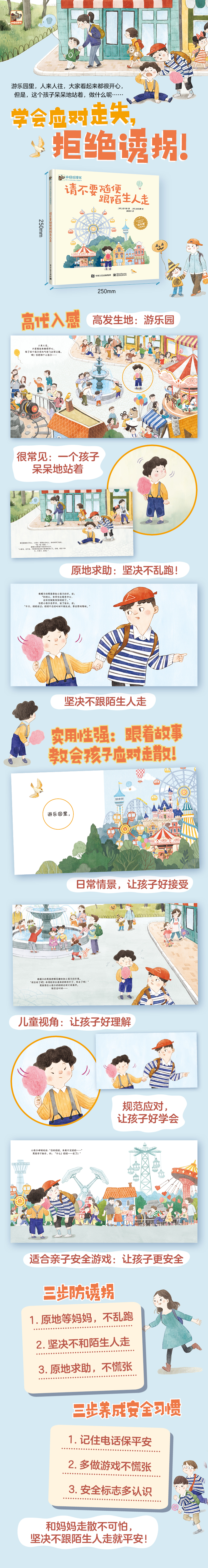 在游乐园里,人来人往非常热闹,每个孩子都笑容满面地与家人走在一起。但是喷水池旁,却有个拿着棉花糖的小朋友独自呆愣愣地站着,一动也不动,身边也没有大人。 接着,一群男孩奔跑经过小朋友的旁边,*后垫底的男孩急着赶上朋友撞倒了小朋友。小朋友摔坐在地板上,手上的棉花糖也掉落了。撞到人的男孩感到很慌张,赶紧将棉花糖捡起来。 后来,小朋友突然抽答答地哭起来,嘴里说着:"妈妈不见了!”。男孩与走失的小朋友对视,虽然很想追上同伴,男孩还是热心的准备带小朋友到服务中心找妈妈,小朋友这时坚持待在原地,因为妈妈说她不在,自己不能乱跑…… 这该怎么办呢?男孩要继续帮忙小朋友寻找他的妈妈吗?又要用什么办法找呢?