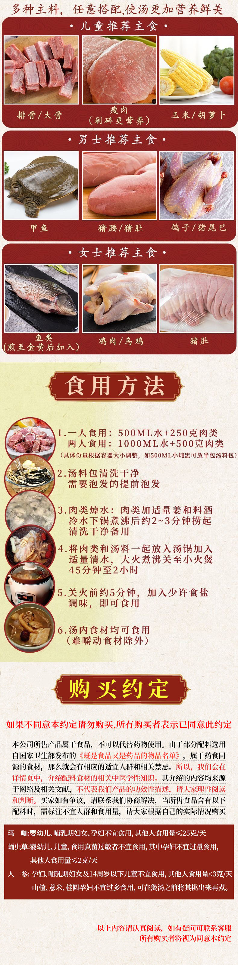 煲汤:取一包汤料清洗干净放入汤锅,加3~4碗水和肉,炖煮1.5~2小时,加盐调味后即可食用。