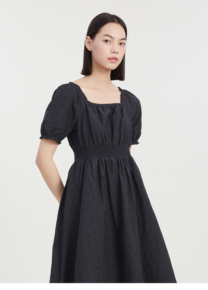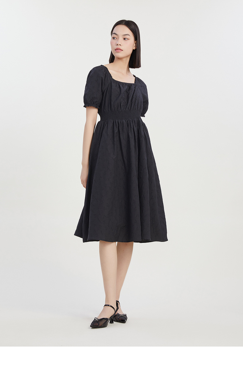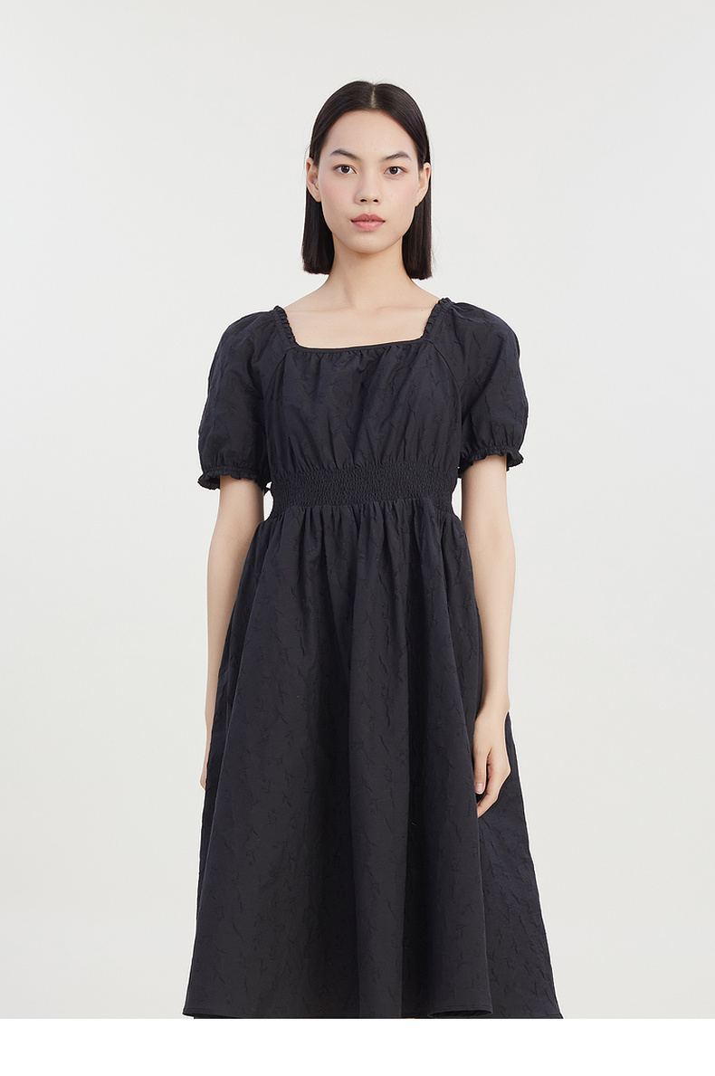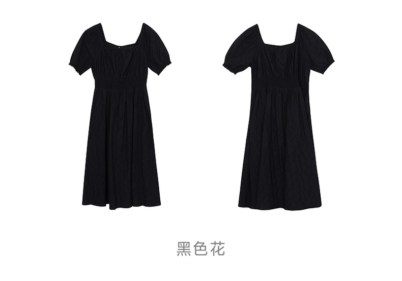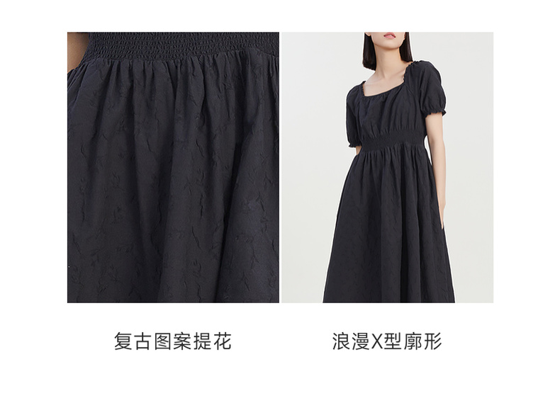谜底2023夏新款方领泡泡袖连衣裙短袖暗纹提花收腰长裙232ML0559