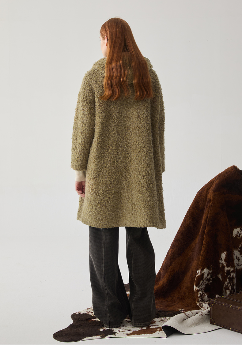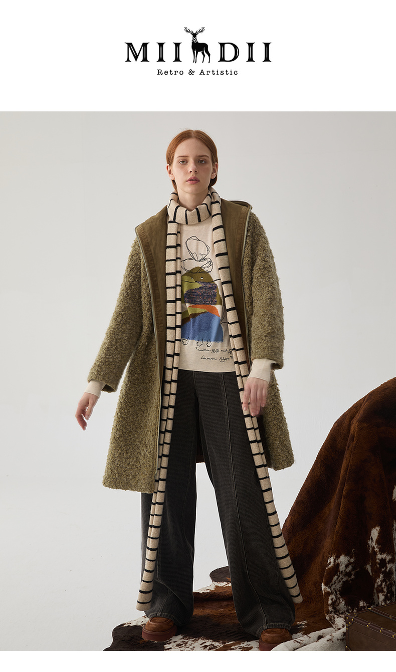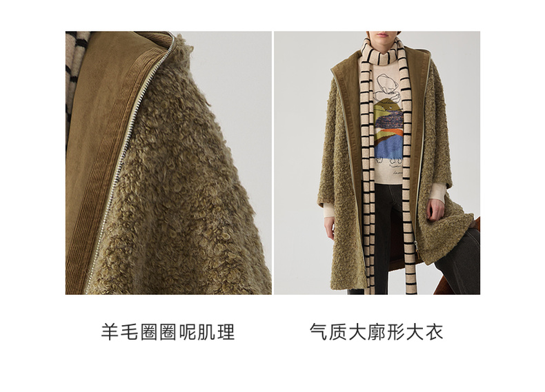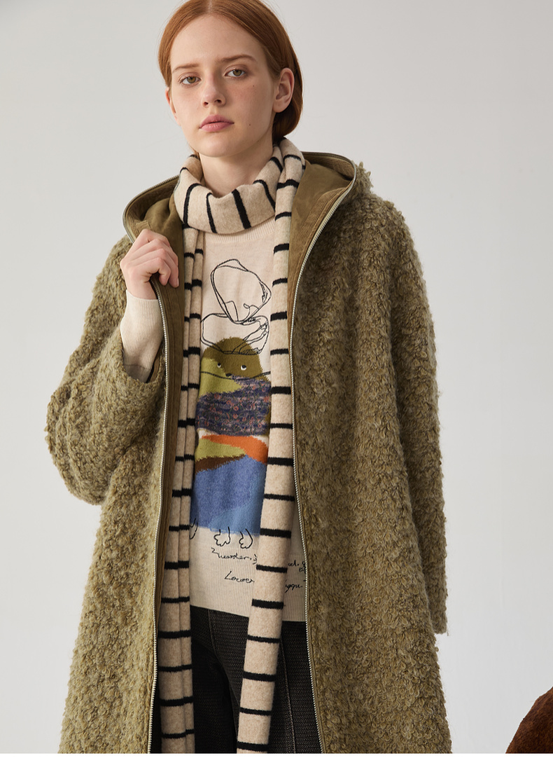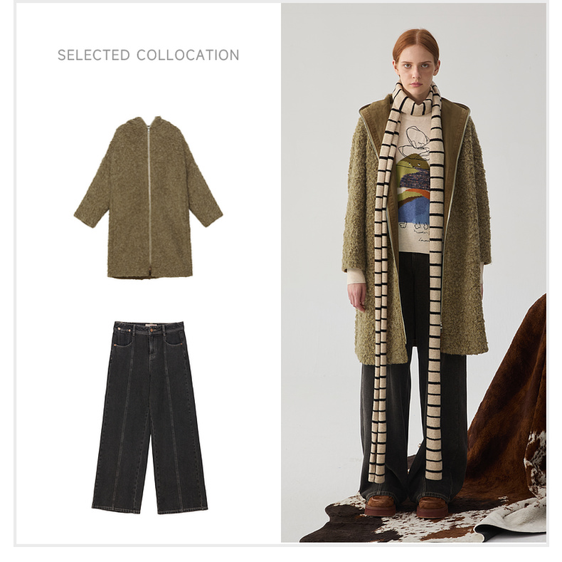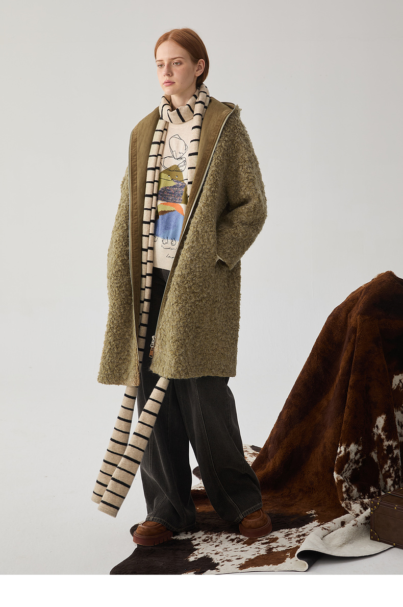 谜底羊毛混纺大衣女士2024冬新品连帽大廓形中长款毛呢244MD1529