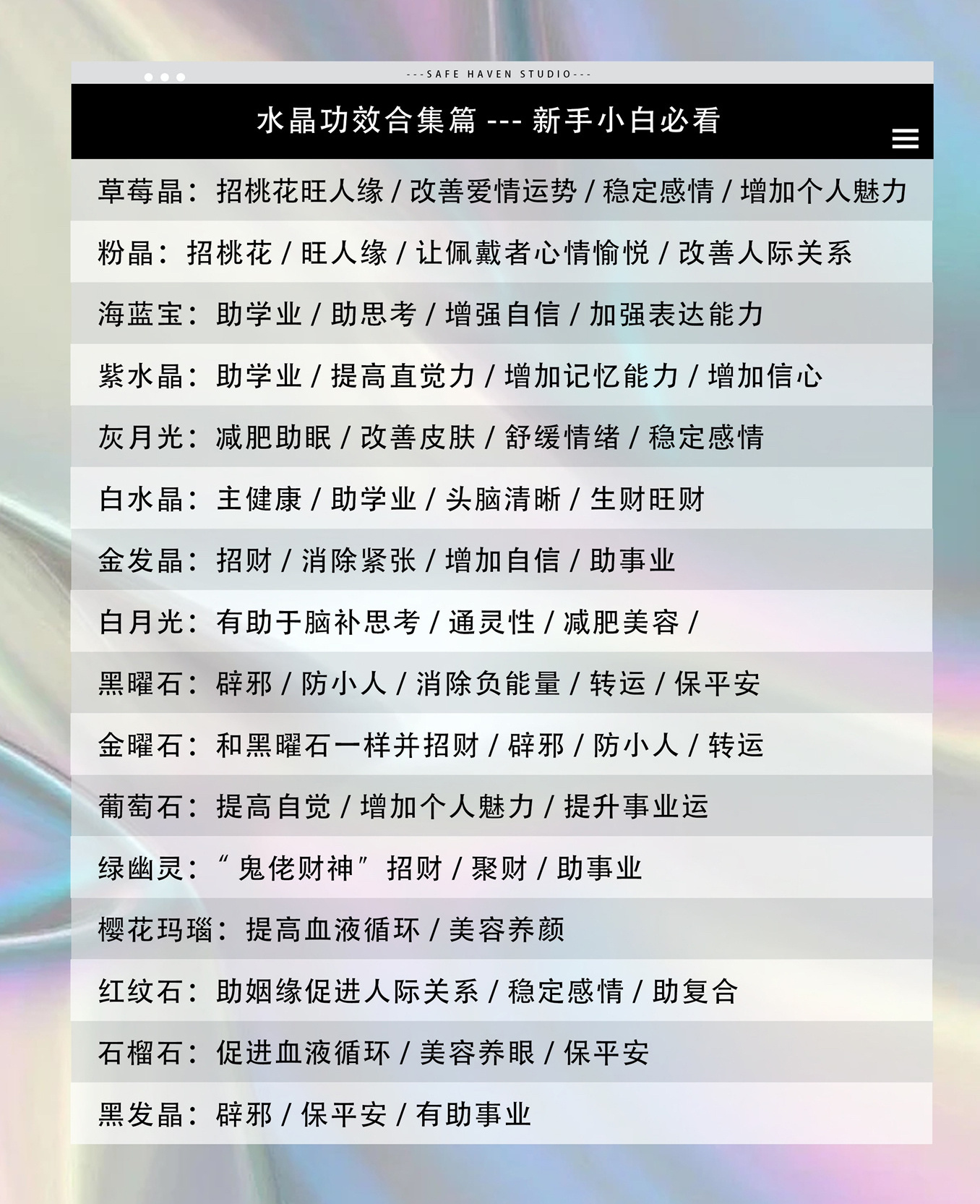 水晶的功效信则有不信则无,所有水晶的功效对于人而言都是辅助,你可以说它是能量磁场,也可以说是一种心理暗示,相信自己正在变好、转运!