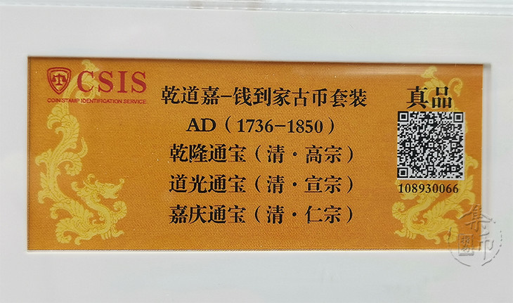 乾道嘉古钱币套装是由:乾隆、道光、嘉庆时期的钱币组成,寓意着“钱到家”。