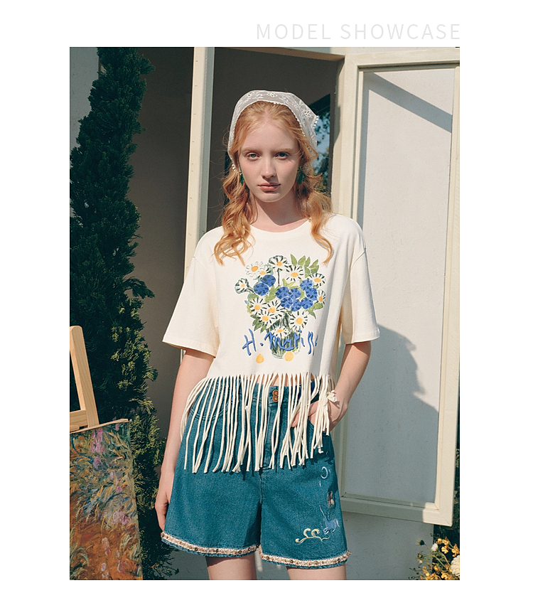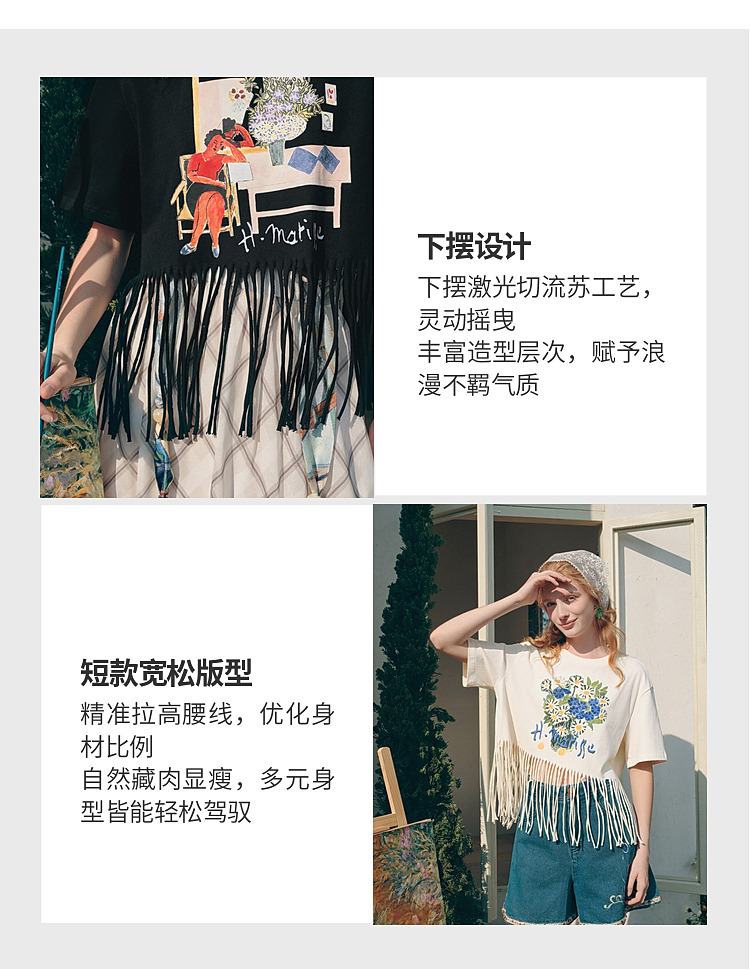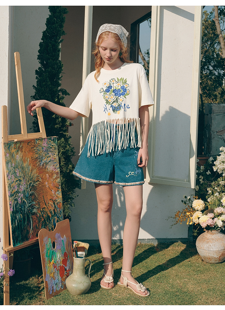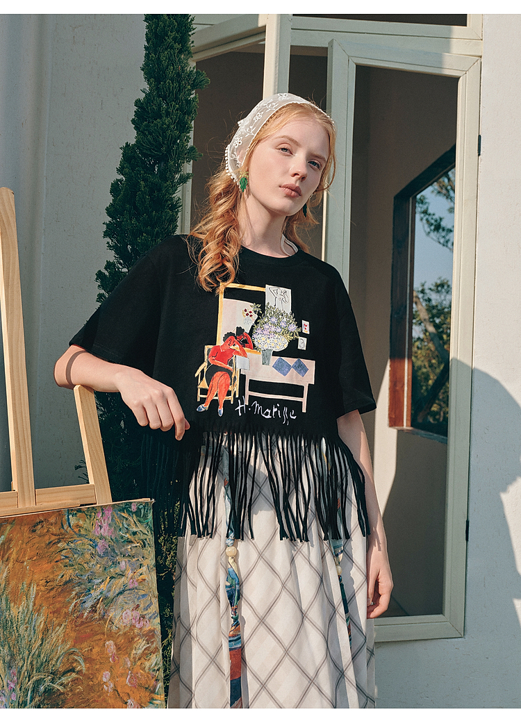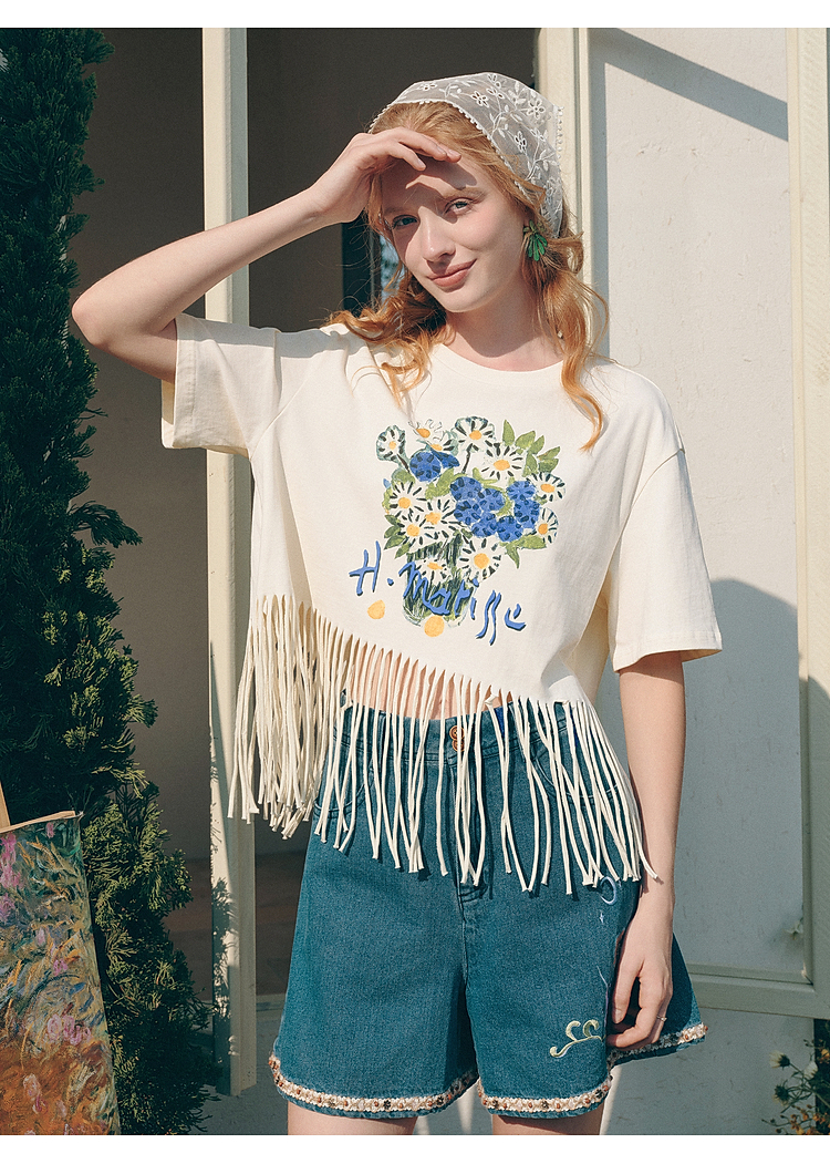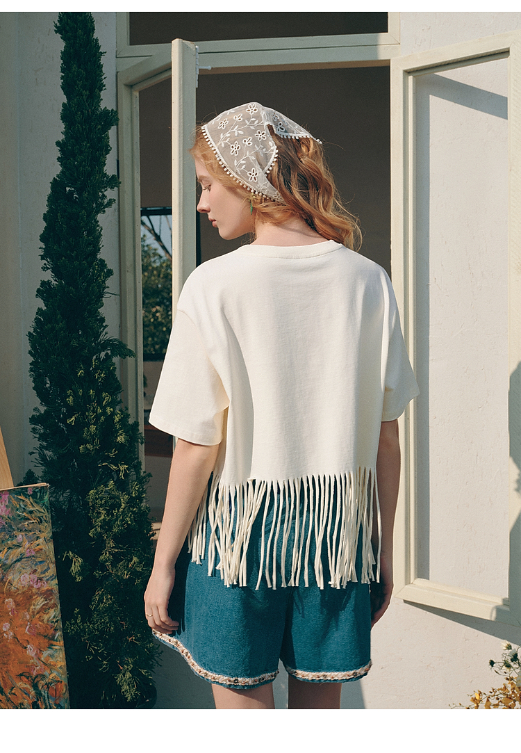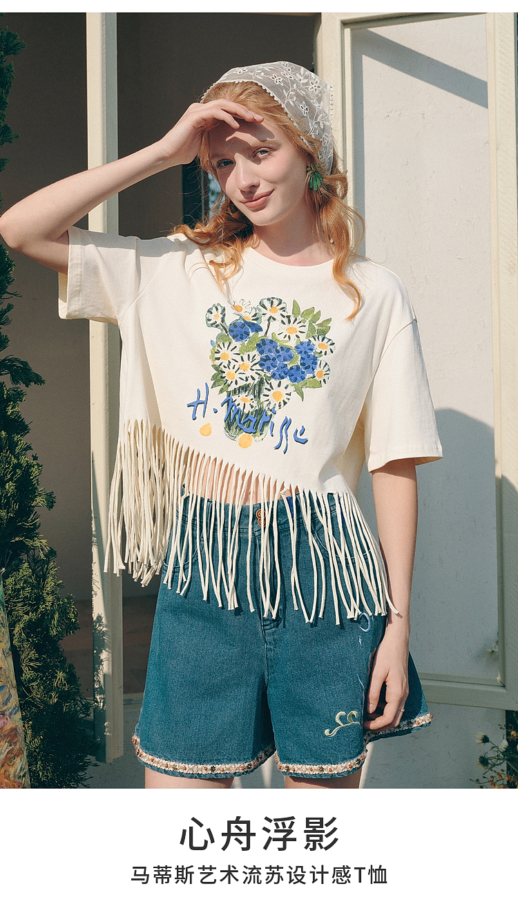 两三事 心舟浮影 2026春季新款时尚流苏下摆印花纯棉短袖t恤女