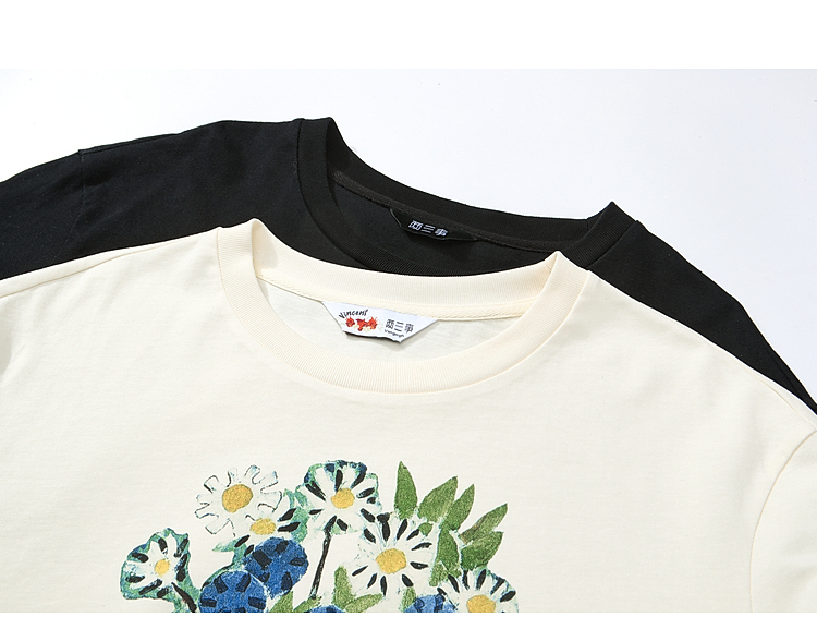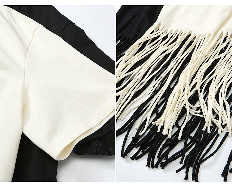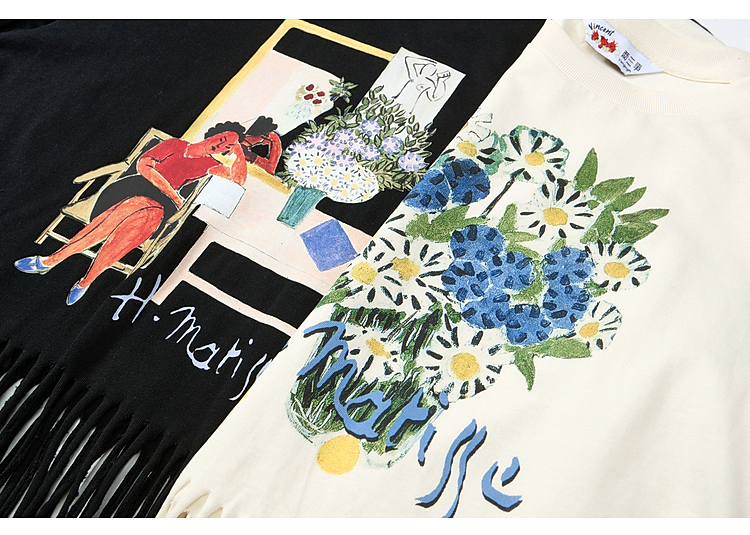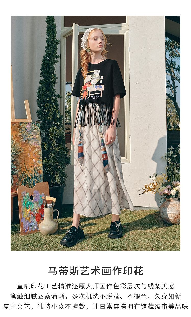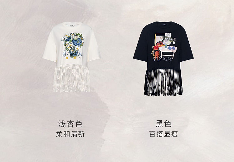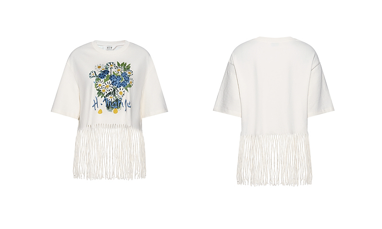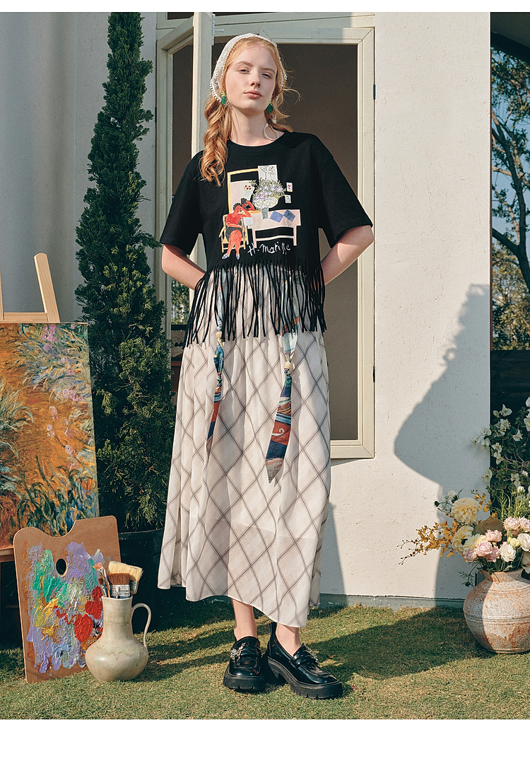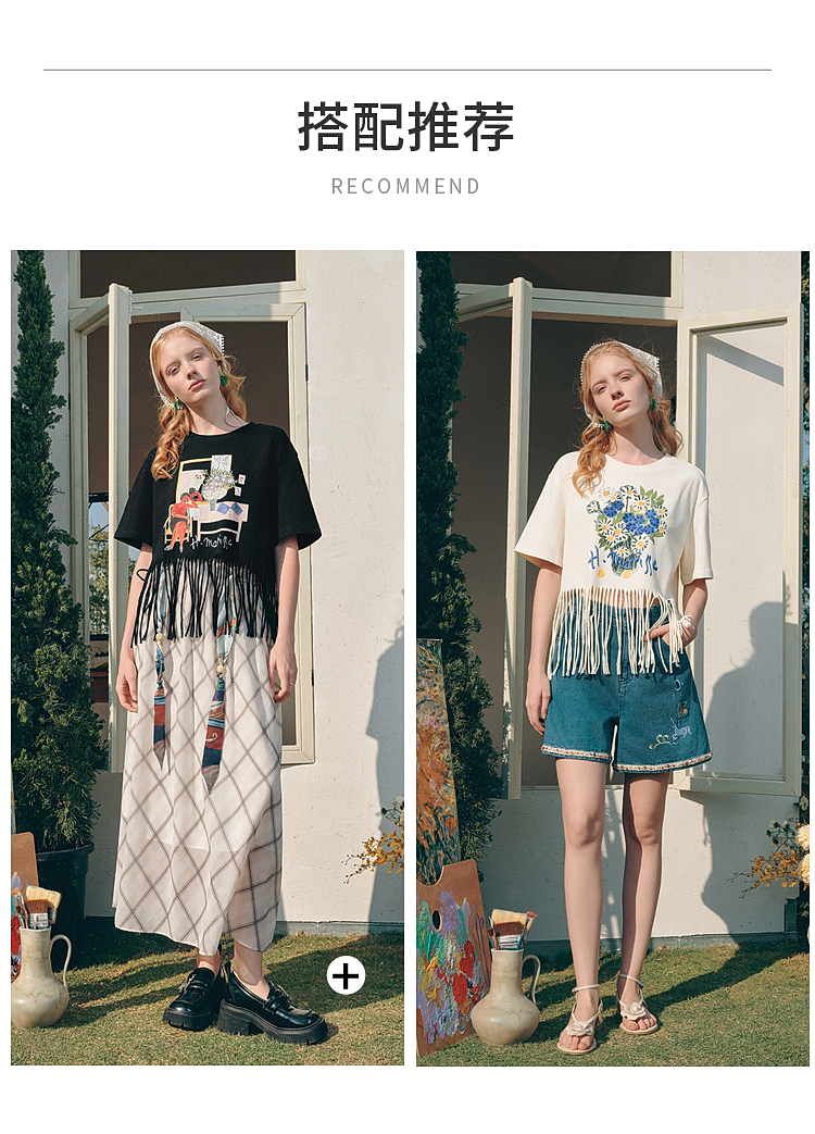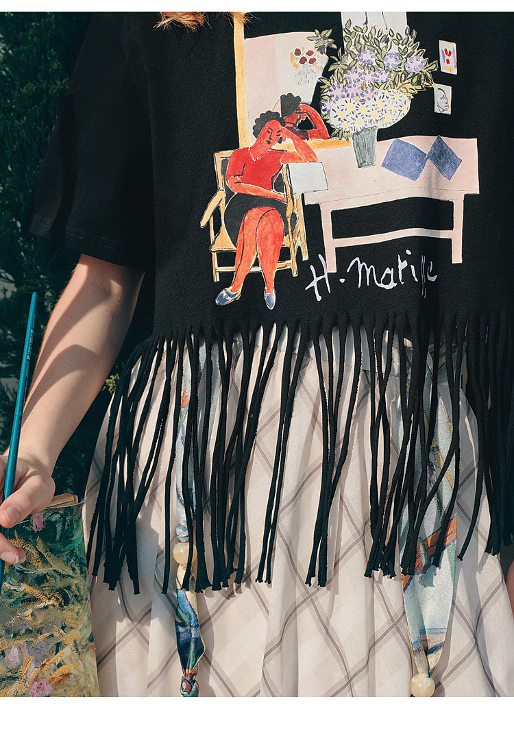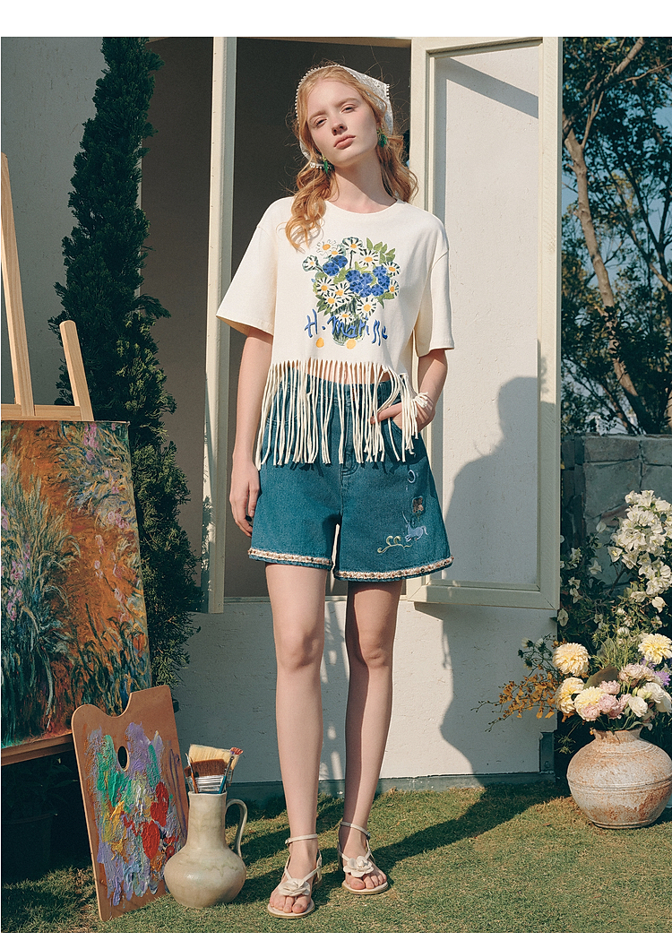 两三事 心舟浮影 2026春季新款时尚流苏下摆印花纯棉短袖t恤女