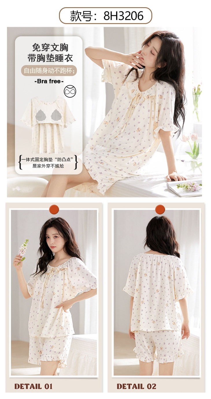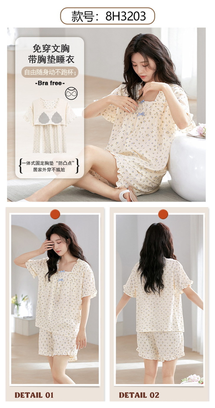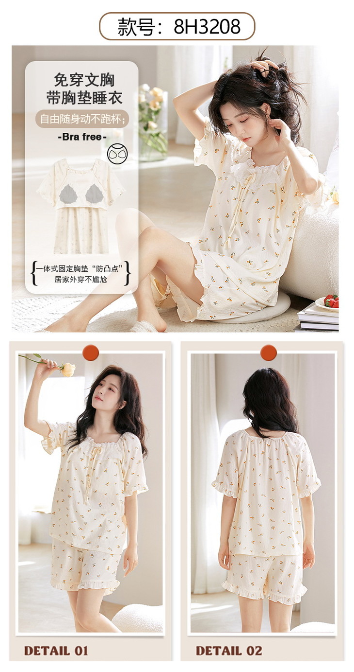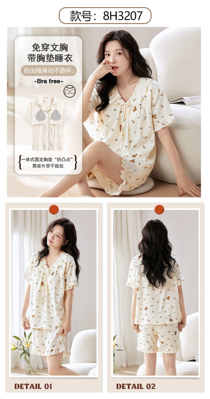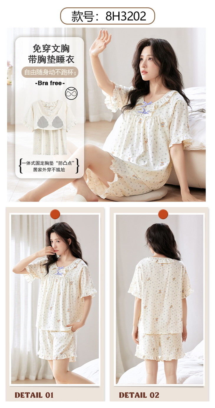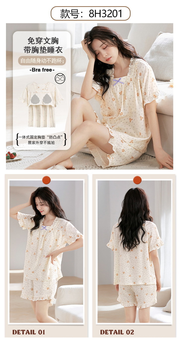 【夏季薄款短袖短裤睡衣女士】卡通可爱云朵棉带胸垫家居服套装可外穿