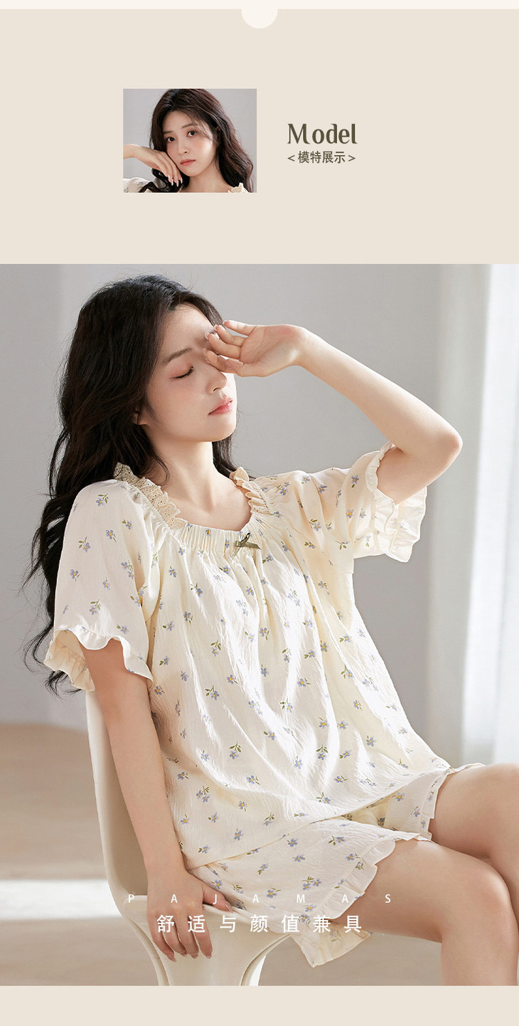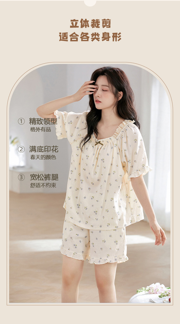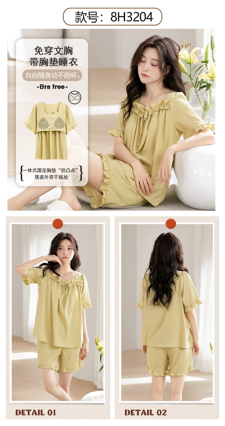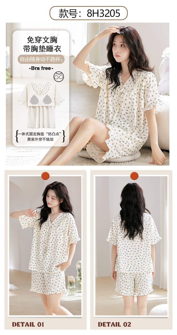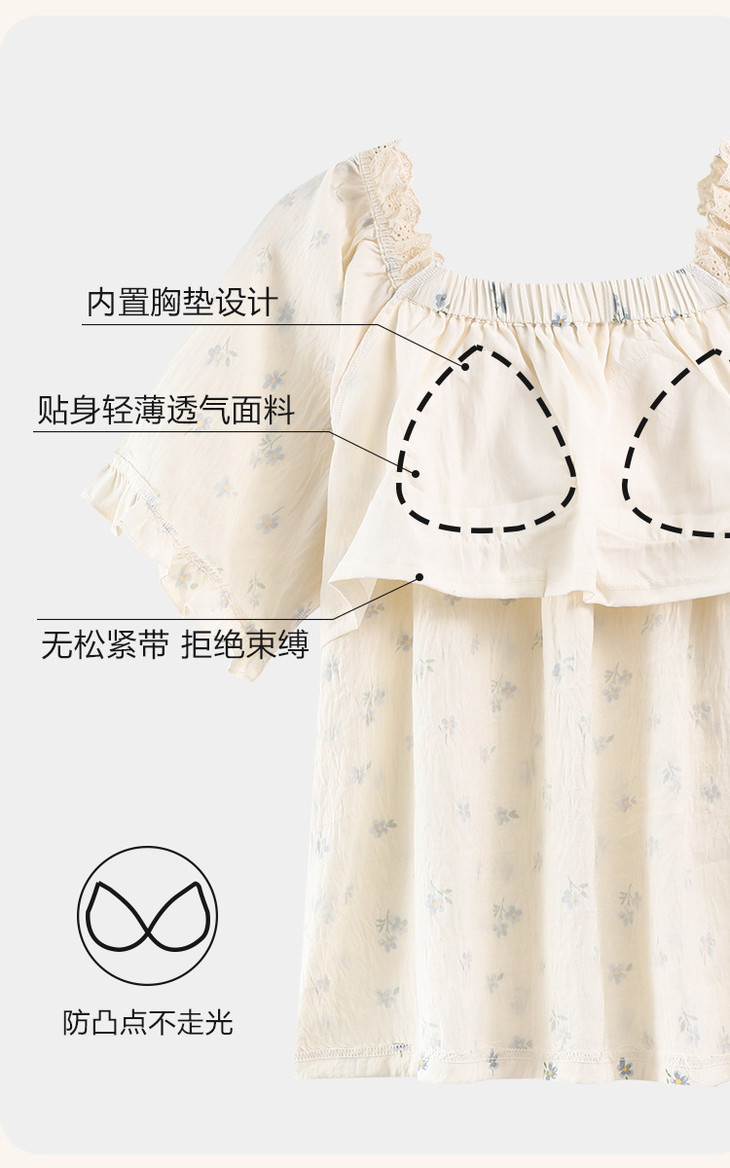 【夏季薄款短袖短裤睡衣女士】卡通可爱云朵棉带胸垫家居服套装可外穿