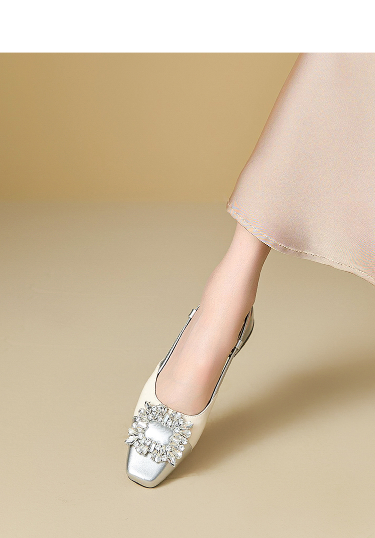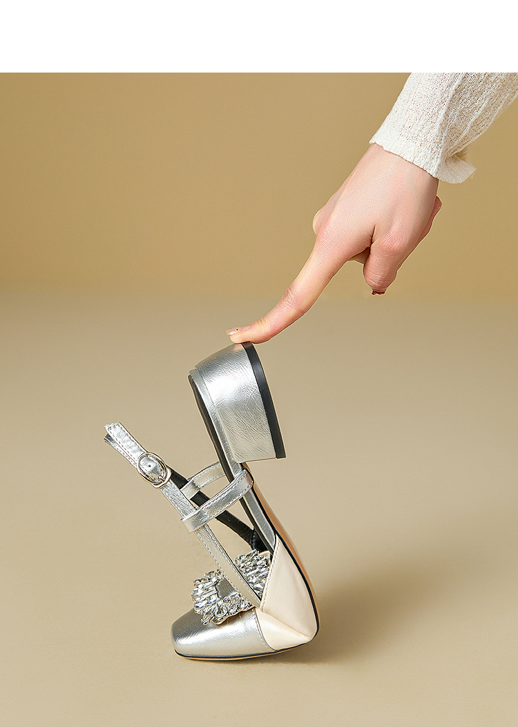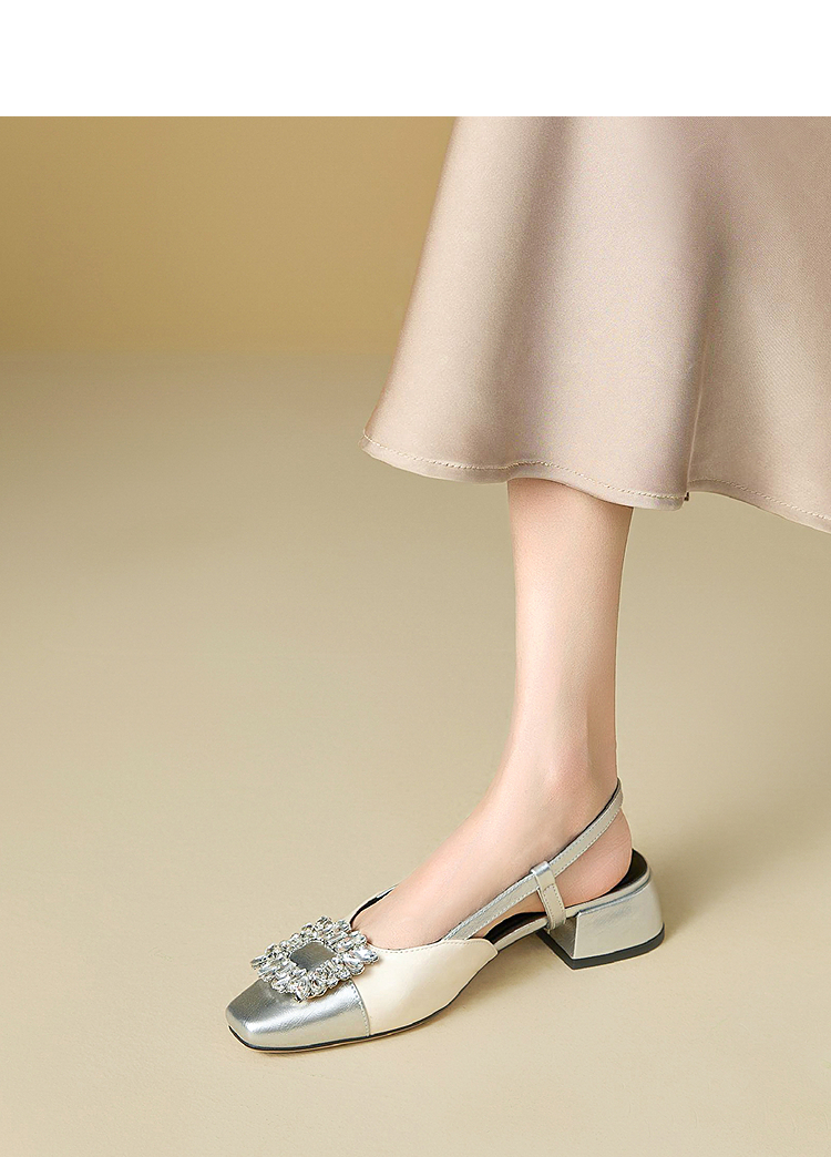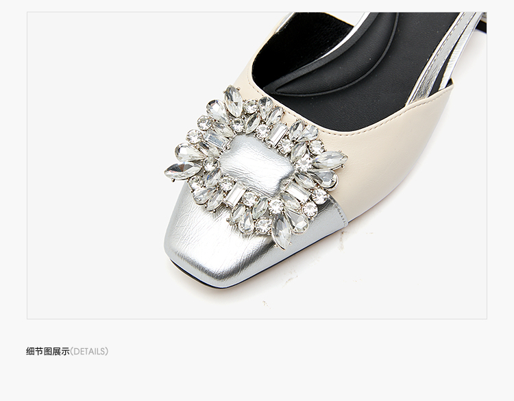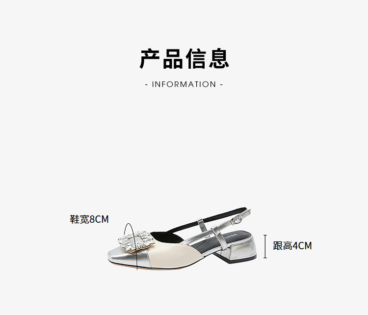西遇小香风包头凉鞋女新款春夏法式方扣水钻银色方头粗跟单鞋V0656462