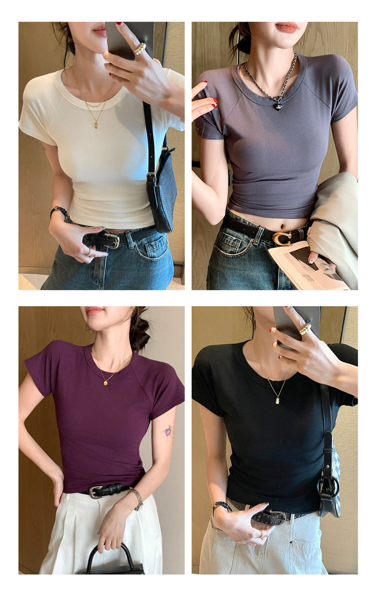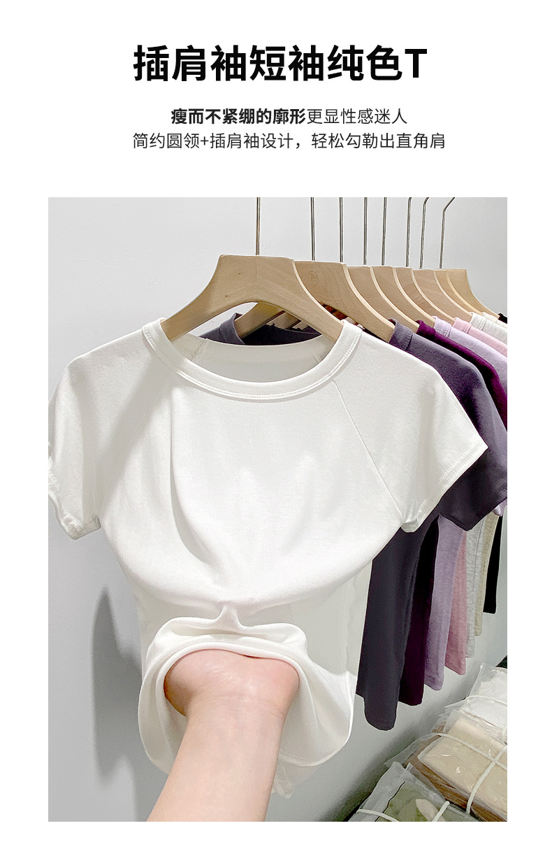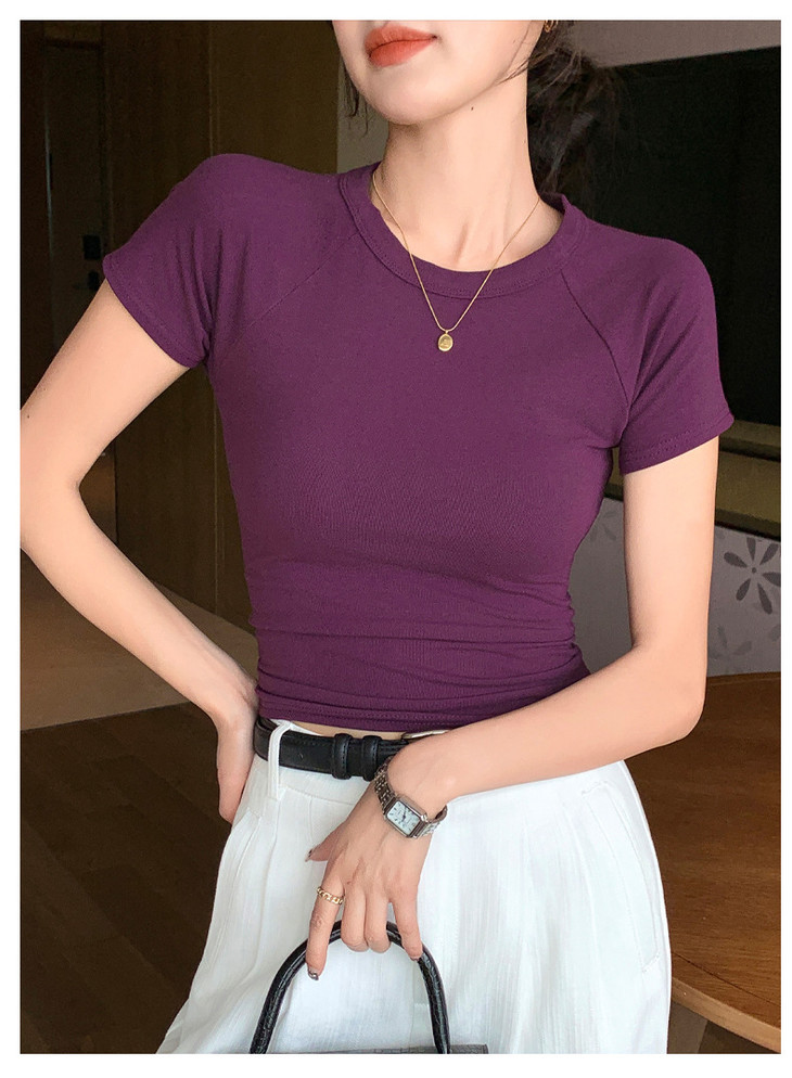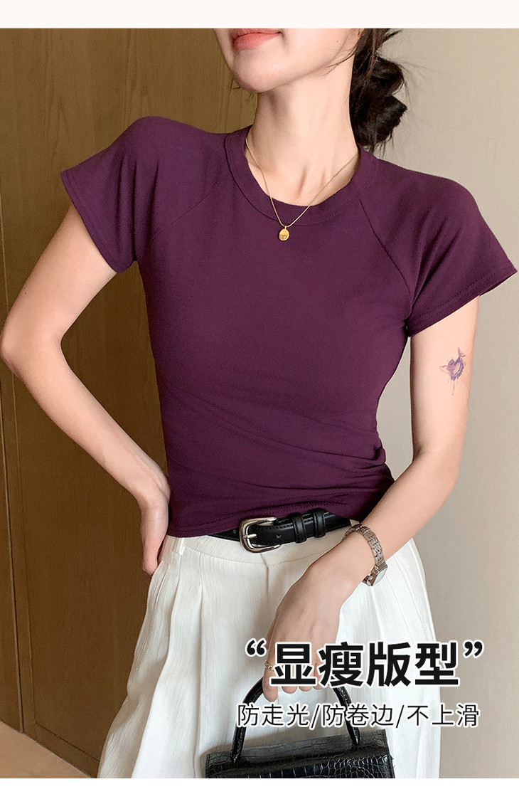 买1送1 夏季辣妹紫色设计感修身显瘦款上衣插肩袖圆领正肩短袖T恤女