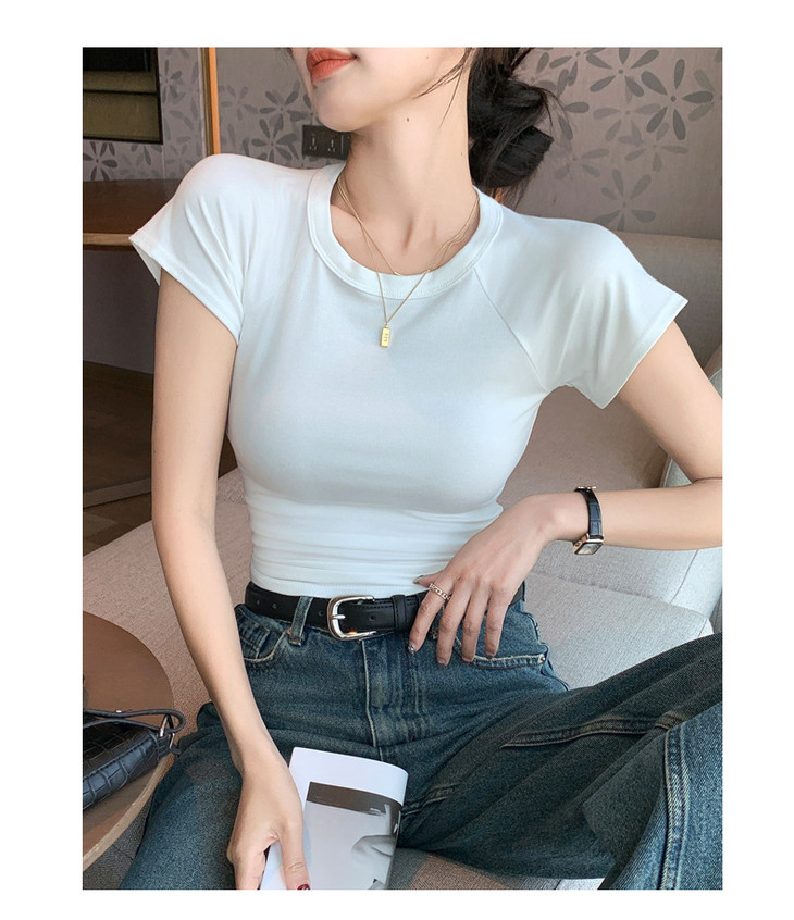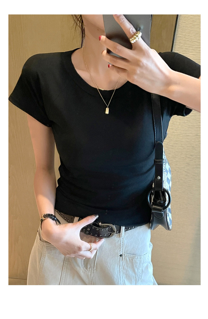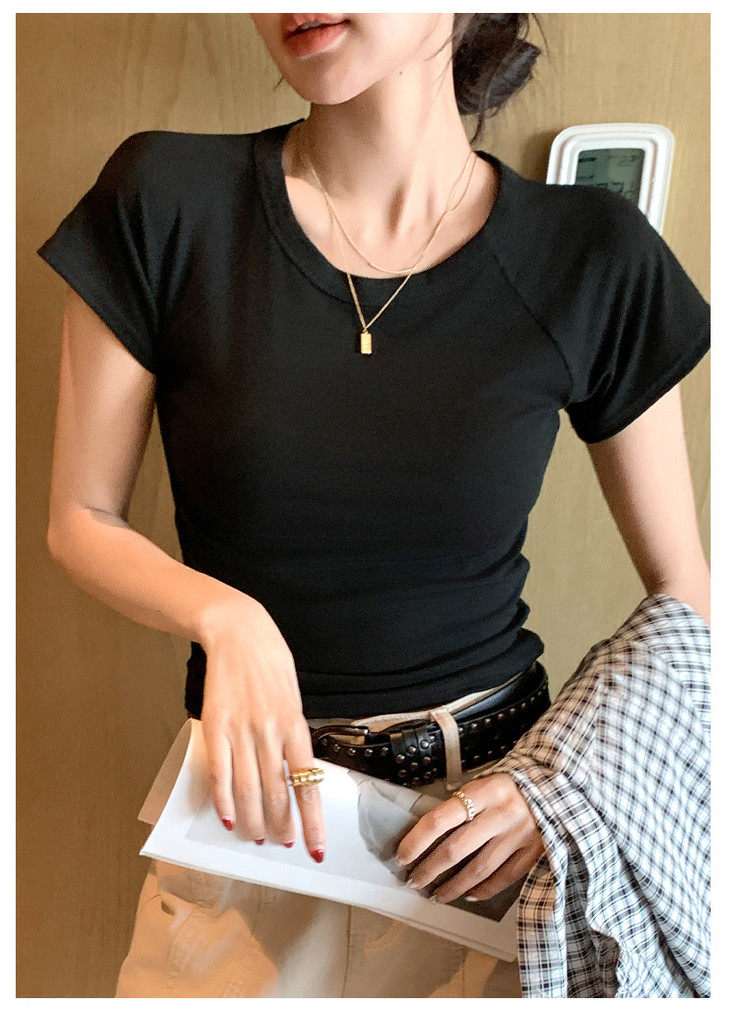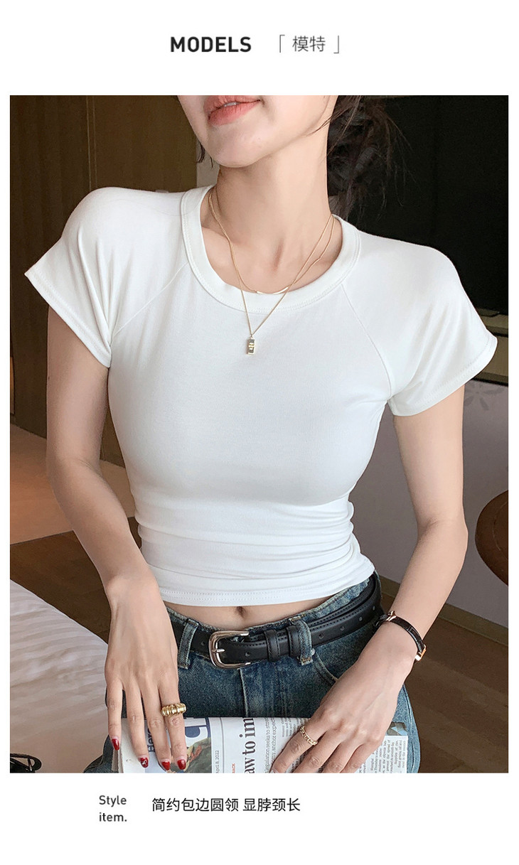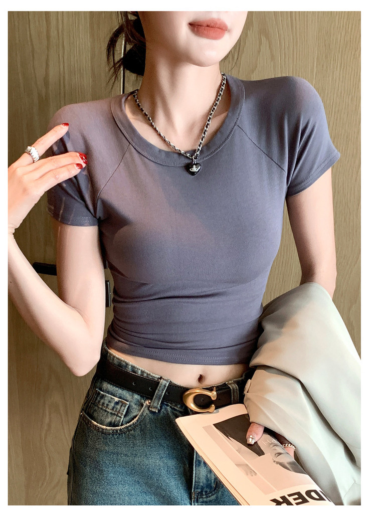 买1送1 夏季辣妹紫色设计感修身显瘦款上衣插肩袖圆领正肩短袖T恤女