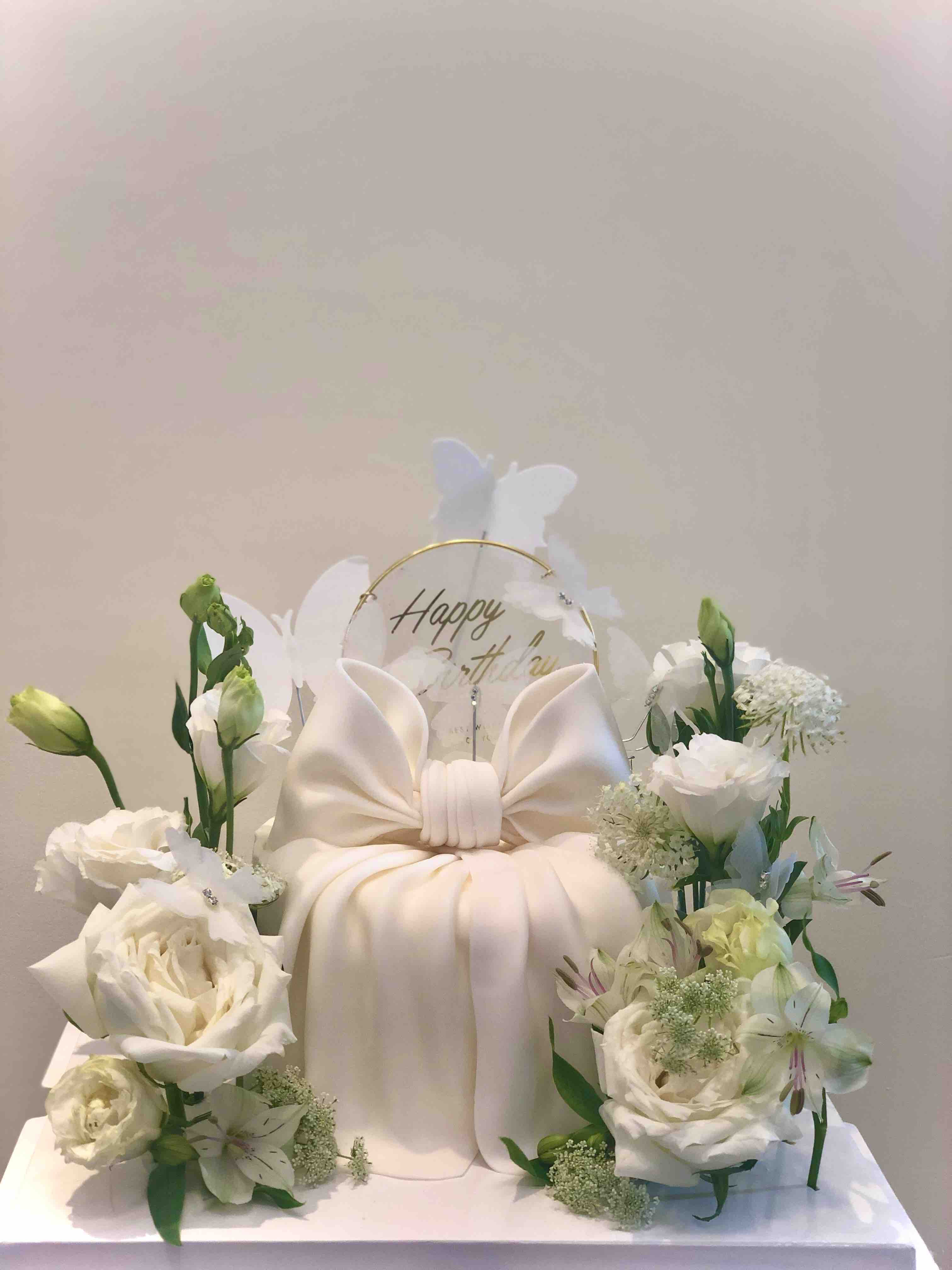 鲜花半翻糖蝴蝶结蛋糕(1.5磅。鲜花按当天买到的鲜花随机,以白色搭配为主)