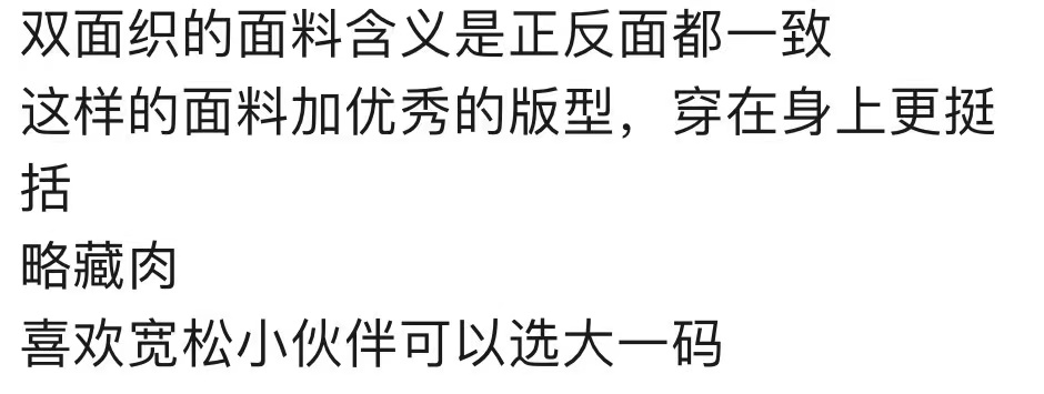 桑蚕丝、棉 、再生纤维素(莫代尔) 三种原料经过反复再反复的测试才确定配比,辅以te殊工艺制作出具有凉感、免烫、速干的面料属性。实打实的优ZHI原料,以棉的属性来加持丝的体感,拥有丝的奢滑、凉感和棉的透气、吸汗,是众多奢牌的基础T才会用到的WANG牌殿嘡级面料!