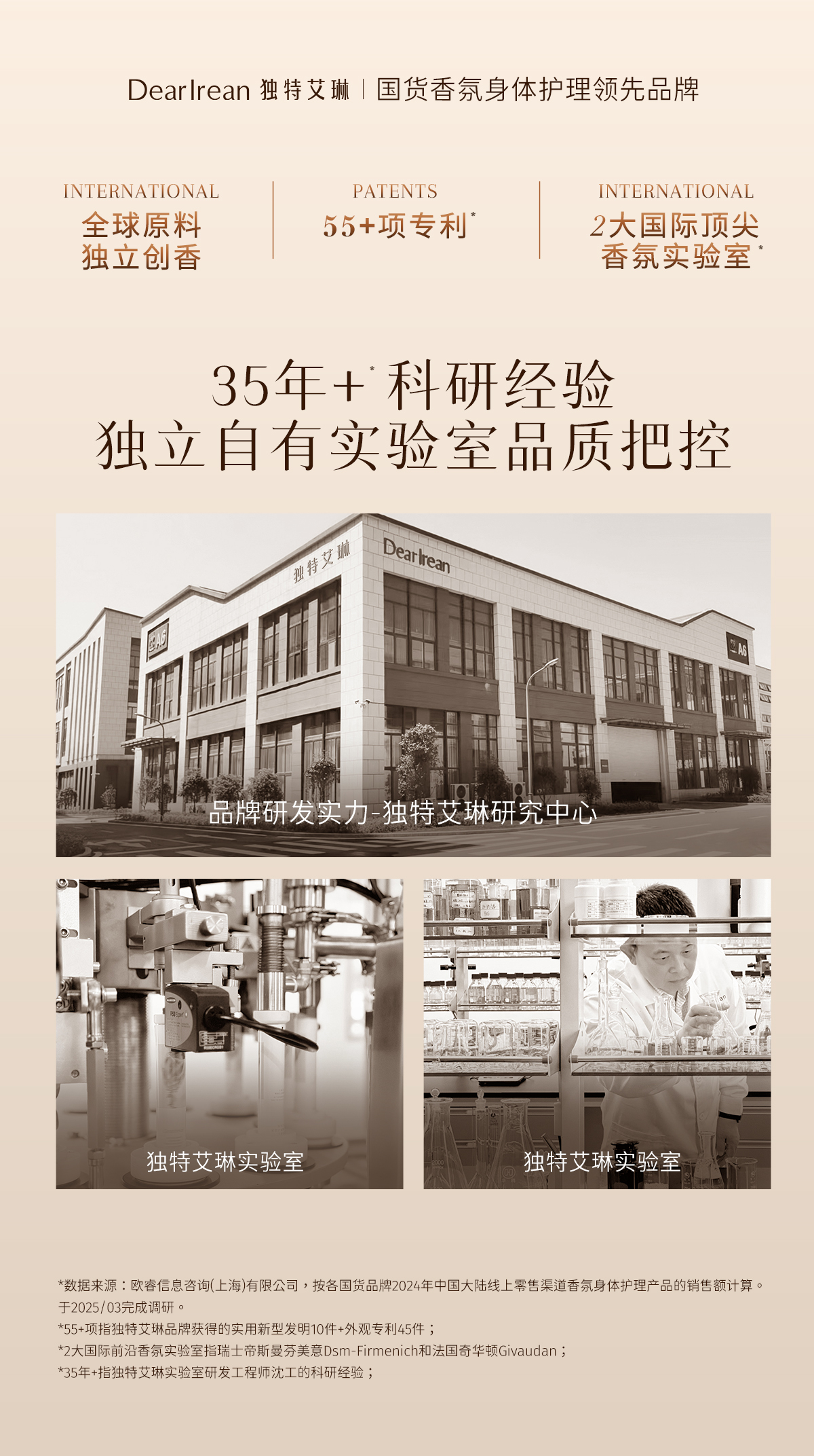 - DearIrean 独特艾琳,高定香氛生活品牌,拥有体•研究所,品牌致力于将高定香氛带入生活,同时倡导“以香之名,带给生活美好方式”的品牌理念,传递精致女性的爱、独立、自信。