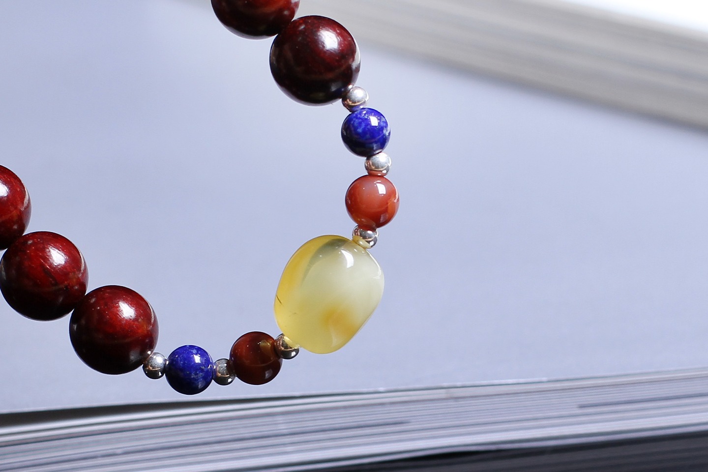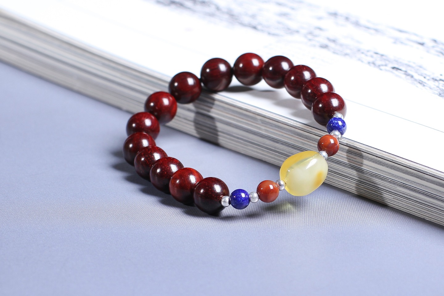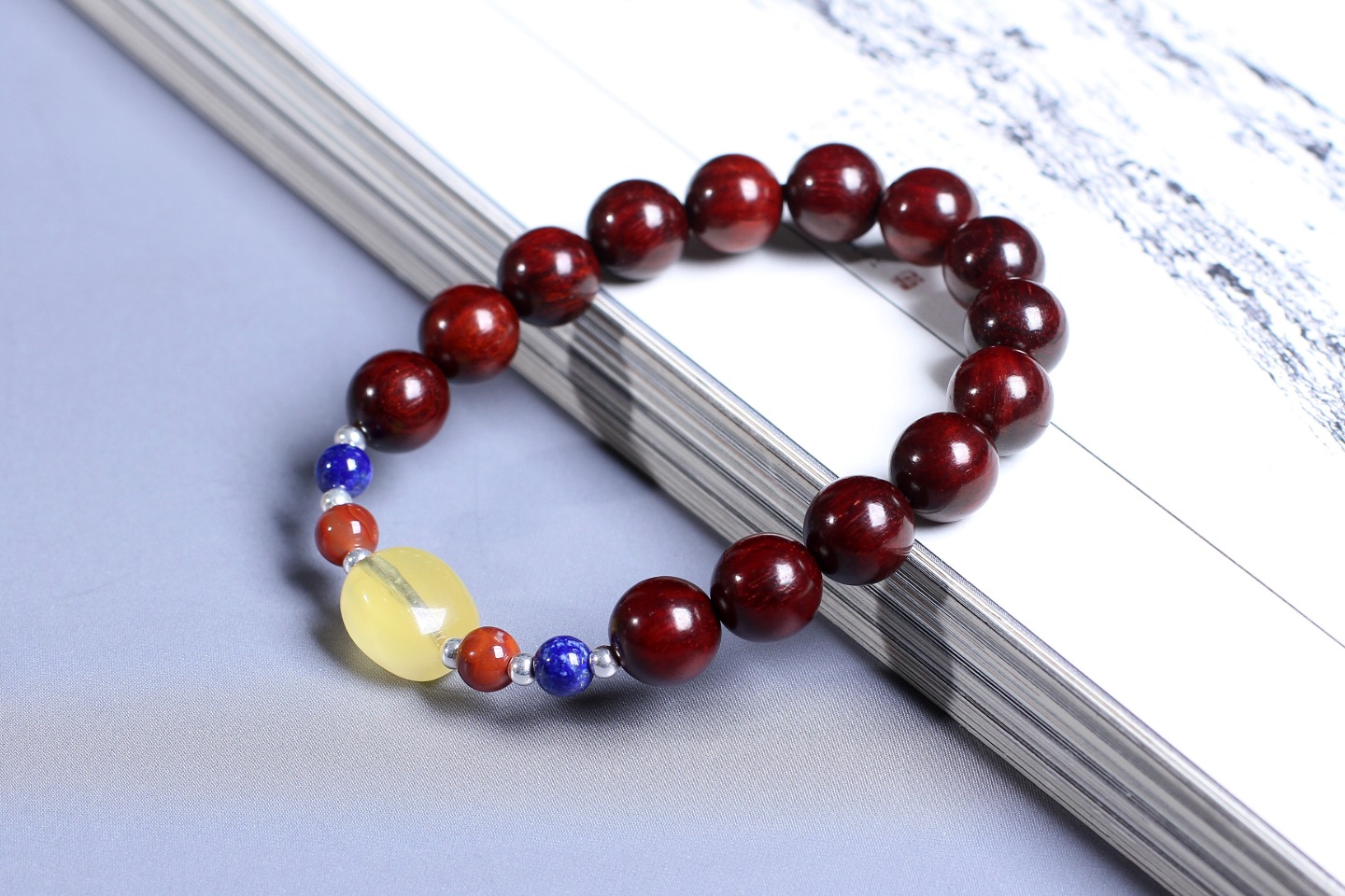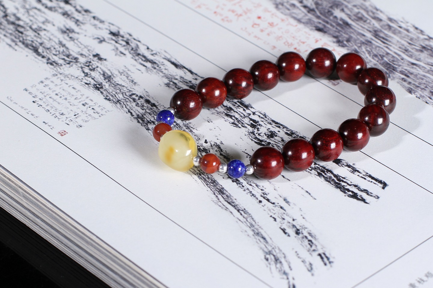 搭配:印度小叶紫檀为主,搭配银珠,原矿青金,南红,蜜蜡随型桶珠