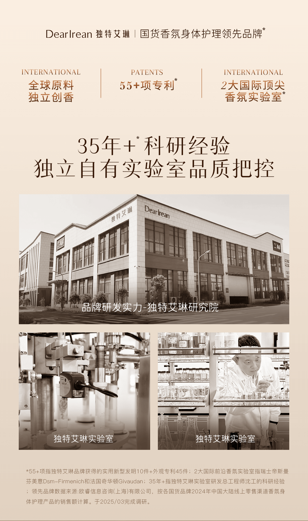 - DearIrean 独特艾琳,高定香氛生活品牌,拥有体•研究所,品牌致力于将高定香氛带入生活,同时倡导“以香之名,带给生活美好方式”的品牌理念,传递精致女性的爱、独立、自信。