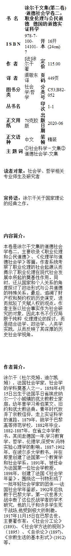 涂尔干文集(第二卷)·道德社会学卷二:职业伦理与公民道德 德国的道德实证科学 商务印书馆