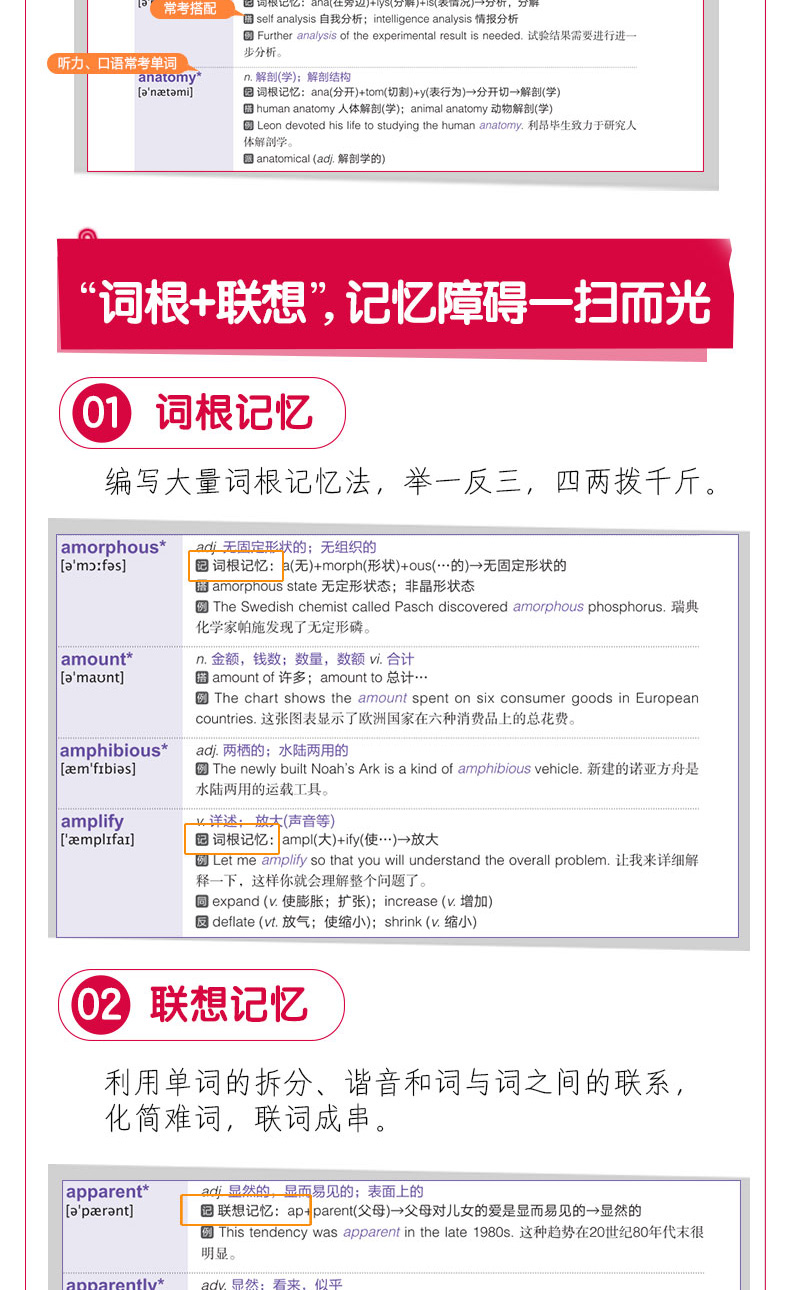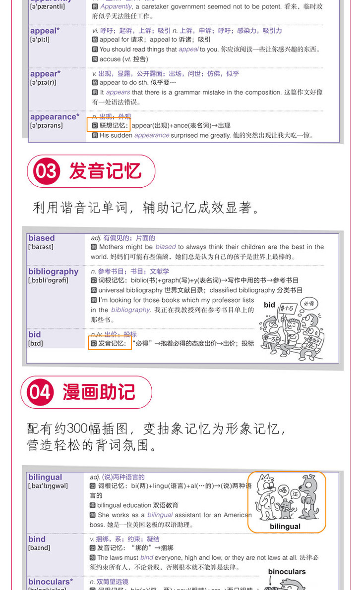 本书以“词根+联想”记忆法为主,辅以真题例句和与真题难度相当的例句,帮助考生结合语境记单词。同时,本书配有生动幽默的漫画插图,将原本枯燥的单词记忆变得轻松、有趣。
