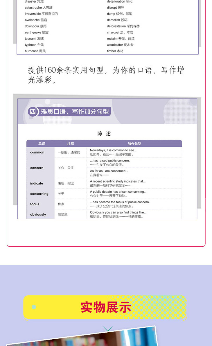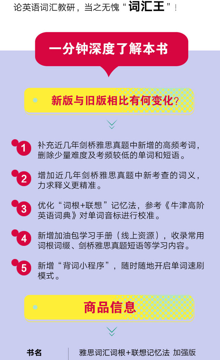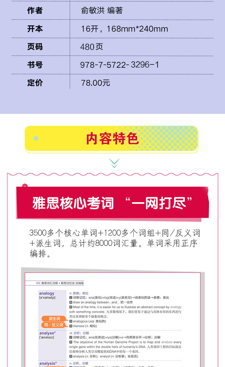 《雅思词汇词根+联想记忆法 加强版》收录3500多个雅思核心单词及1200多个核心词组,提供大量同义词、反义词和派生词,全书总计*8000词汇量。所有单词按照从a到z的字母顺序正序编排。