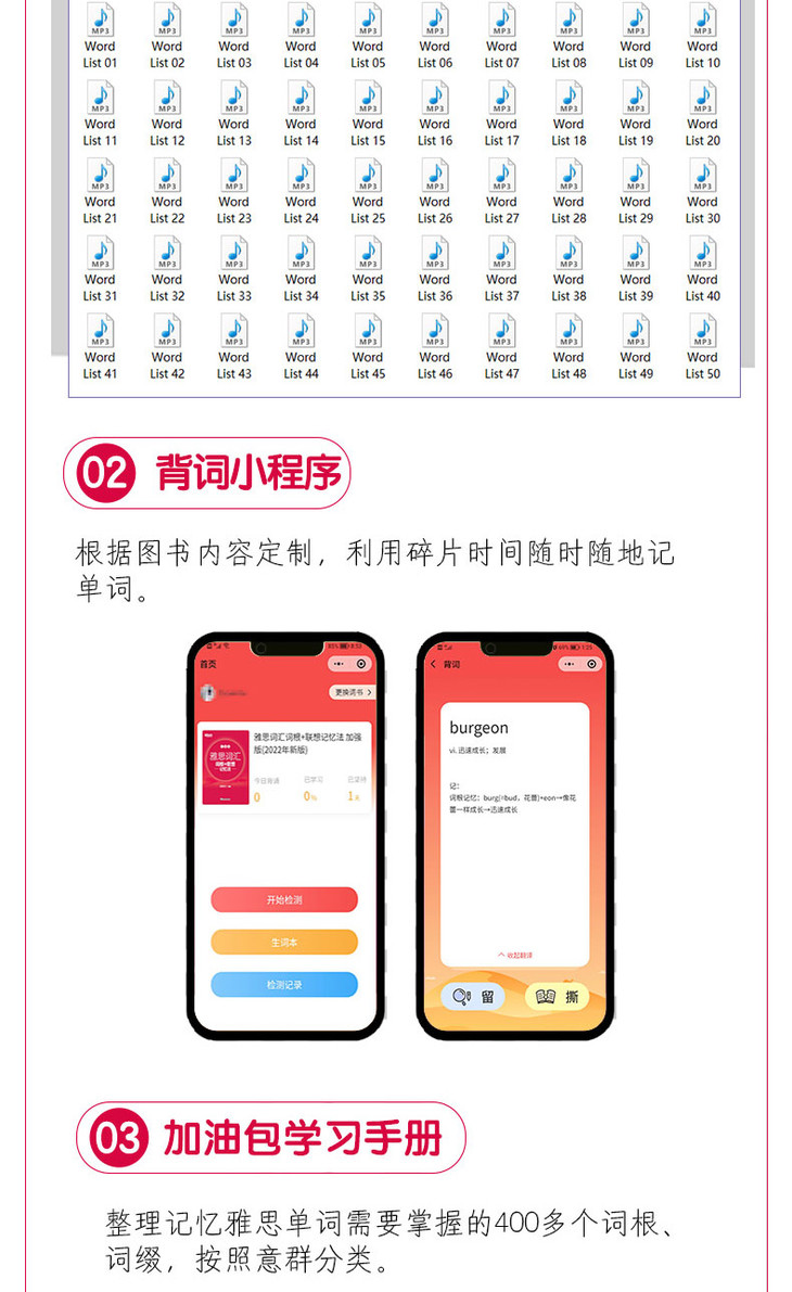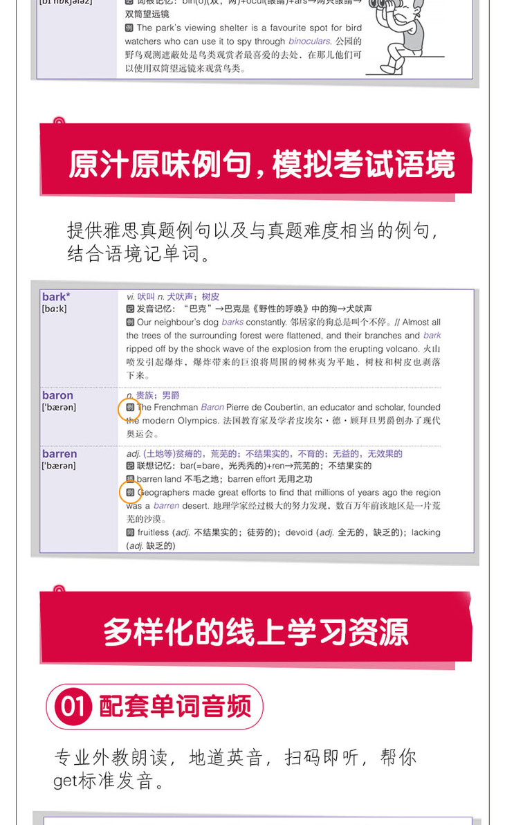 本书提供丰富的线上学习资源,包括配套音频、加油包学习手册、背词小程序,全方位、立体化地助力雅思备考。其中加油包学习手册收录400多个常见词根、词缀,2000余条剑桥雅思真题短语,800多个雅思听力、阅读分类词汇,160余条雅思口语、写作加分句型等实用的学习资料,帮助考生拓展词汇学习的深度和广度。