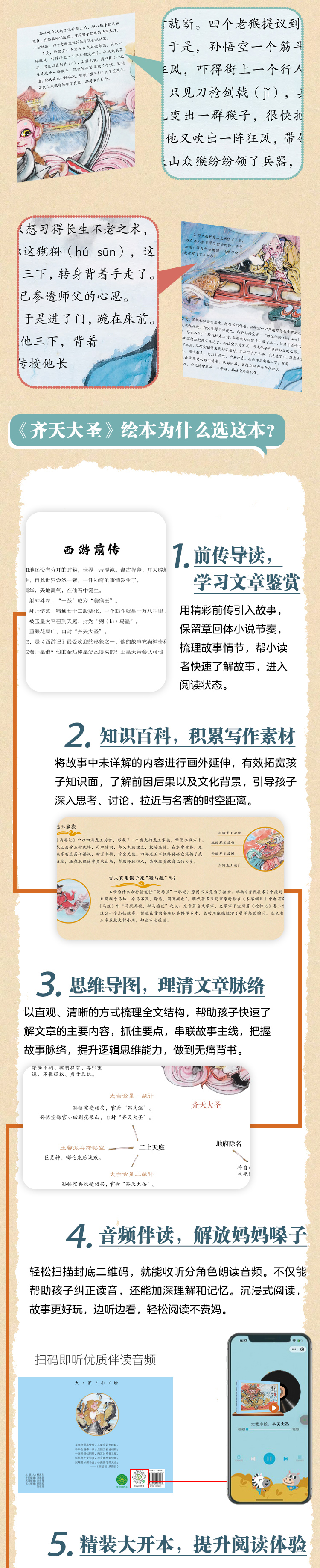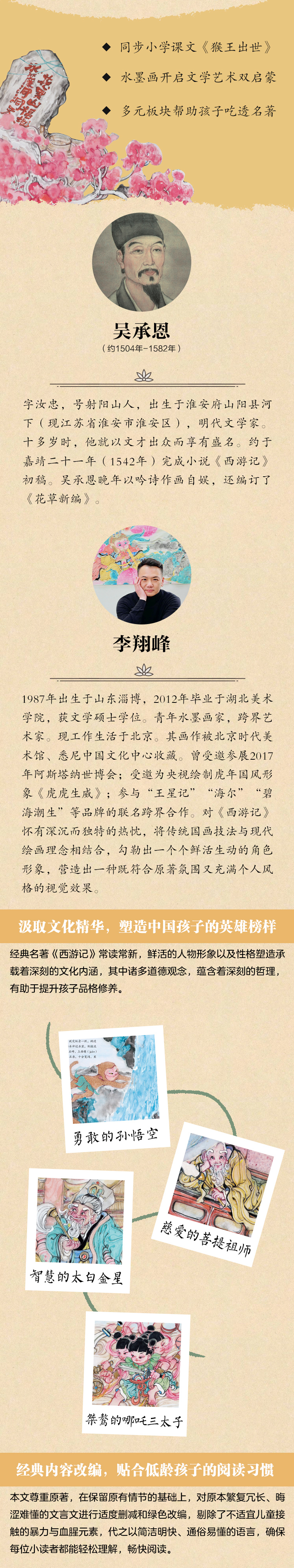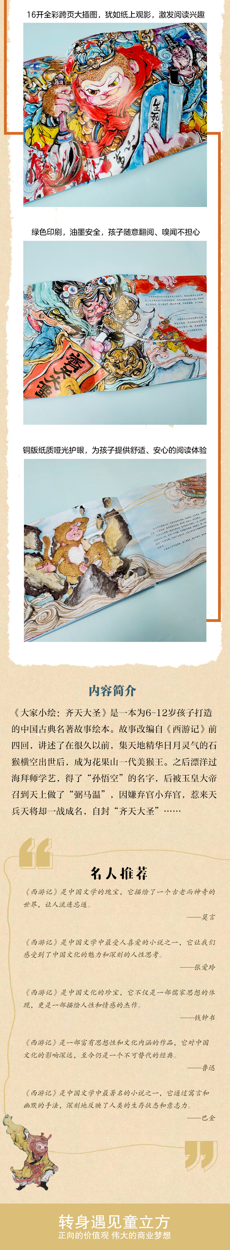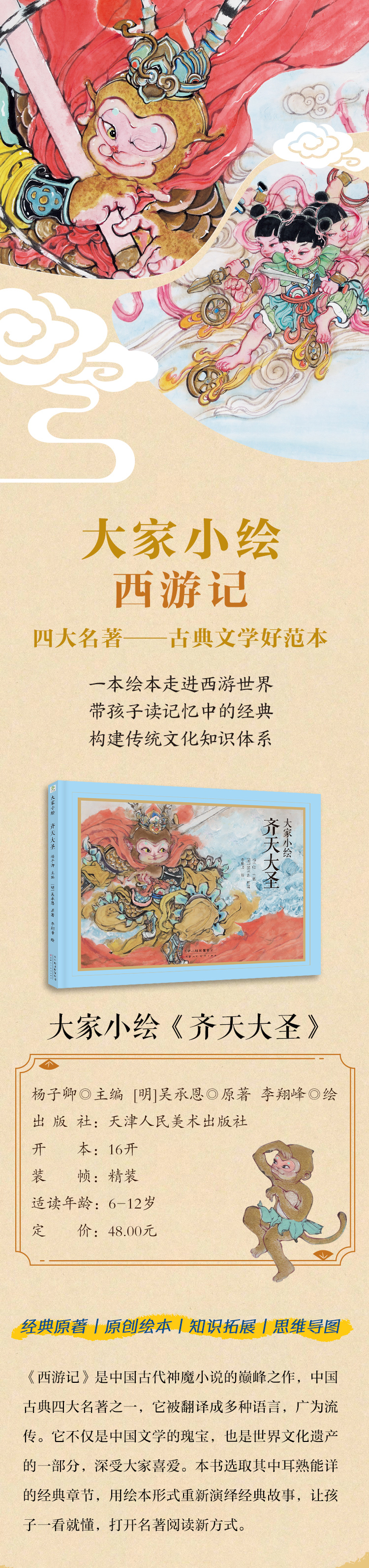 《大家小绘:齐天大圣》是一本为6-12岁孩子打造的中国古典名著故事绘本。故事改编自《西游记》前四回,讲述了在很久以前,集天地精华日月灵气的石猴横空出世后,成为花果山一代美猴王。之后漂洋过海拜师学艺,得了“孙悟空”的名字,后被玉皇大帝召到天上做了“弼马温”,因嫌弃官小弃官,惹来天兵天将却一战成名,自封“齐天大圣”……