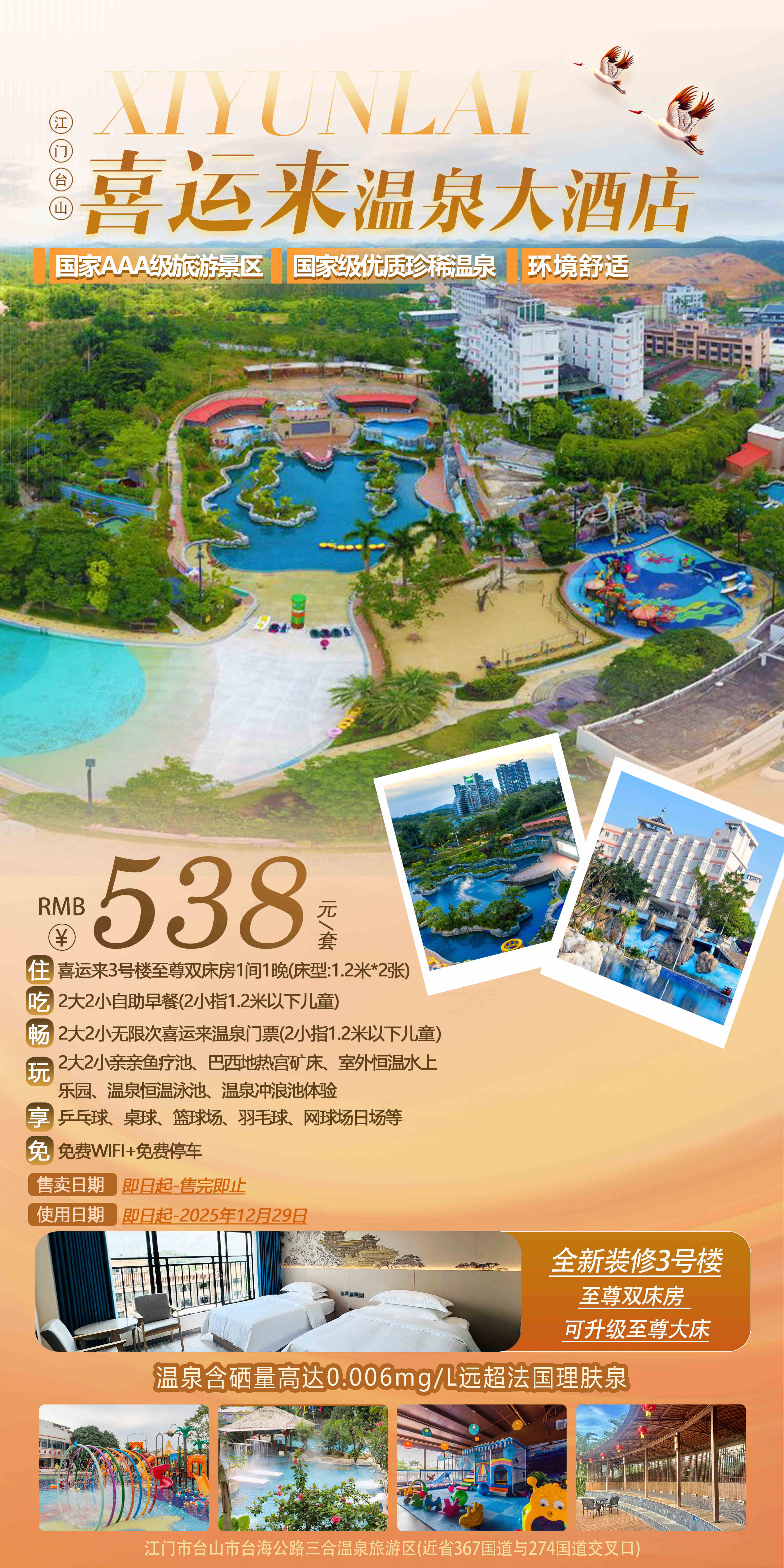 台山·喜运来温泉大酒店丨538元入住至尊双床房,享2大2小自助早餐+无限次珍稀富硒温泉~