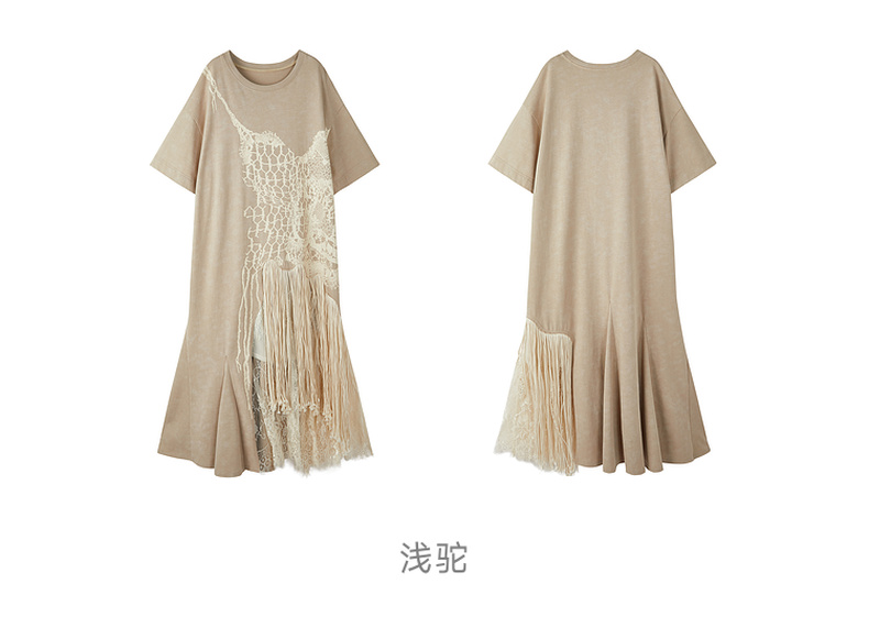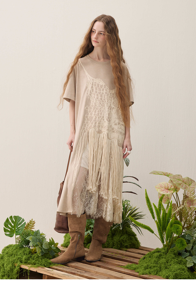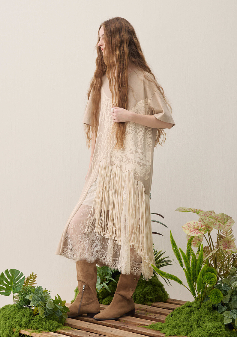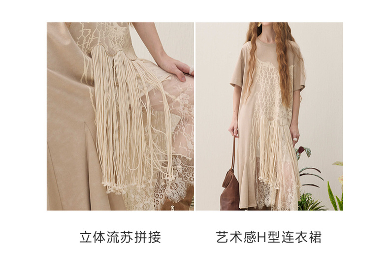 谜底连衣裙短袖2026年春季新品复古蕾丝流苏拼接度假女261ML0026