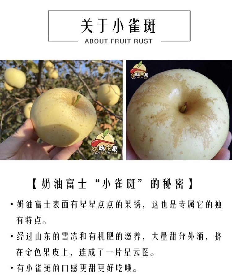 【奶油苹果】第⑨季 天生土豪金👏,果香脆甜多汁品质优秀 不打蜡 ⭕不施农药 ⭕自然生长⭕ 比红富士晚熟一个月,口感更佳 自带奶油香气,果肉绵密香脆 一口咬下去,还有淡淡的奶油香气。