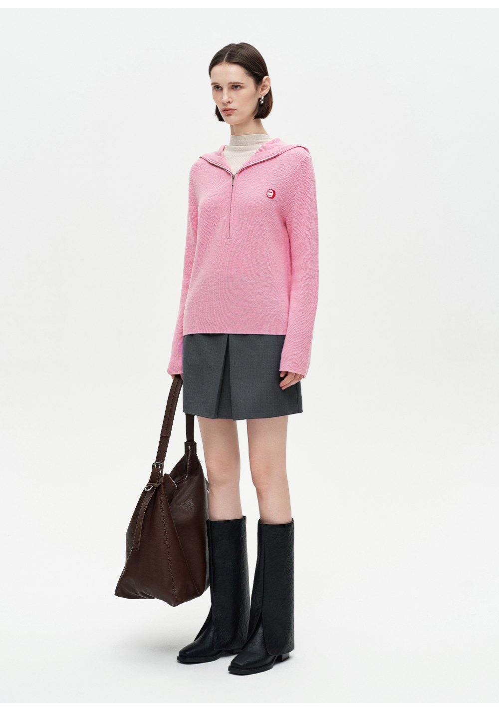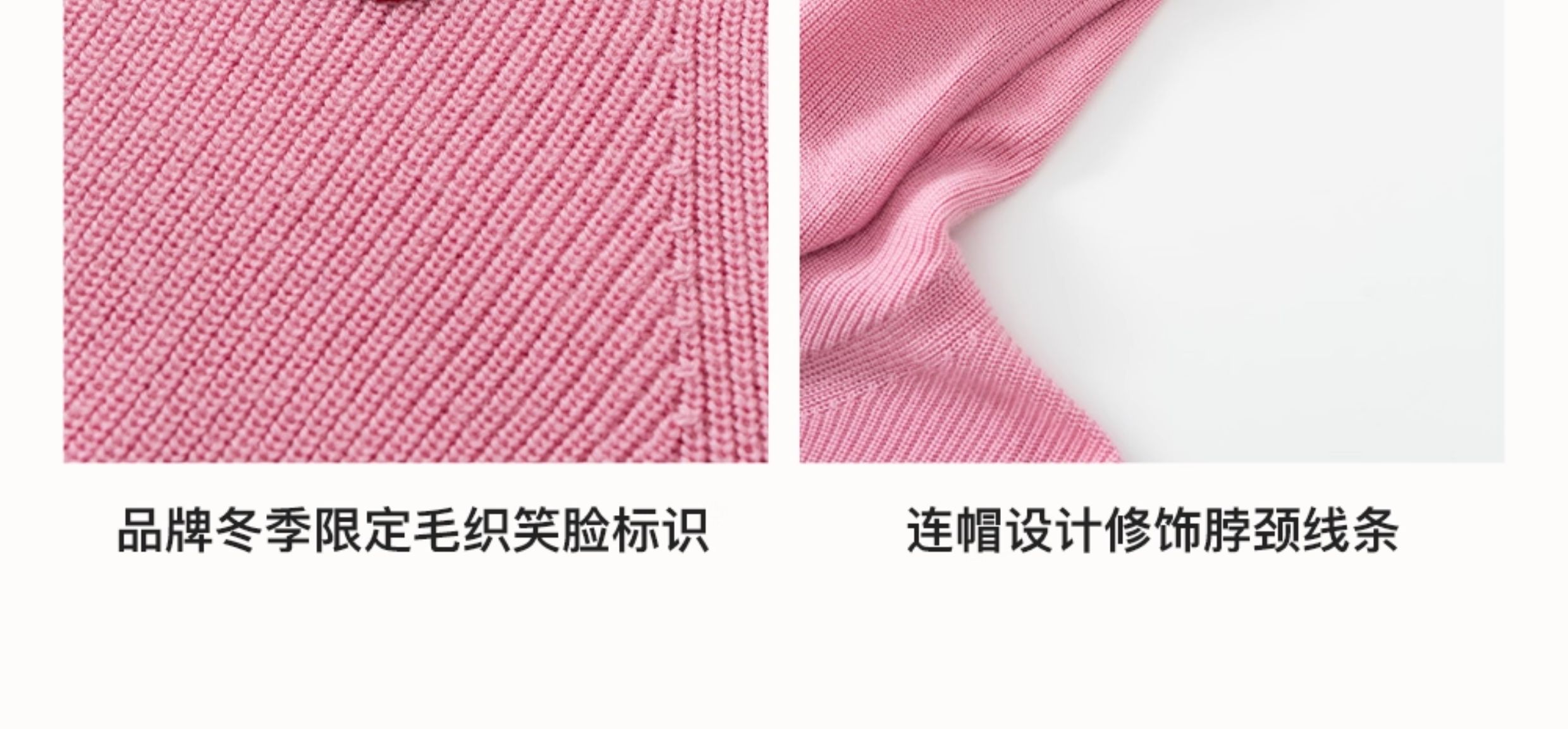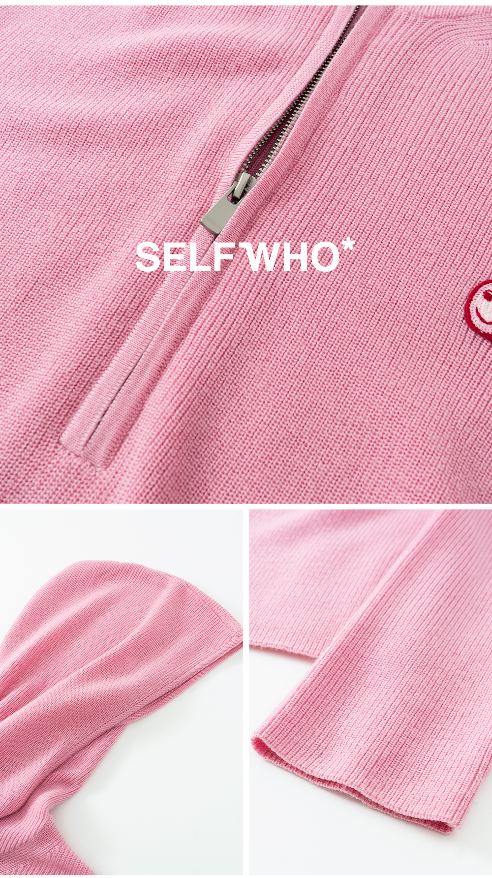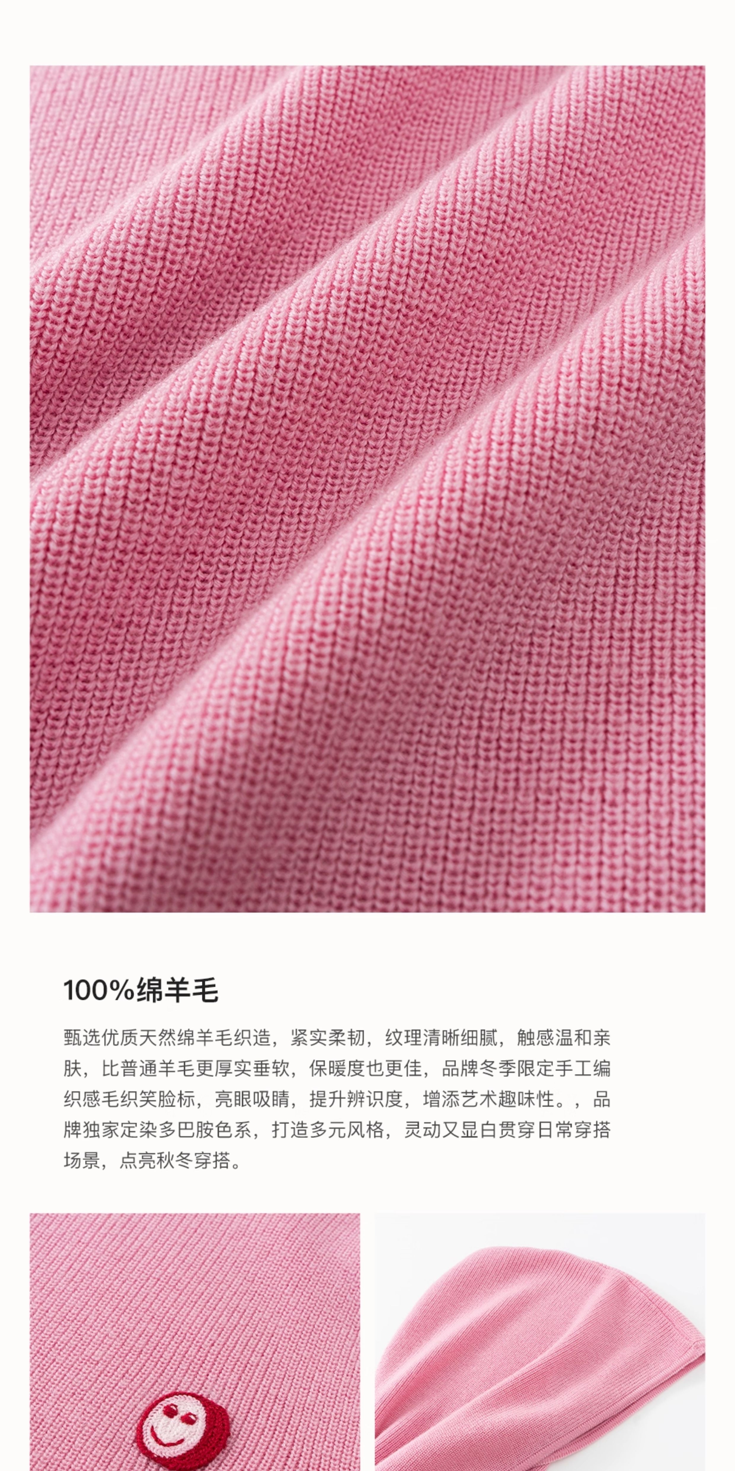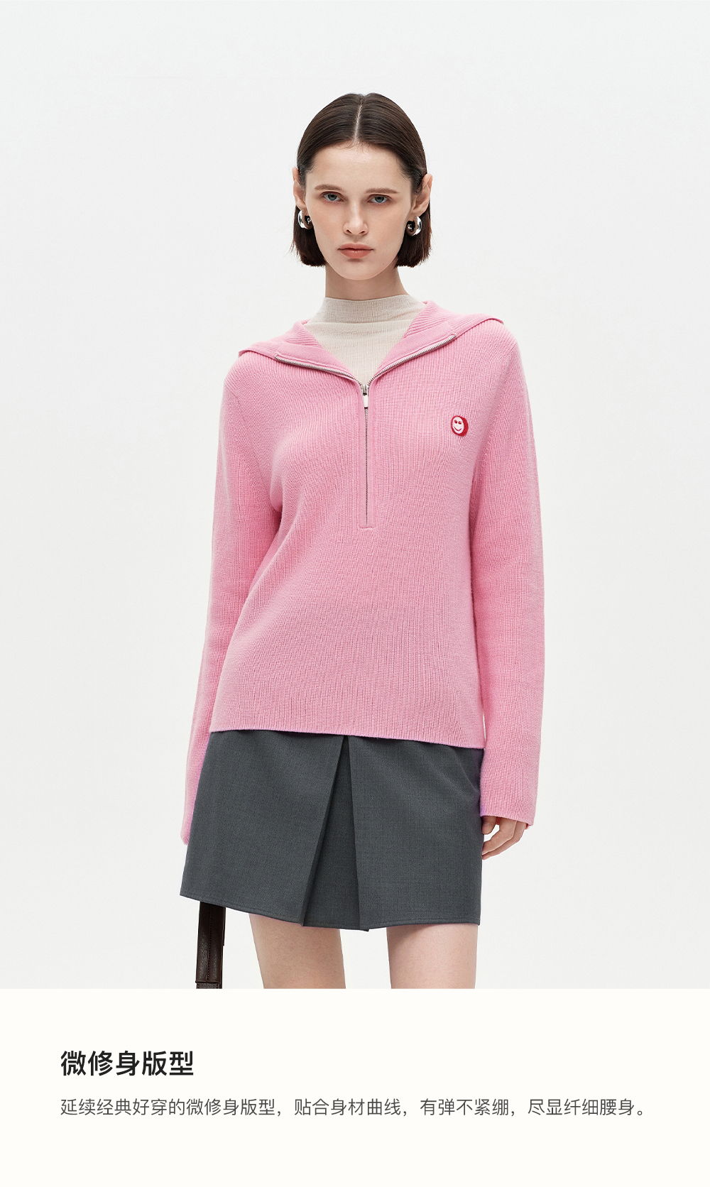 SELFWHO100%绵羊毛半拉链笑脸针织衫女2026春新款毛织连帽衫上衣